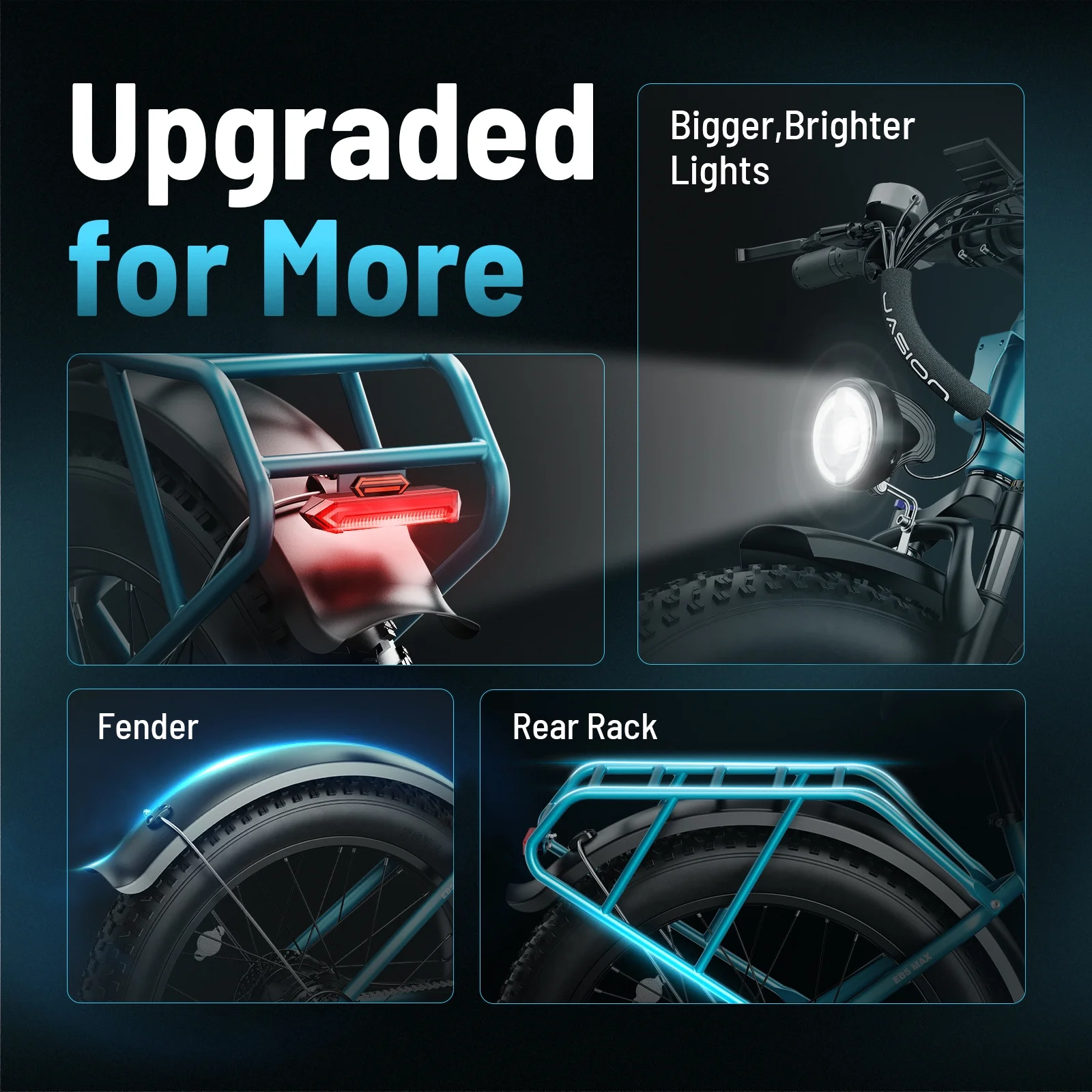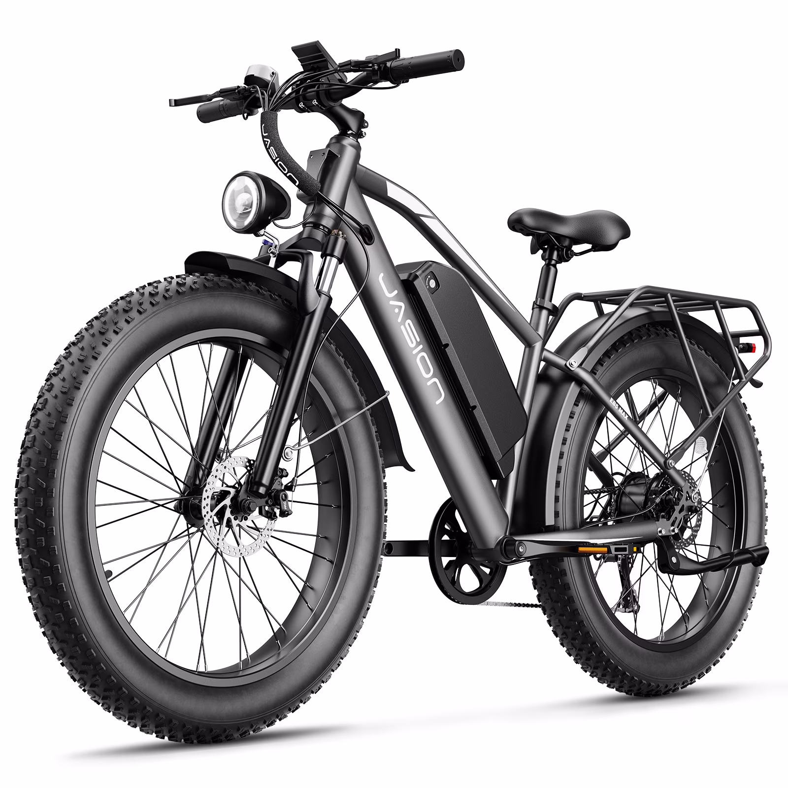 🚴♂️ALL-TERRAIN TIRES - Equipped with 26" x 4.0 puncture-resistant fat tires, this Jasion electric bicycle provides exceptional grip and stability on sand, mud, gravel, and wet roads. The lockable suspension fork absorbs shocks and enhances comfort during rides, while 180 mm dual disc brakes deliver strong and reliable stopping power.