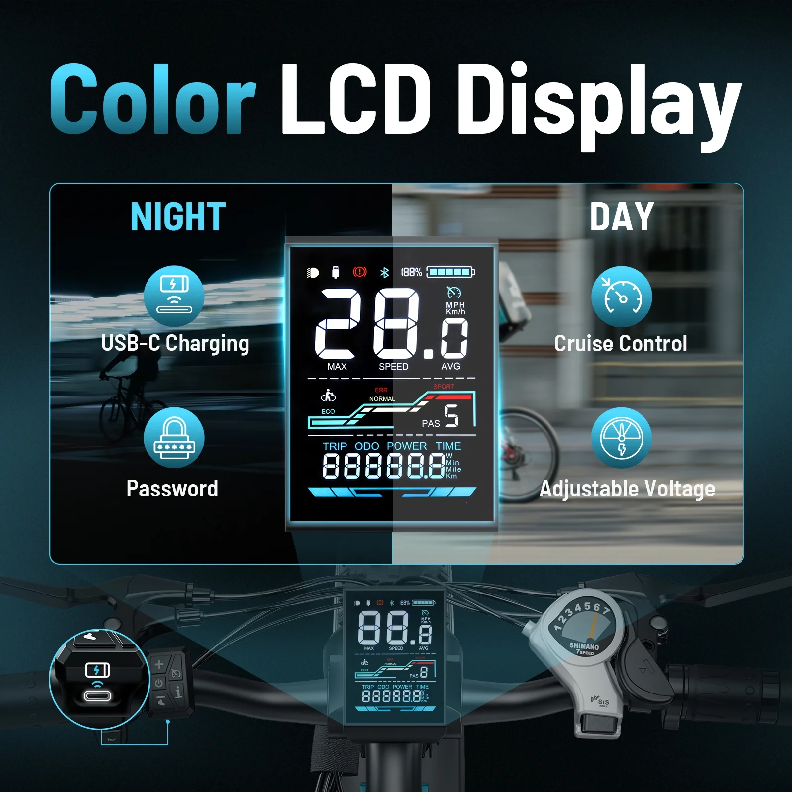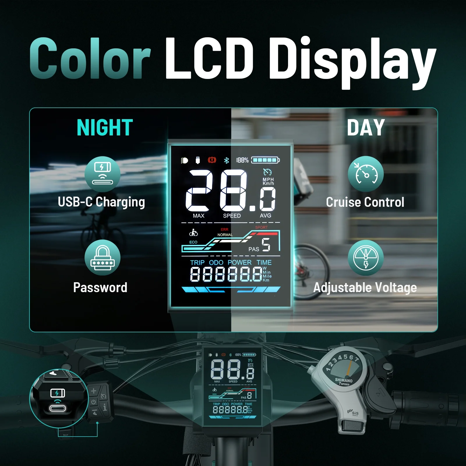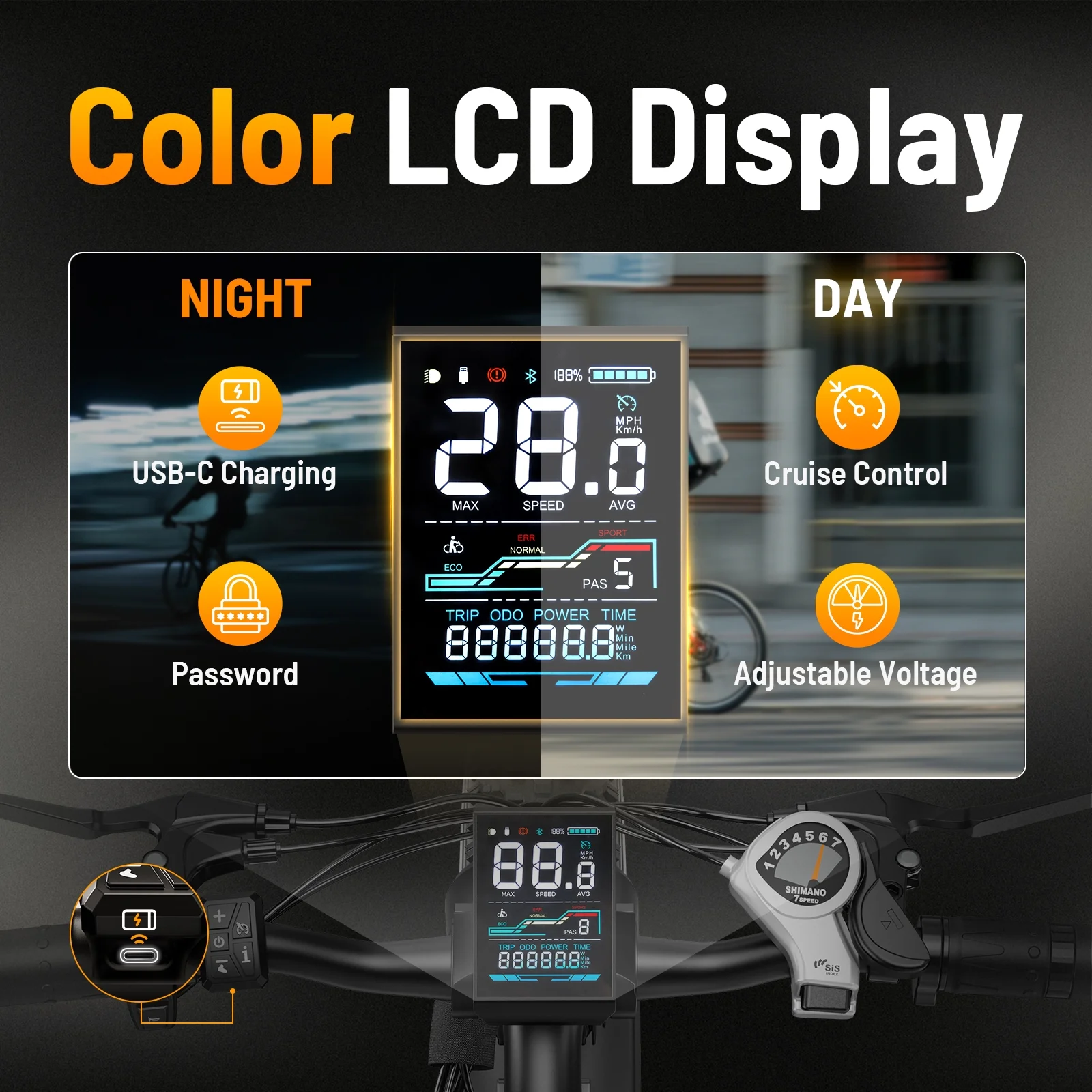 🚴♂️ENHANCED VISIBILITY AND UTILITY - The vibrant color display on this adult electric bicycle offers clarity and convenience, showing real-time stats like speed, mileage, and battery levels,and more at a glance. With built-in cruise control, long-distance rides become effortless. You can also use the USB charging port under the display to charge your mobile phone, making your travel more convenient.