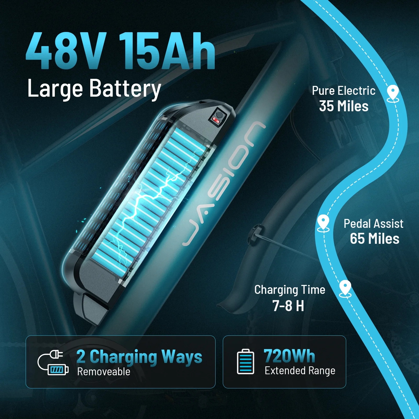 🚴♂️LARGE CAPACITY 720Wh BATTERY - Featuring a powerful 48V 15AH battery, this EB5 MAX ebike can last up to 65 miles on assist and 35 miles on throttle. Removable and lockable battery design ensures ultimate convenience and security, whether charging at home or on the go.