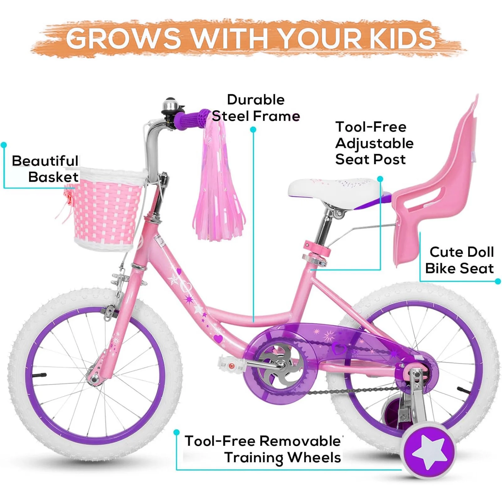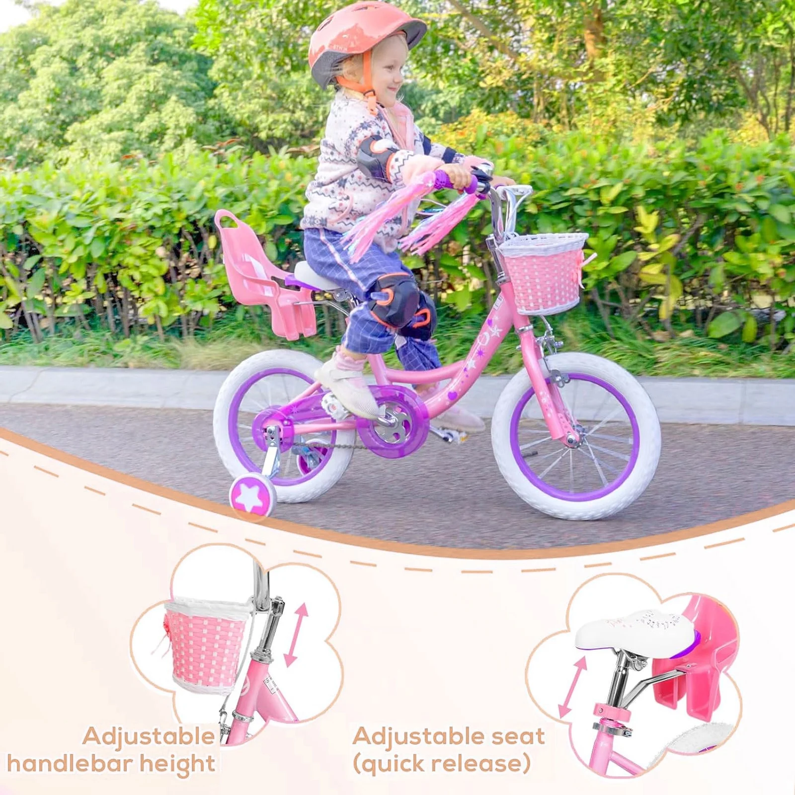 Perfectly designed for kids ages 3 to 5, Hykolity 14" Girls Bike makes learning to ride a fun and exciting experience. The lightweight frame and removable training wheels provide extra balance, helping young riders build confidence. With both a handbrake and coaster brake, stopping is easy and safe. The durable high-carbon steel frame, anti-slip tires, and enclosed chain guard offer added protection while ensuring smooth performance. Plus, the adjustable seat and handlebars grow with your child, making this bike a long-lasting companion for countless adventures.