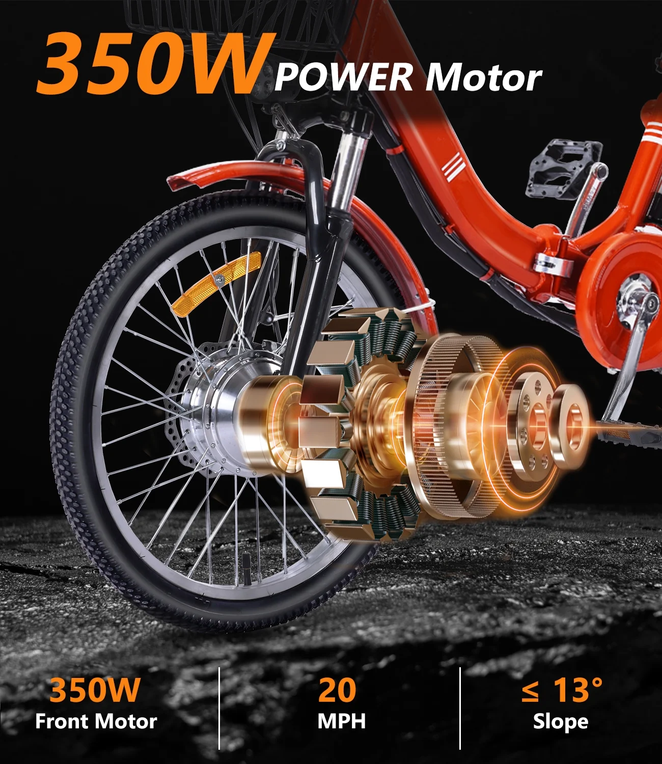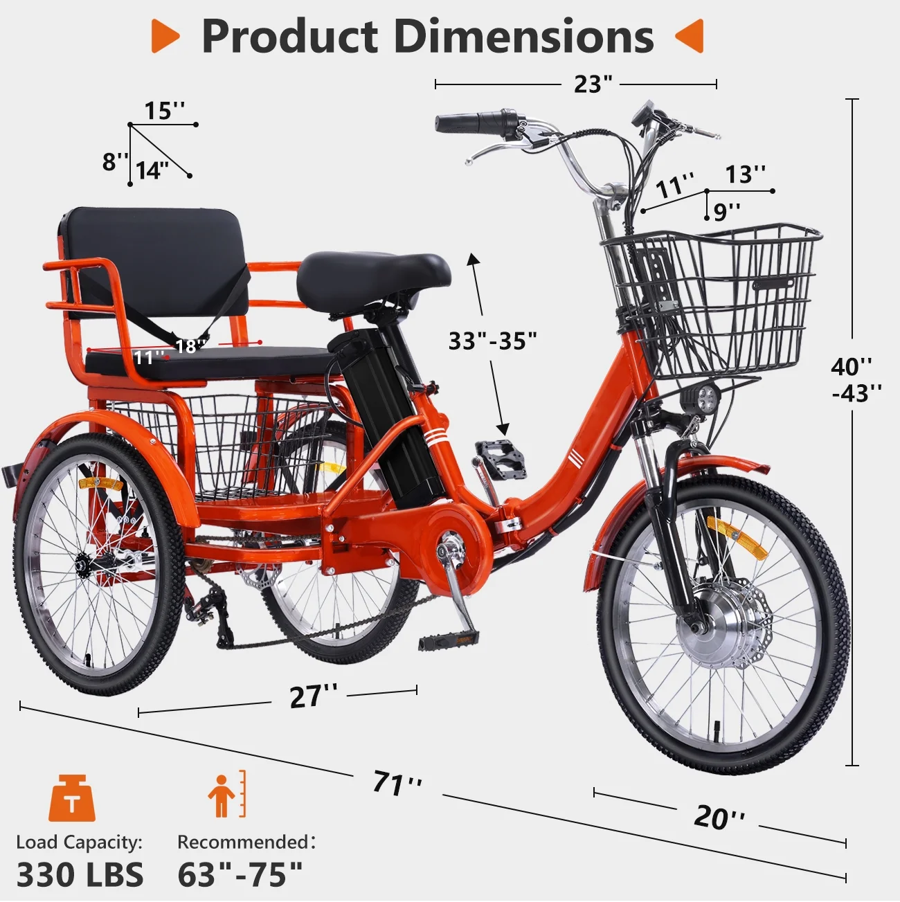 NOMIGO Electric Tricycle for Adults Folding Electric Trike 3 Wheel Electric Trike with Two - Seater Large Basket Super Powerful Brushless 350W Motor 48V13AH Lithium Battery Max 20MPH E - Tricycle Orange