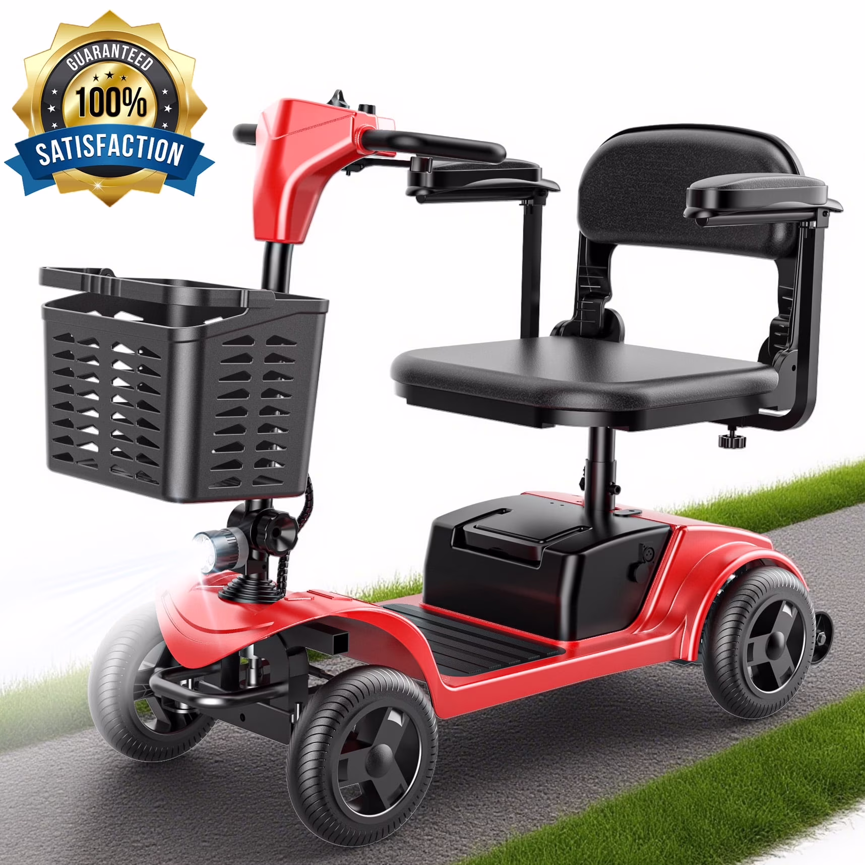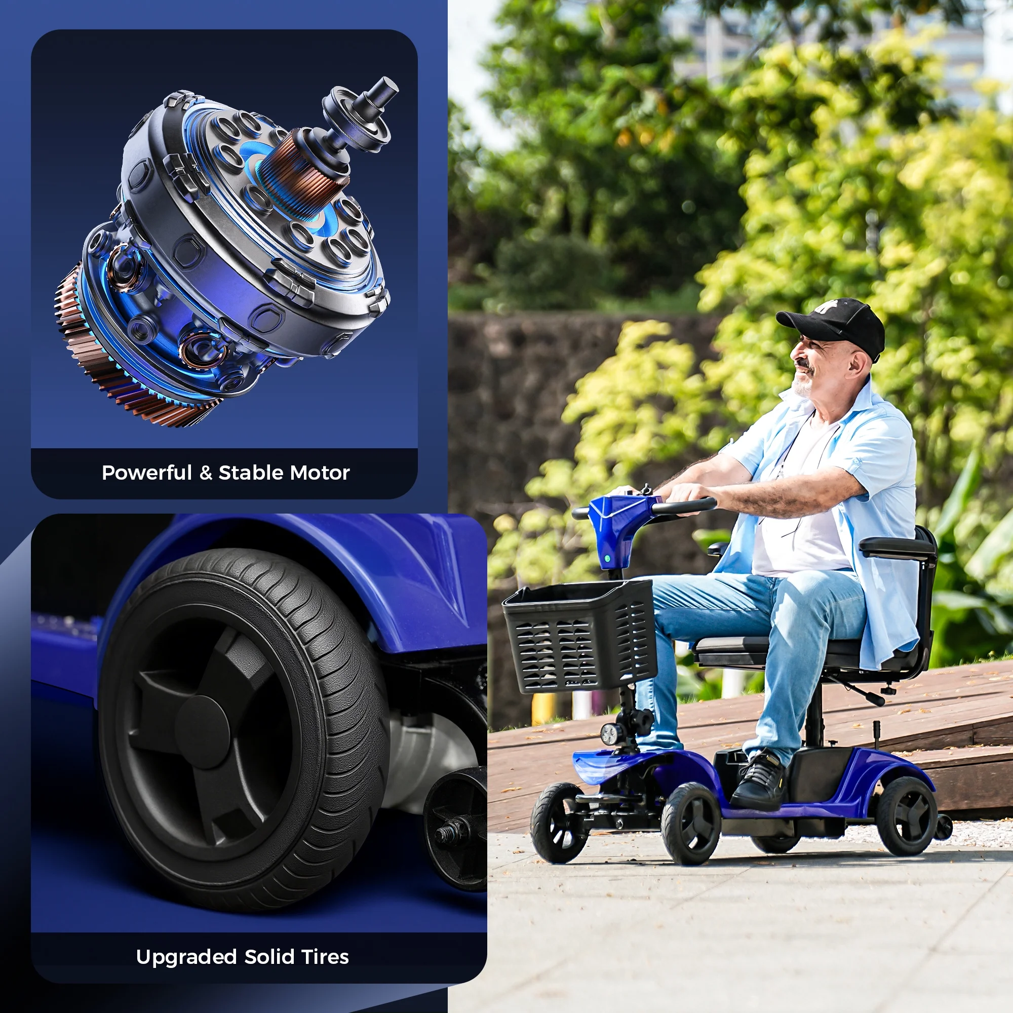 8' Anti-skid Tires & Anti-tilt Design - Upgraded solid tires are more stable and safe, anti-skid and wear-resistant; You may have worried that the mobility scooter will tilt back uncontrollably when you go uphill and result in a rollover, rest assured that we have equipped the rear of the chassis with anti-tilt wheels to reduce the probability of such accidents, which is ideal for safe driving in any road conditions on any terrain!