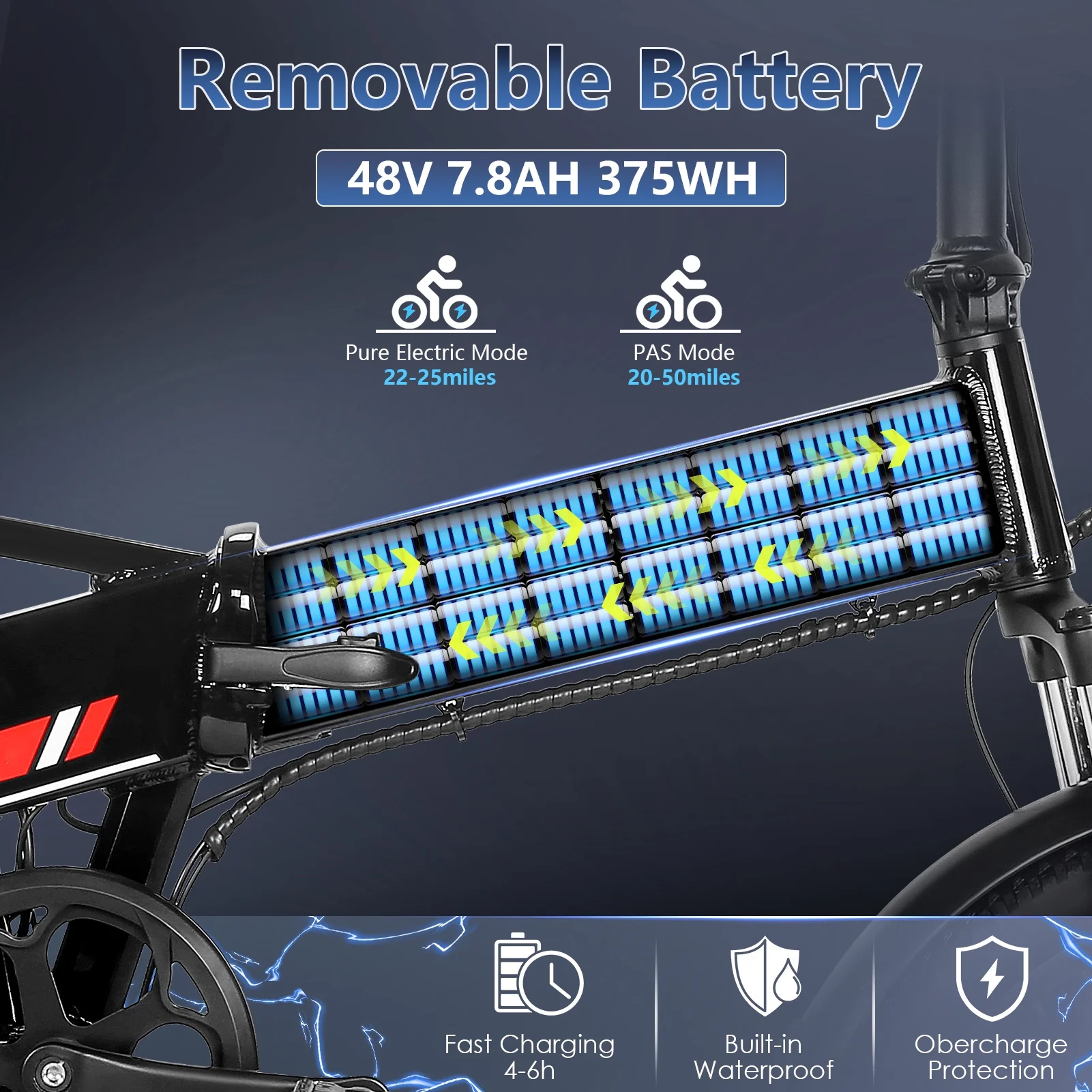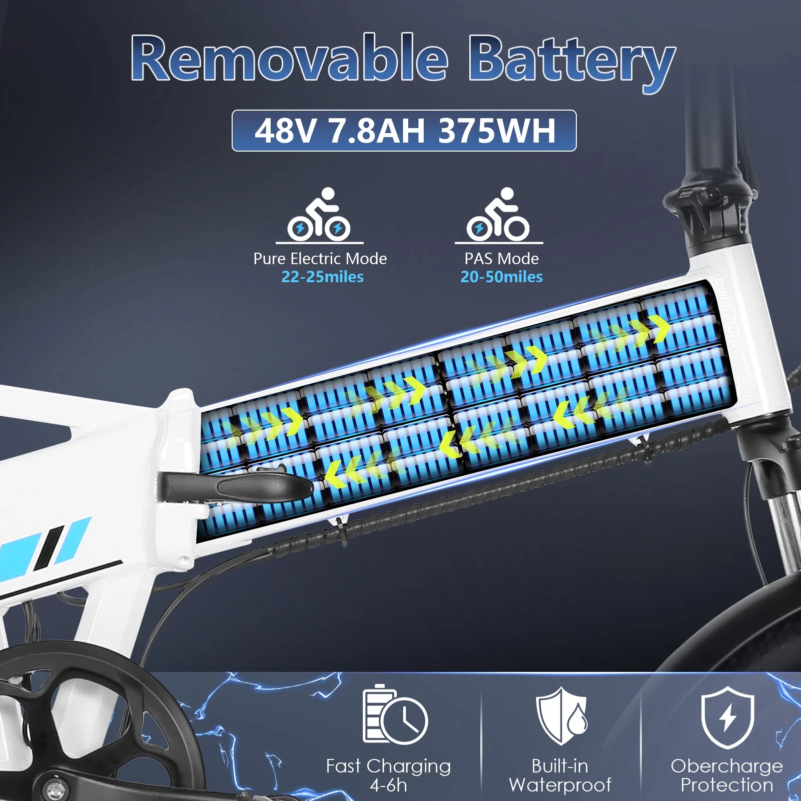 - 375Wh Built-in Removable Battery:The 48V 7.8Ah removable high-capacity battery (UL 2849 certified) offers up to 20-35 miles in pure mode and 35-50 miles in PAS mode.The built-in battery is stylish and secure, featuring IP65 waterproof and BMS protection for safe use in any weather, enhancing protection and convenience.