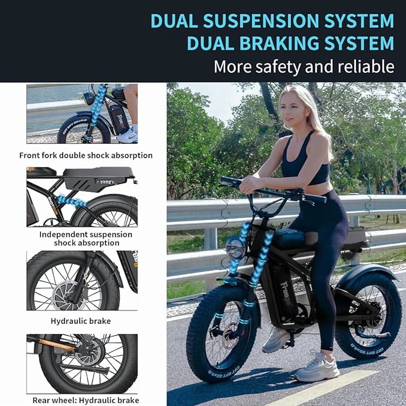 - 【Riding Comfortably & Safely】: The adult electric bicycle is designed with front and rear dual shock absorbers, ensuring a comfortable ride even on bumpy or uneven terrain, and front and rear hydraulic disc brakes for effective emergency braking, allowing for safe and confident riding. With a maximum load capacity of 400pounds, this e-bike is suitable for adult riders, provides up to 85-Nm of torque, can easily climb a 40° slope.