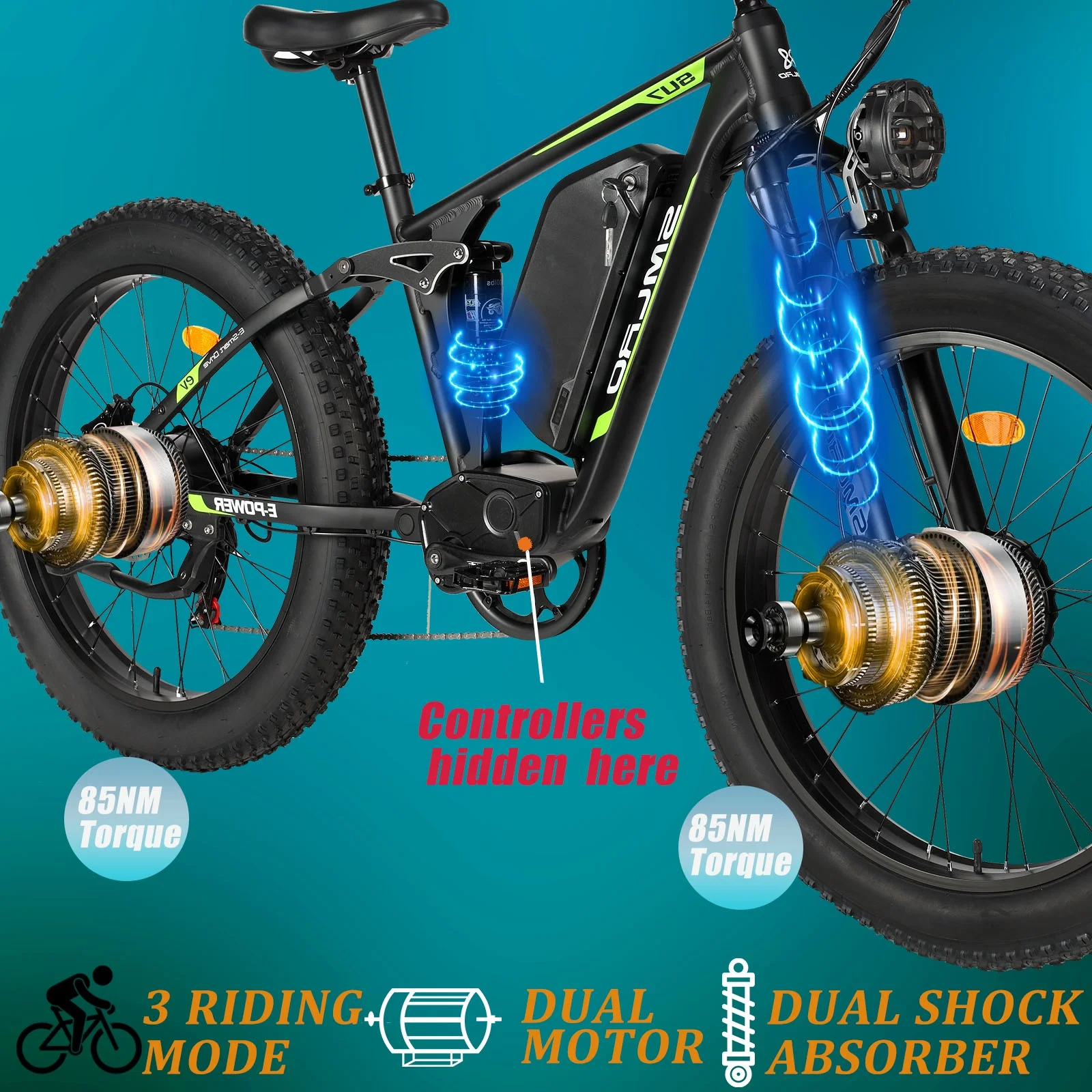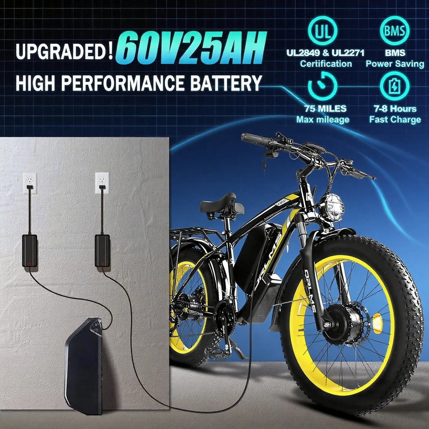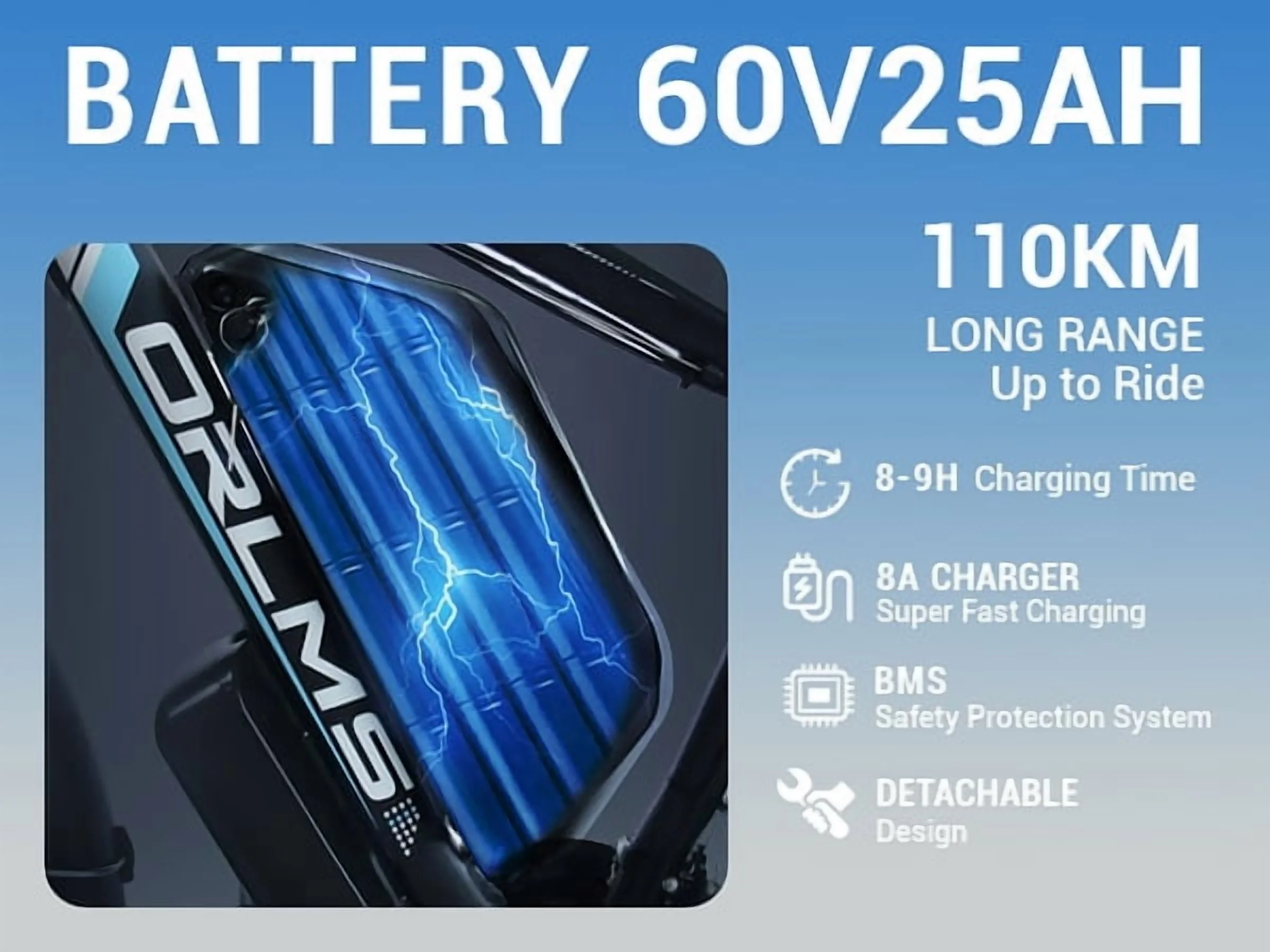- 60V 25AH Ultra-High-Capacity Battery:Equipped with an industry-leading lithium-ion battery (UL 2849 certified), this electric bike can reach up to 50 miles per charge, making it perfect for extended off-road adventures.