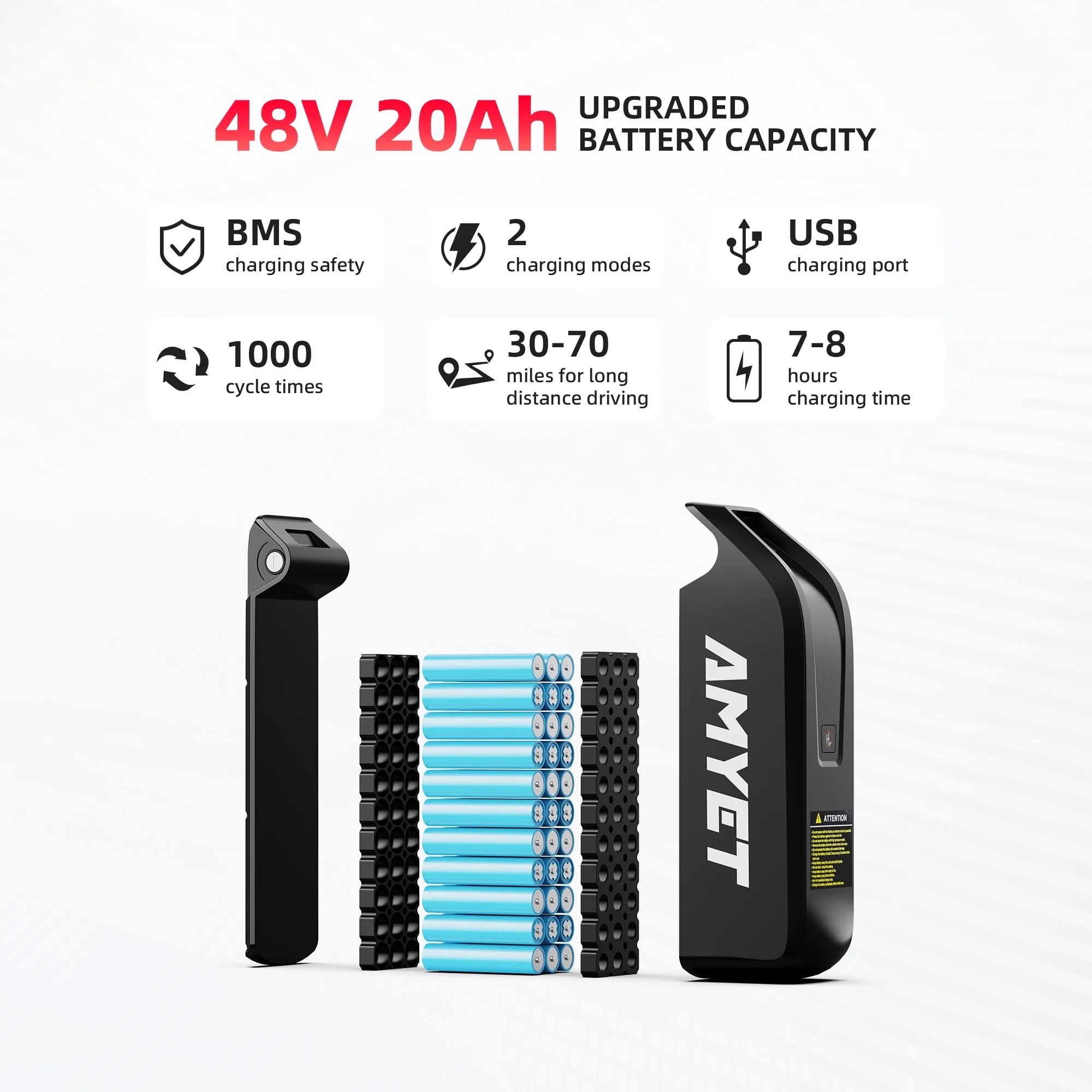 - Large Capacity 20AH Battery: 48V 20AH detachable battery for up to 30 miles in pure electric mode and 70 miles in pedal-assist mode, with 7-8 hours fast charging.