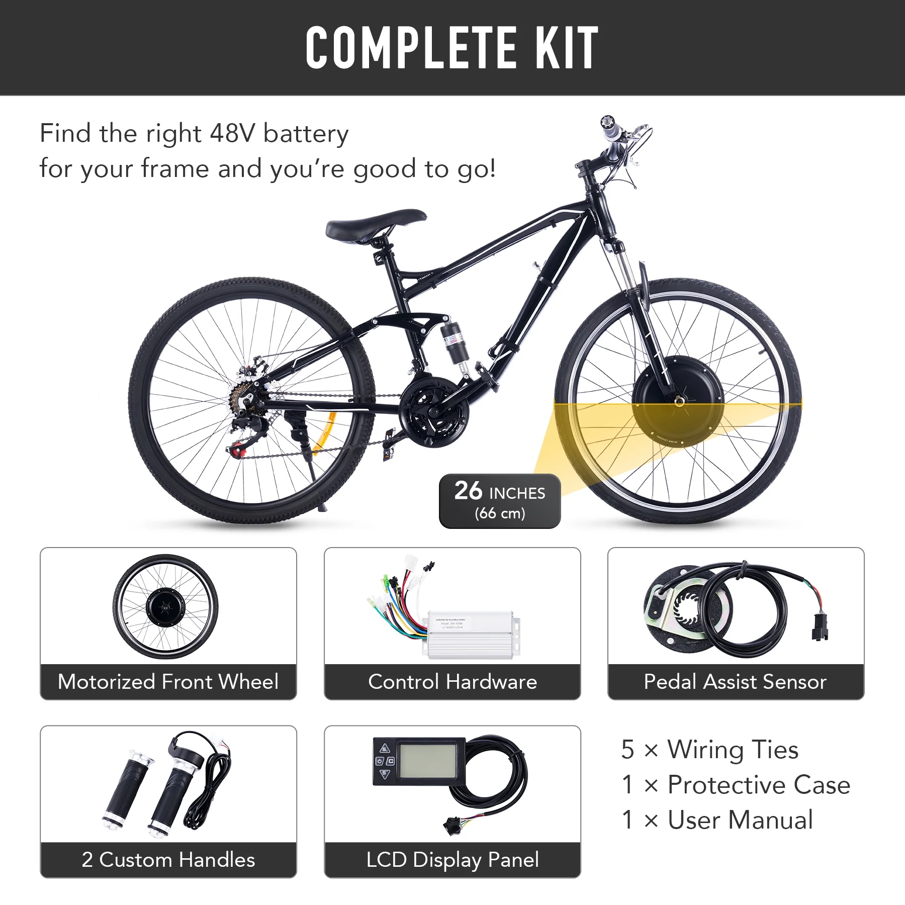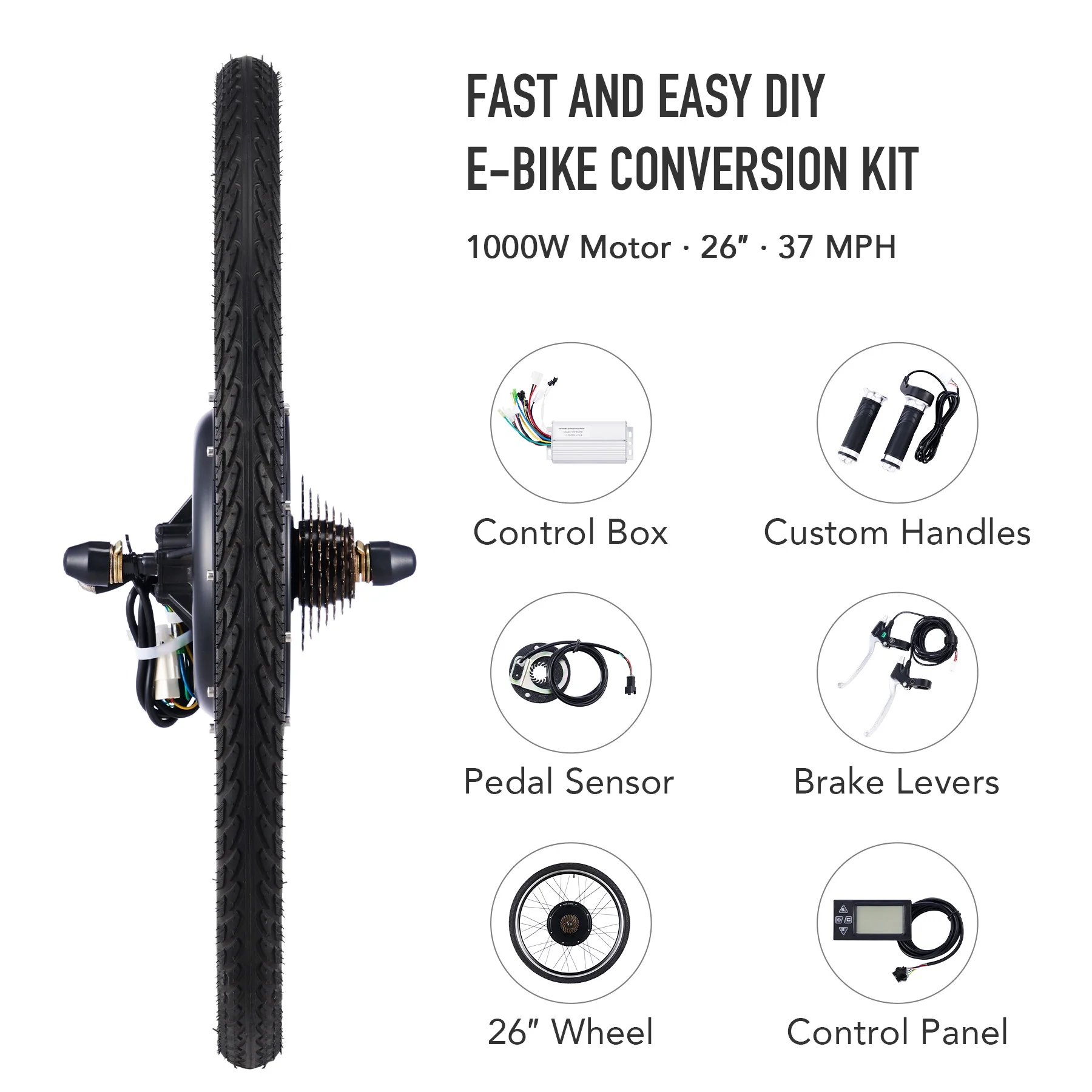 Get all the power and ease of an electric with the road or mountain bike you already know and love! Our ebike conversion kit will quickly convert any 26er into a cruise-control dream. This DIY bike set comes with a 1000W brushless hub motor, a 26" rear wheel and 26x1.75 tire, all the wiring needed to connect it to the 48V battery that best suits your frame (not incl.), and custom handles with an LCD panel to control and monitor everything as you go. Your speed, session and total distance, and battery power are all available at the push of a button. These bike accessories are preset to follow public speed limits but can also automatically shift from 7, 13, 19.5, 25.5, 33.5 mph. The pedal assist sensor lets you quickly switch between hybrid assisted pedaling and full electric moped mode. Climbing hills or speeding commute time, this all-in-one electric conversion kit is ready to improve your life!