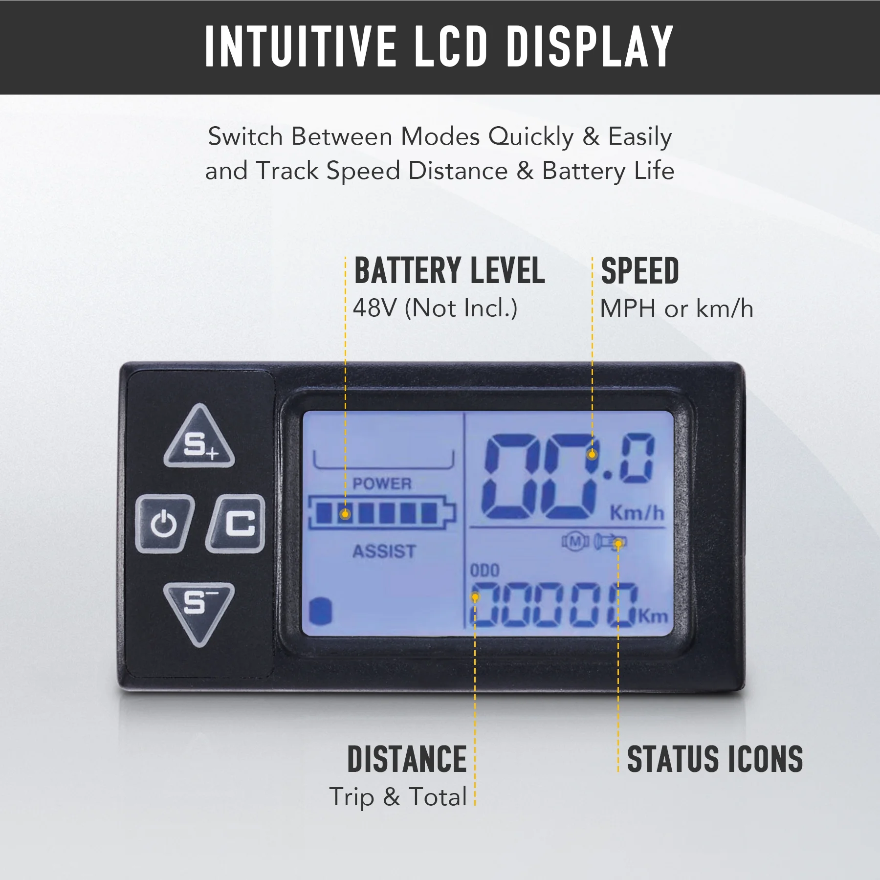 LCD CONTROLS switch quickly between modes and provide instant info about your speed, session and total distance traveled, and remaining battery life