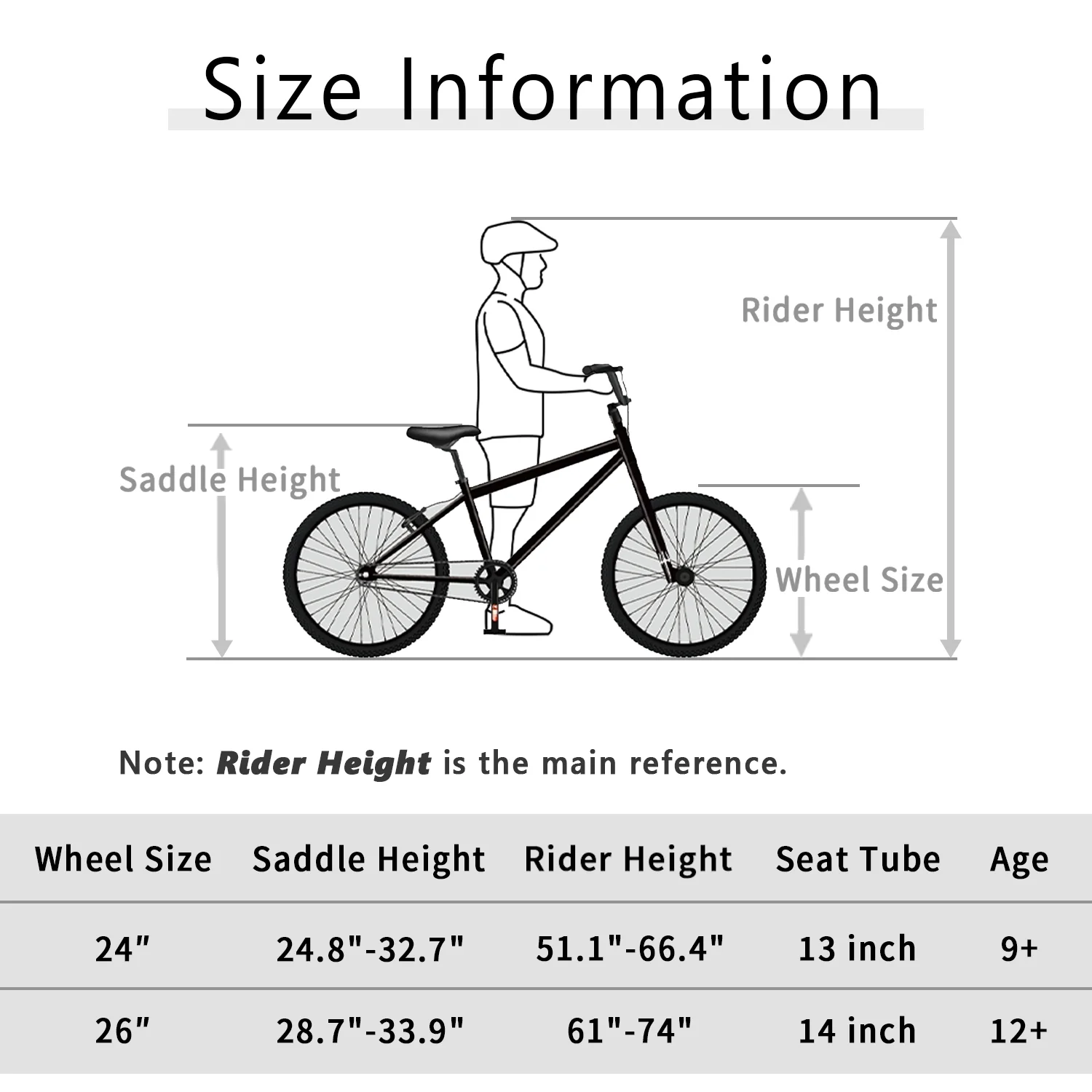 - The 24-inch wheel is suitable for a person 51"-66" tall. The 26-inch wheel is suitable for a person 61"-74" tall.
