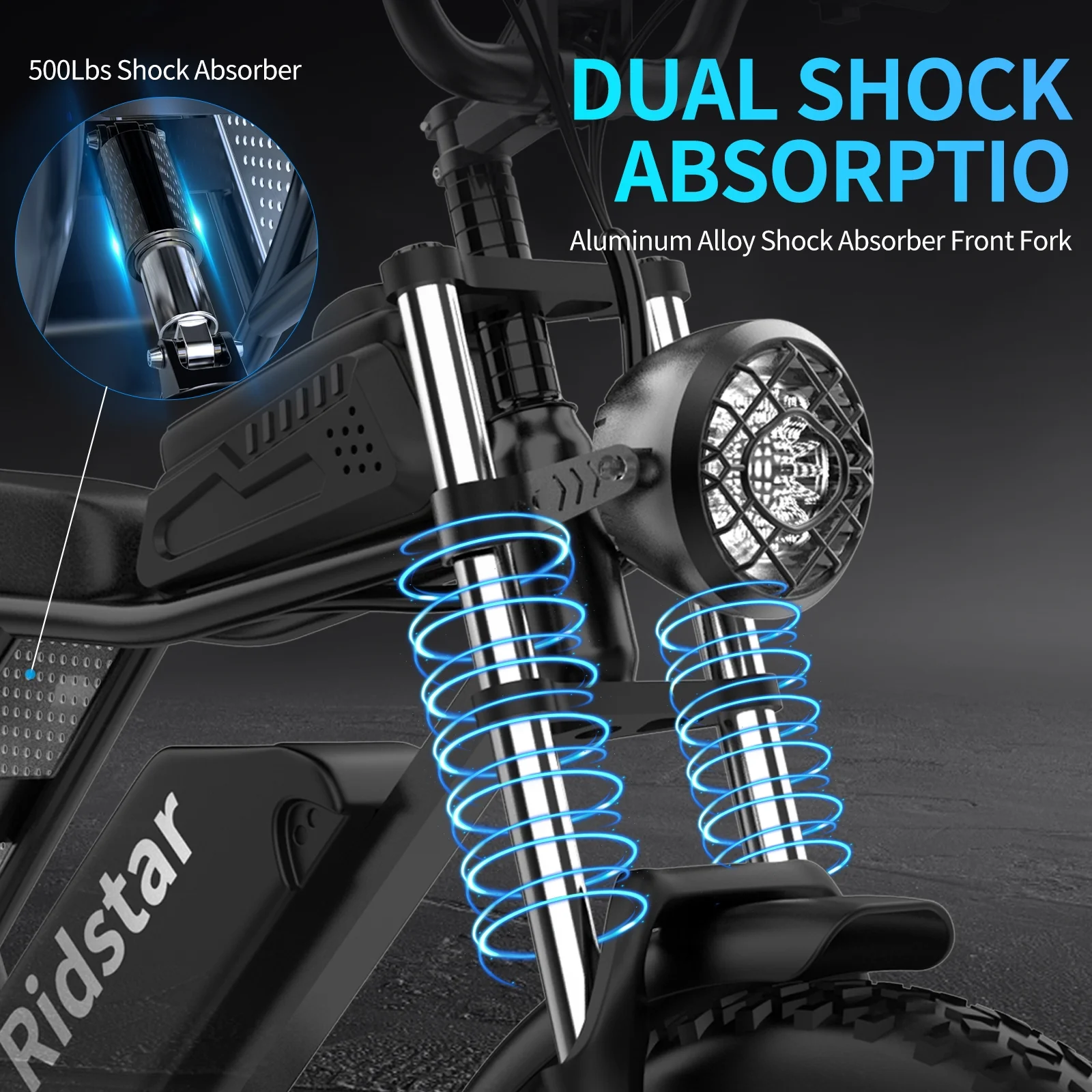 - 【𝐄𝐧𝐡𝐚𝐧𝐜𝐞𝐝 𝐒𝐮𝐬𝐩𝐞𝐧𝐬𝐢𝐨𝐧 𝐚𝐧𝐝 𝐁𝐫𝐚𝐤𝐢𝐧𝐠】The front suspension fork is strengthened by 100%, making it easier for you to navigate rough terrains. The rear hydraulic shock absorber offers superior performance compared to mechanical models. The hydraulic dual brakes system reduces the average braking distance by 50% compared to mechanical brakes, ensuring a safer ride even in wet weather conditions.