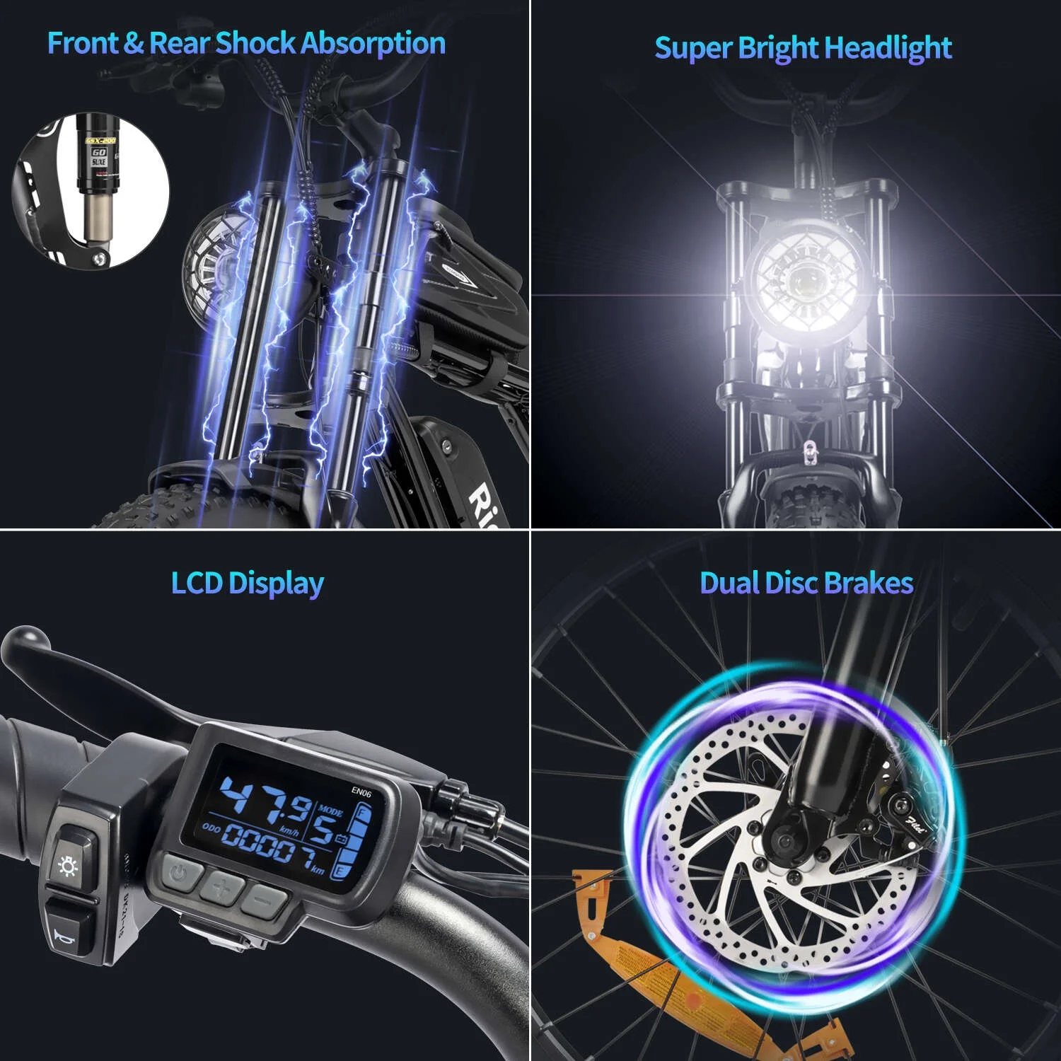 - 【𝐏𝐨𝐰𝐞𝐫𝐟𝐮𝐥 𝐌𝐨𝐭𝐨𝐫 𝐚𝐧𝐝 𝐒𝐩𝐞𝐞𝐝】The e bikes is equipped with a powerful 1500W brushless motor, delivering a maximum speed of 33mph(unloaded) and a torque of up to 90nm. It effortlessly conquers steep slopes with angles of up to 35°. With its 20''x4.0 fat tires, this electric motorcycle is suitable for many terrains, including snow, beach, mountain. The professional Shamano 7-speed system ensures precise and responsive gear shifting.