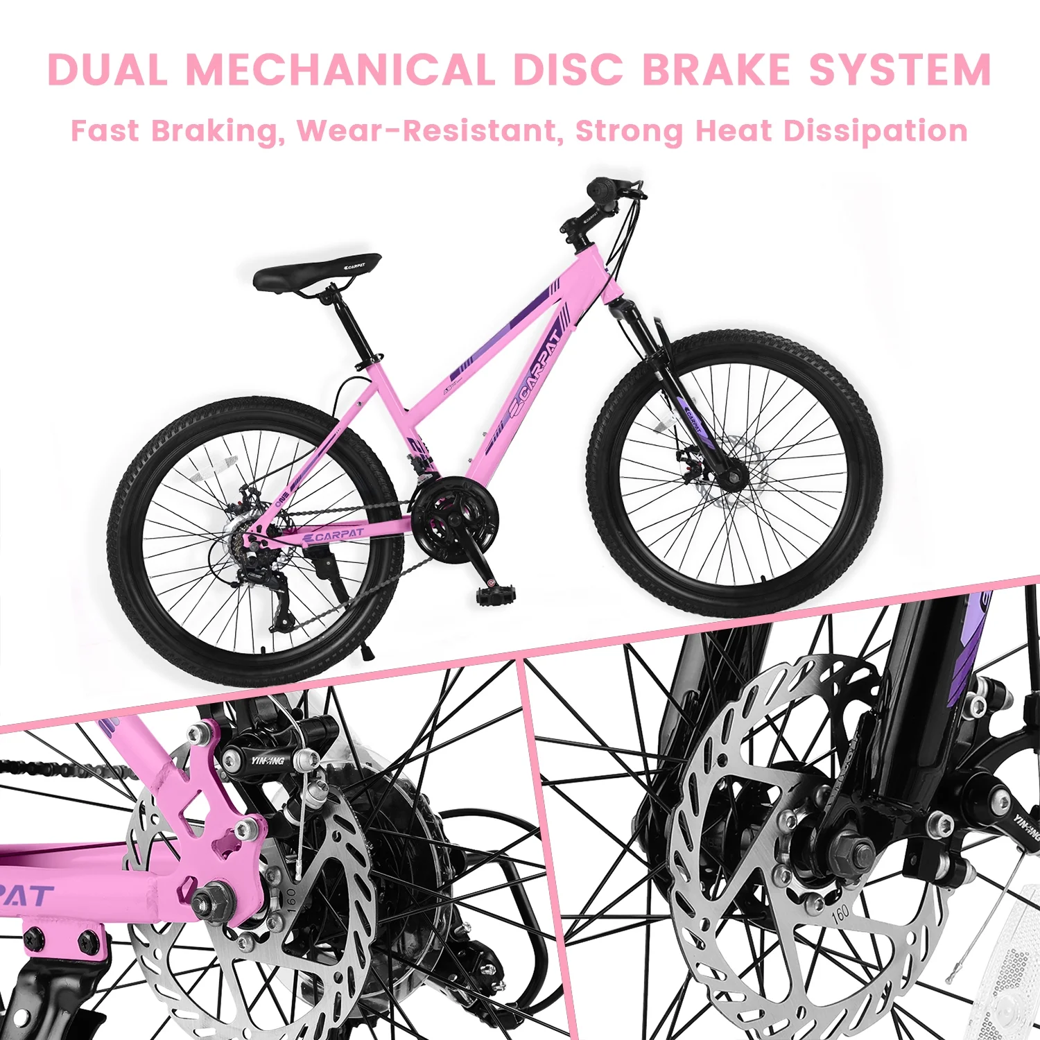 - [Powerful Dual Disc Brakes for All-Condition Control] Equipped with mechanical dual disc brakes, this MTB delivers intuitive, reliable stopping power. Whether navigating wet streets, icy trails, or steep hills, riders enjoy complete control with effortless braking precision.