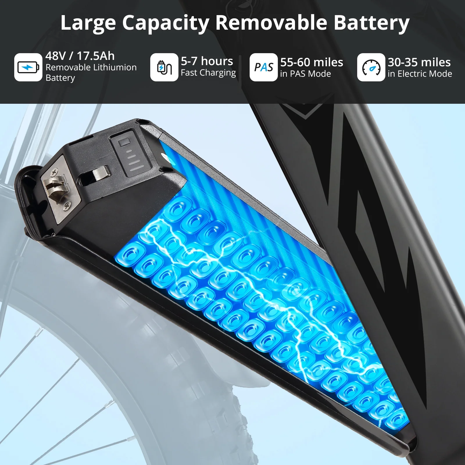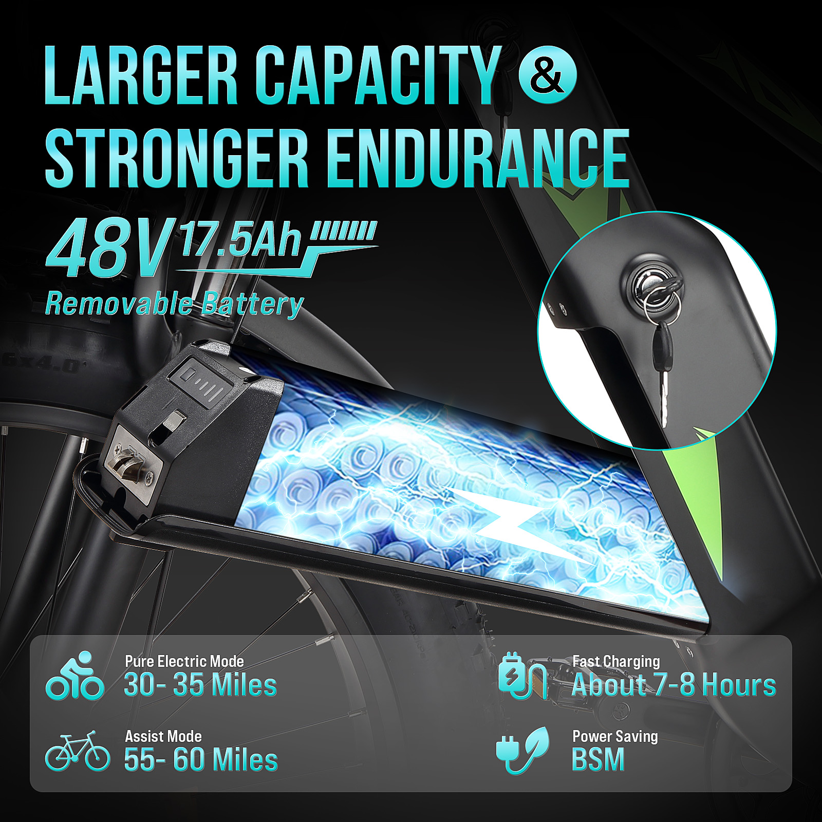 - Long-Lasting Battery Life--Explore new horizons with confidence thanks to our robust 48V 17.5Ah battery, which offers an impressive range of up to 60 miles per charge. Enjoy extended rides without worrying about running low on power.