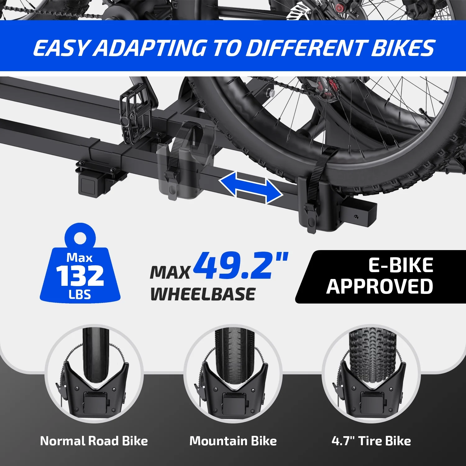 - Suitable for 2 Ebikes, max load 66lbs per bike, 132lbs in total.