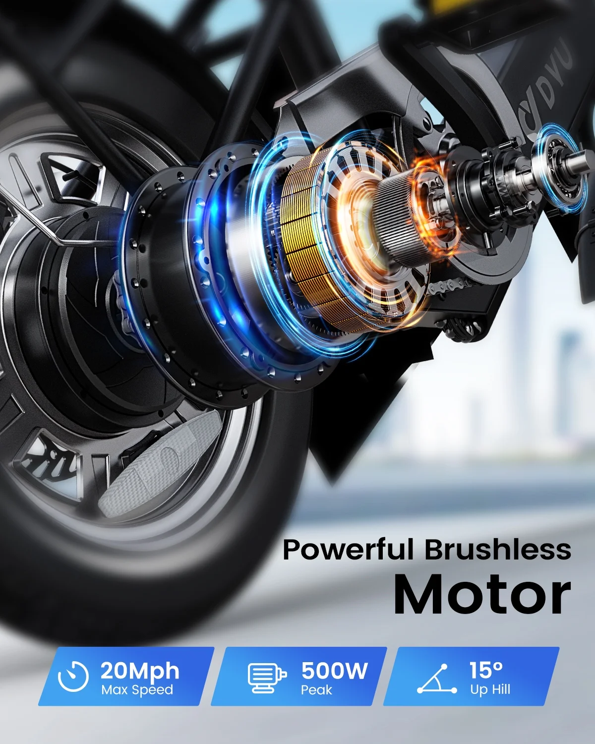 500W peak power high-speed brushless motor is efficiently quieter, lighter, smoother, and speeds up to 20 mph