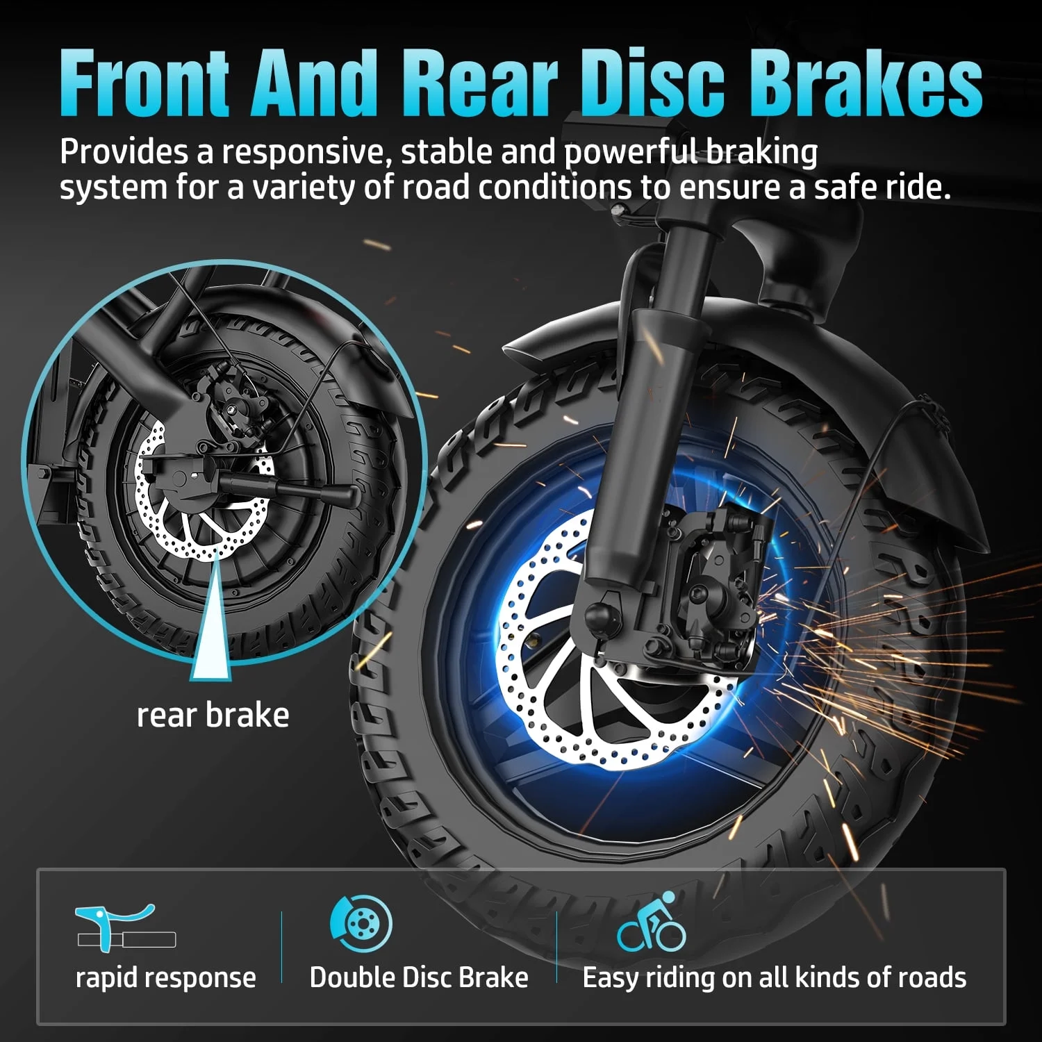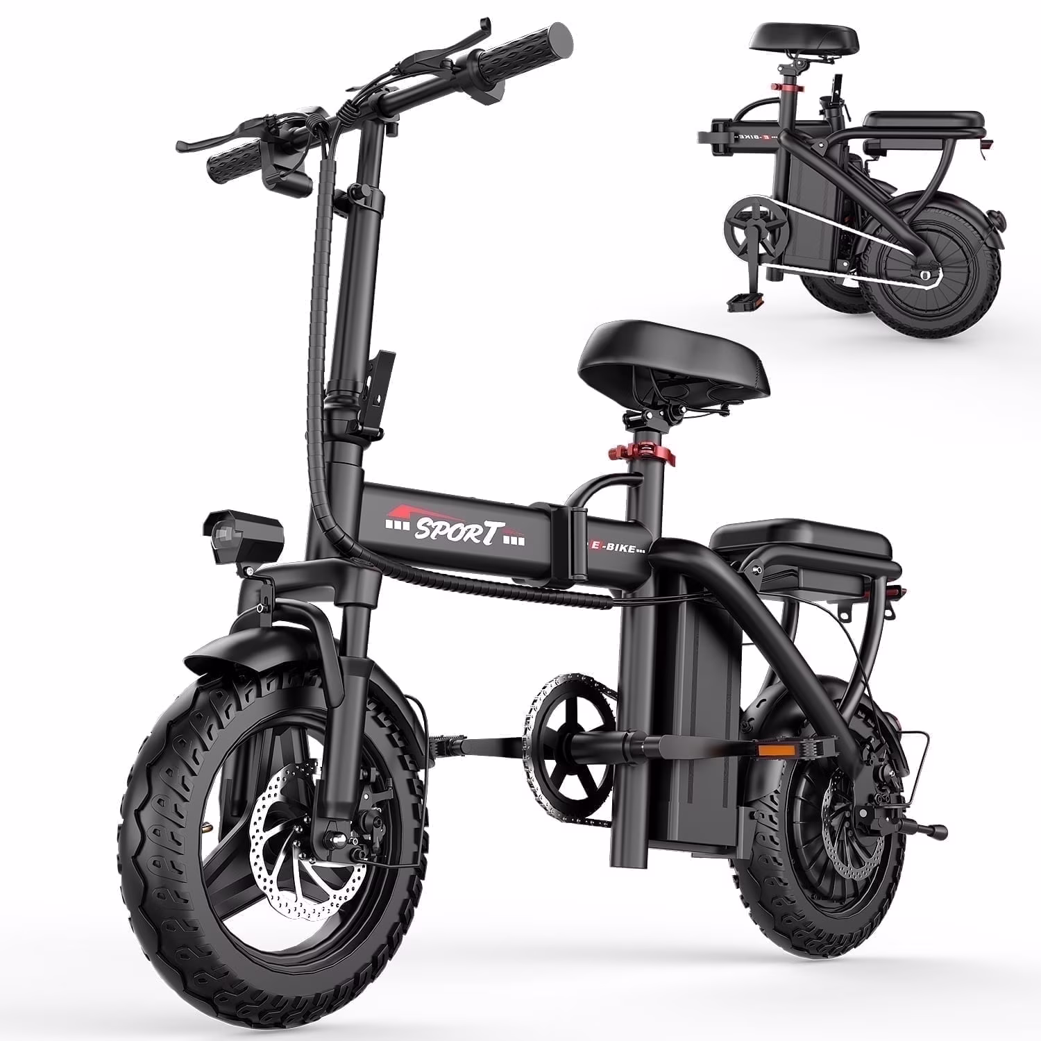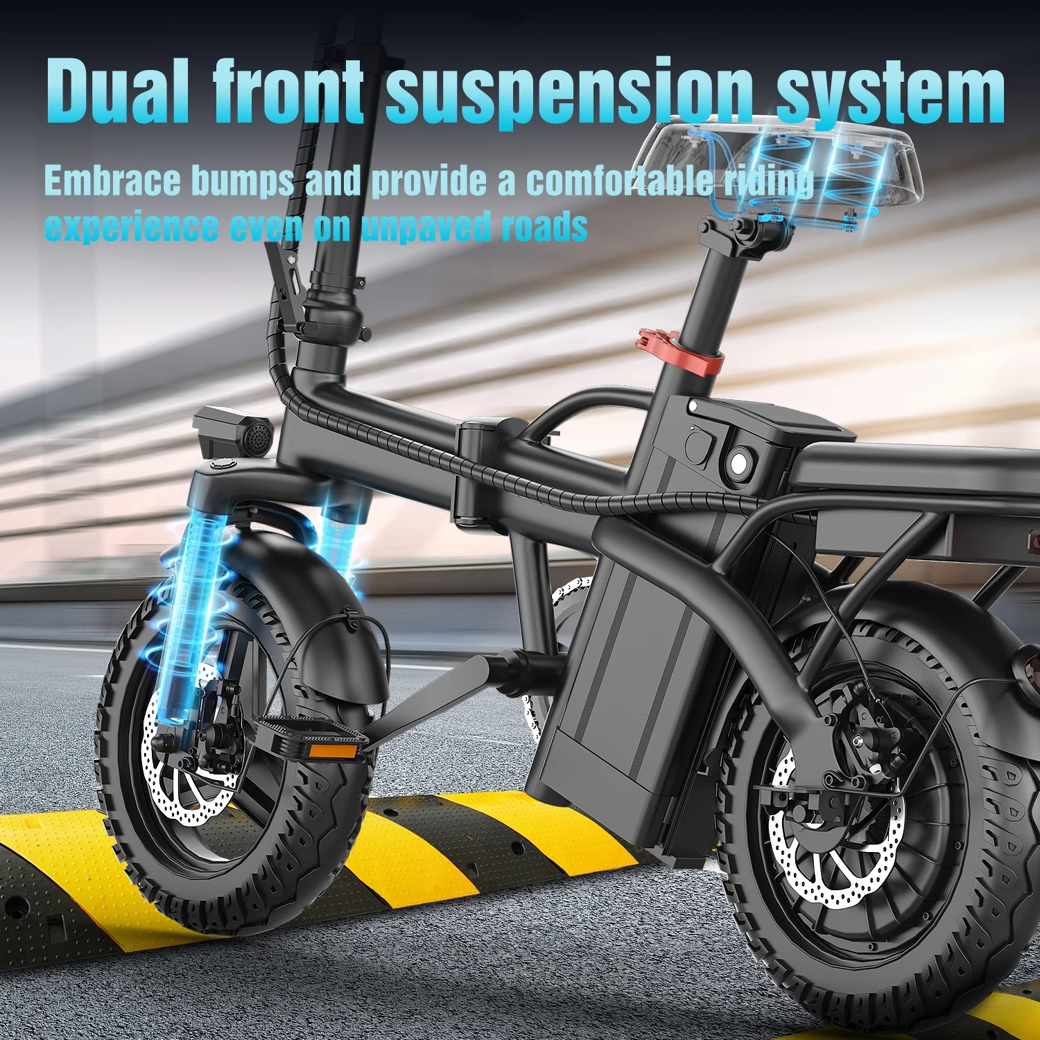 - 【Safe Ride】 -Electric bicycler with high-brightness seat headlights andrear brake lights. Effective dual disc brakes on adult electric bicycle provideexcellent stability and control, 14-inch explosion-proof tires, strong grip,allowing you to stop gradually and safely. Unique lever lock prevents the leverfrom accidentally falling off.