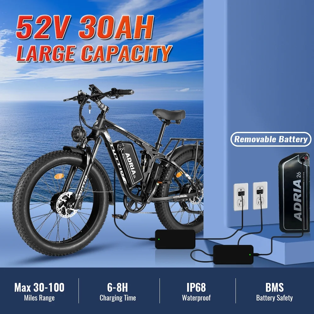 - 【Extra-Long Battery Life】This electric bike for adults is equipped with a 60V 25AH battery, with a pure electric range of up to 30-36 miles and an assisted driving range of up to 75-100 miles, making your electric bike more durable and longer riding time. At the same time, the removable battery allows you to charge anytime and anywhere, and it only takes 8 hours to fully charge.