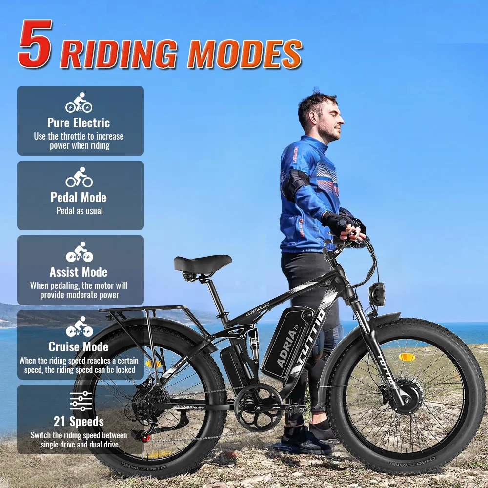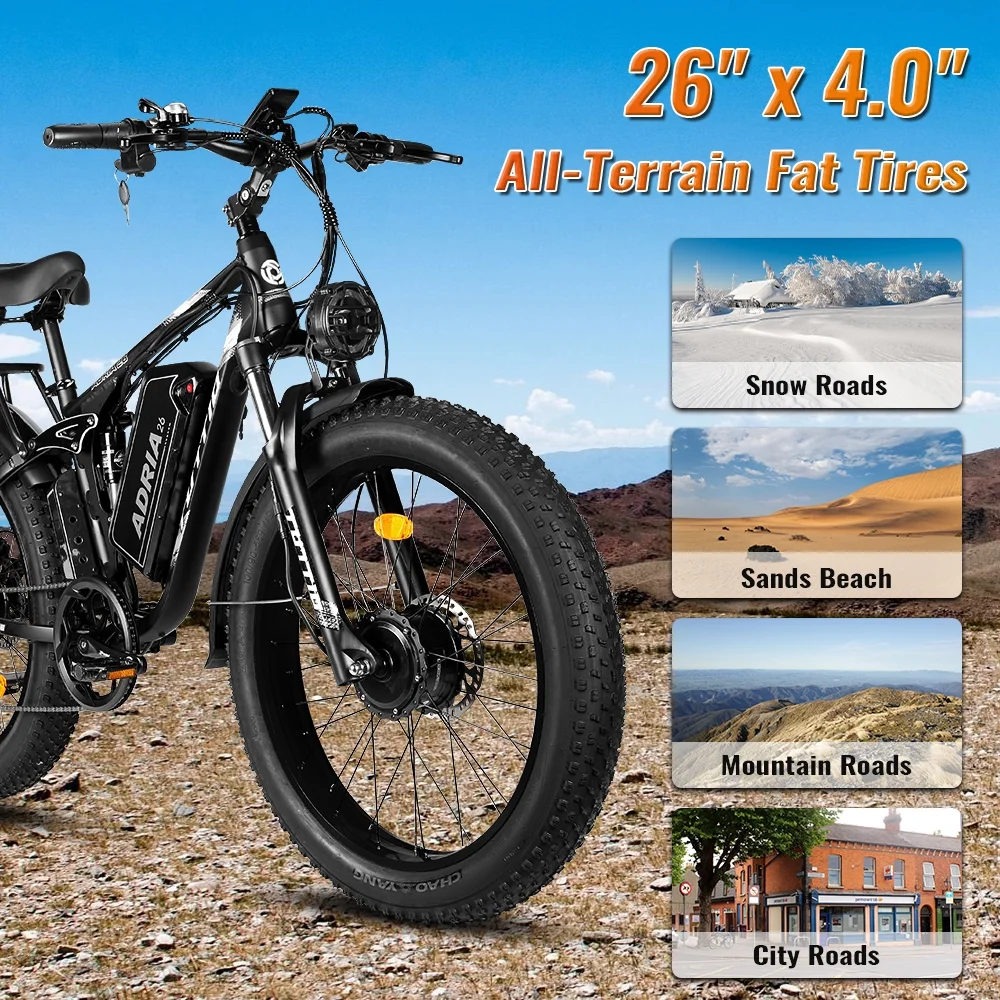 - 【2000W High-Performance Motor】This electric bike is equipped with a 2000W high-speed motor with a peak power of up to 4000W and a maximum speed of 49 mph. The torque of 170N·m provides strong power and reliability whether climbing hills or crossing rugged terrain, allowing you to easily cope with various adventures.