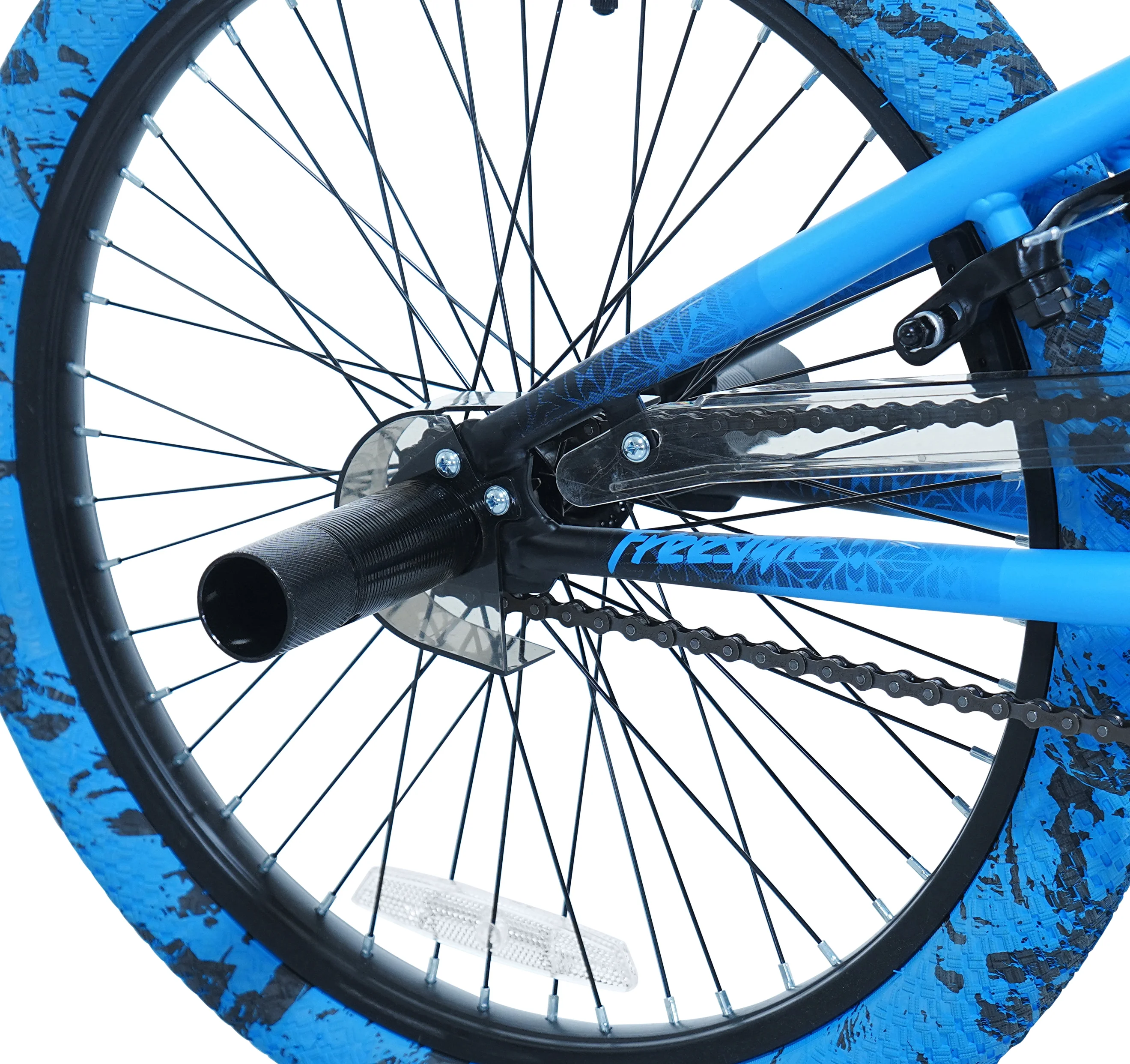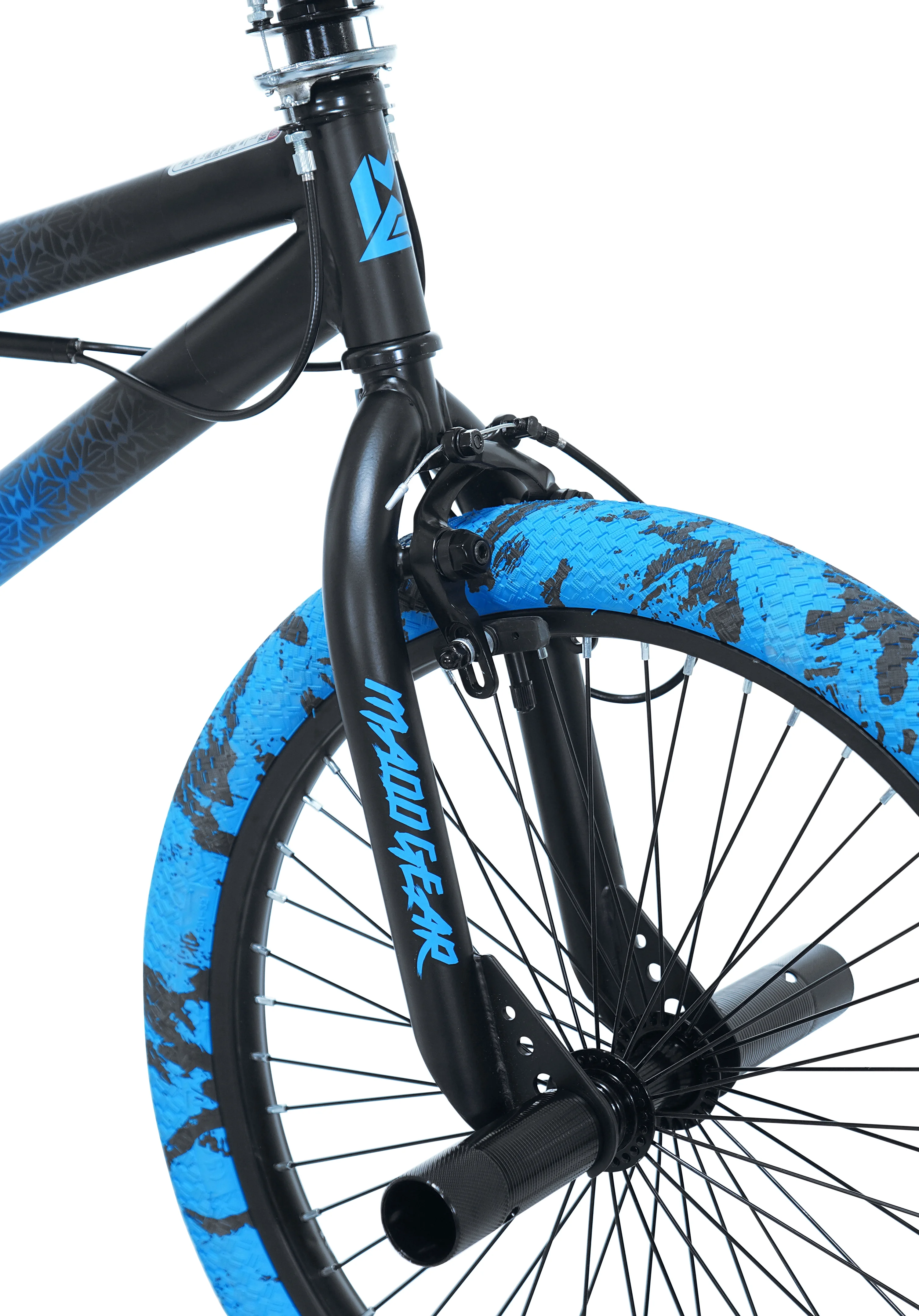 The 20" Madd Gear child freestyle bicycle has a super cool blue/black ombre satin finish. It is a tricked-out ride that is made for action and fun. This bike is equipped with a high-tensile steel frame, front and rear steel pegs. An alloy rotor system makes it easy to perform a variety of tricks and allows you to do 360-degree handlebar rotations. The MG20 bike also has sturdy 48 spoke alloy rims, dual-caliper alloy hand brakes, alloy pedals, and a smoke color PVC chain cover. Kids will love using it to shred the neighborhood streets.