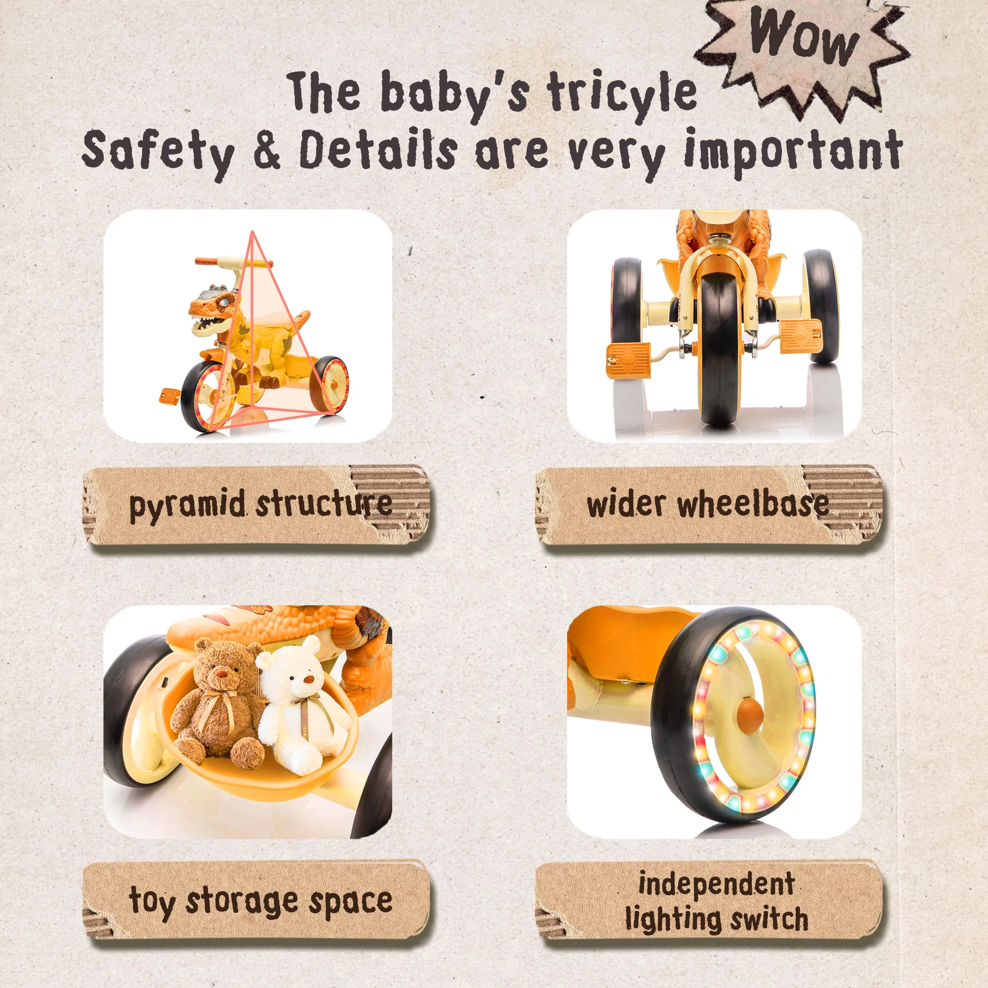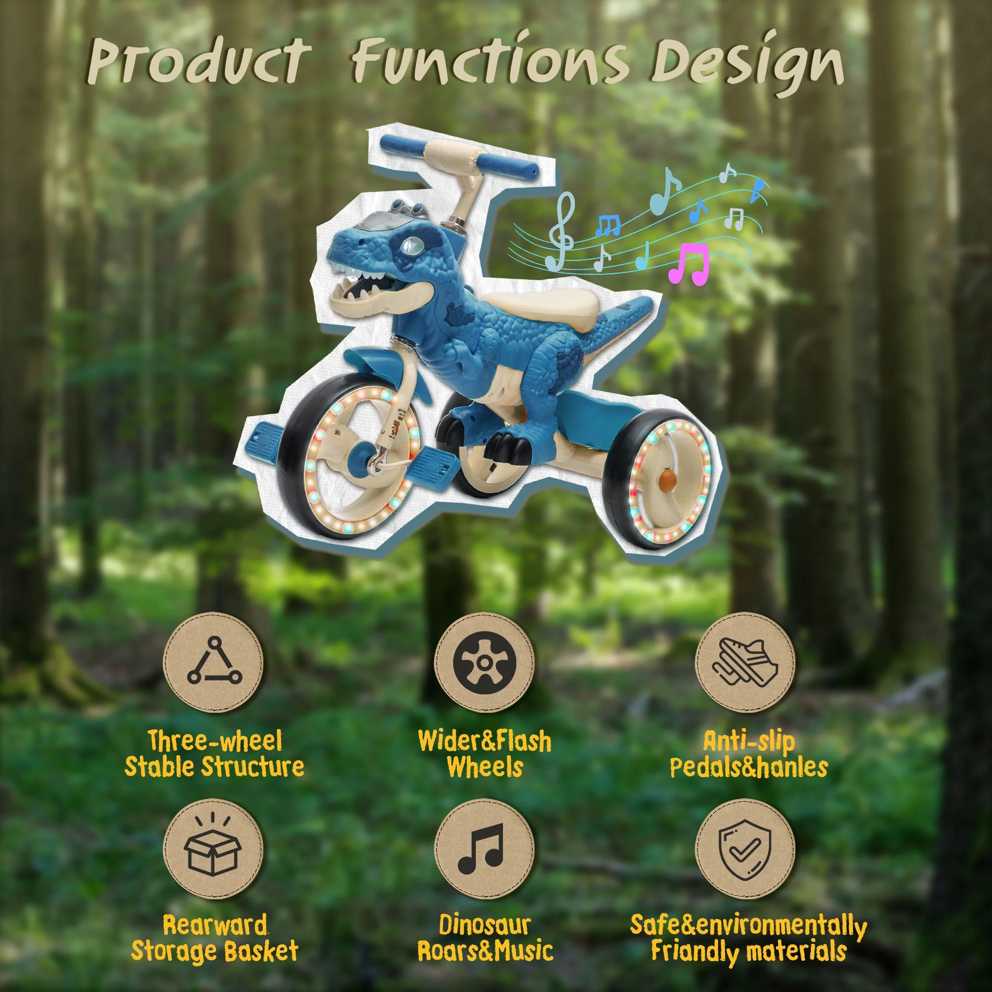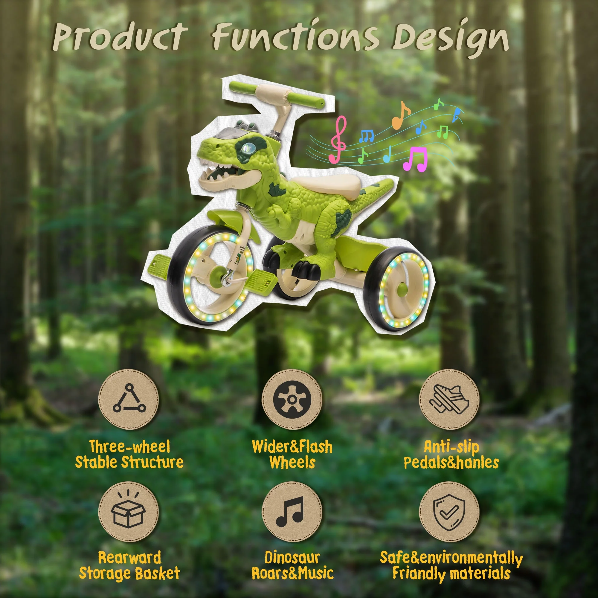 Fun Music & LED Lights: Turn every ride on your dinosaur toys tricycle into a party! Built-in music and colorful LED lights keep kids entertained for hours. Press a button to play cheerful tunes or activate flashing lights that move with the tricycle. Bright sounds and colors stimulate sensory development and make outdoor play exciting.