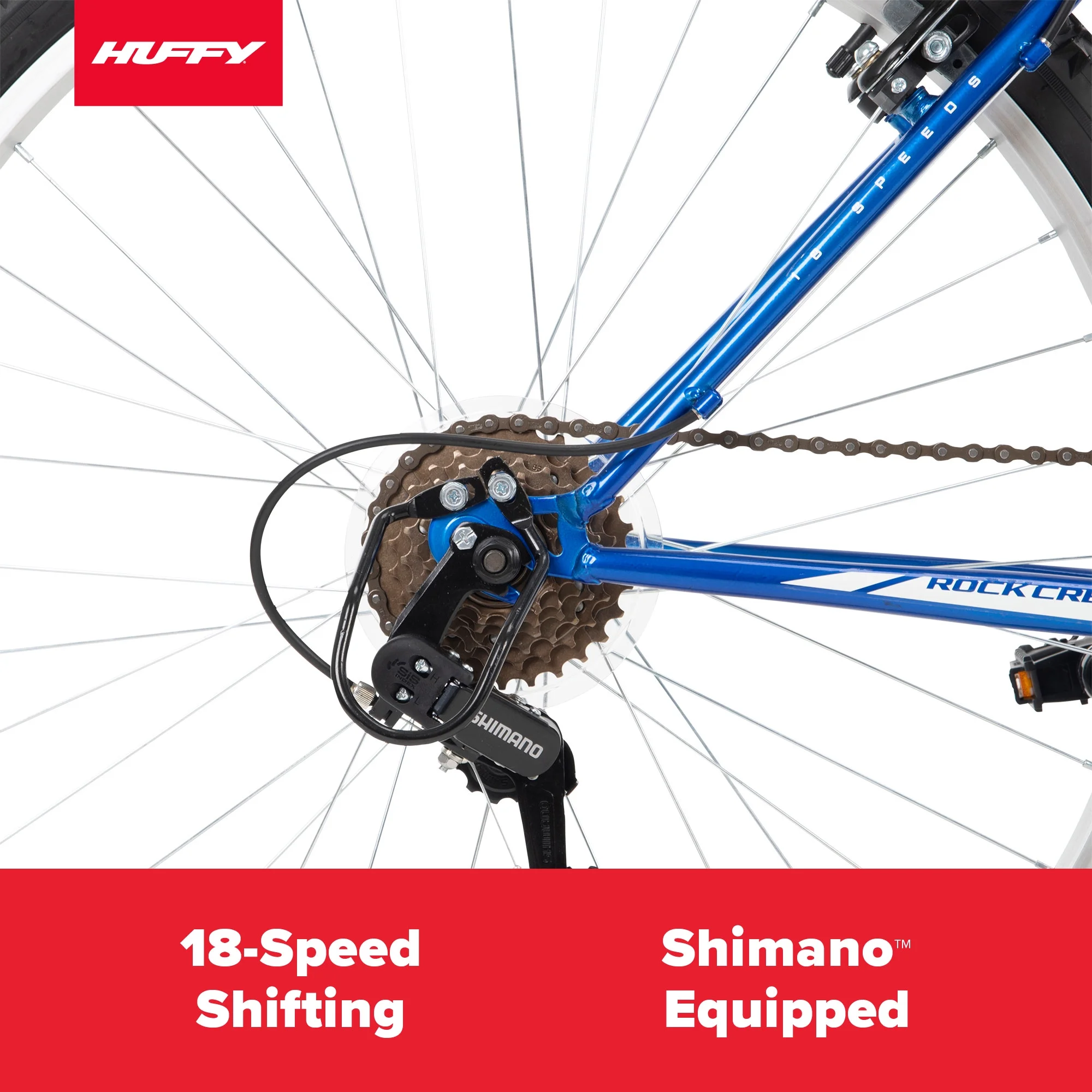 The Huffy Rock Creek 26-inch Mountain Bike in blue combines a hardtail frame, great style and the right specs to have a blast over bumps on paved trails or rides around the neighborhood. Smooth 18-speed index shifting system with a Shimano rear indexed derailleur consistently shifts between gears for quick adjustments venturing uphill or accelerating on level ground.