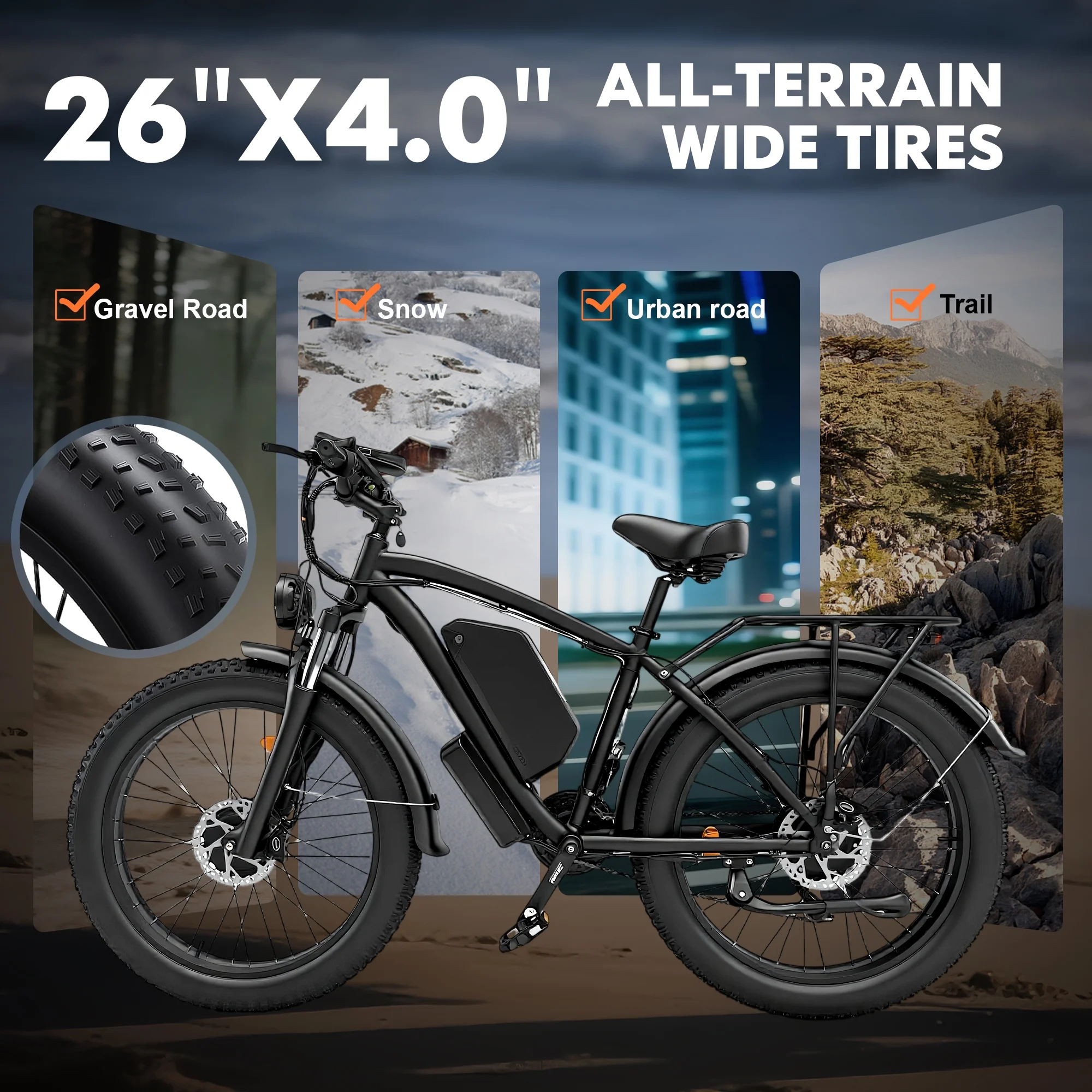 - All-Terrain Fat Tires – Ride Confidently Anywhere:The 26" x 4.0" fat tires grip confidently on gravel, sand, snow, and city roads. Enjoy smooth, stable rides across any terrain with enhanced traction and balance, even in challenging conditions.