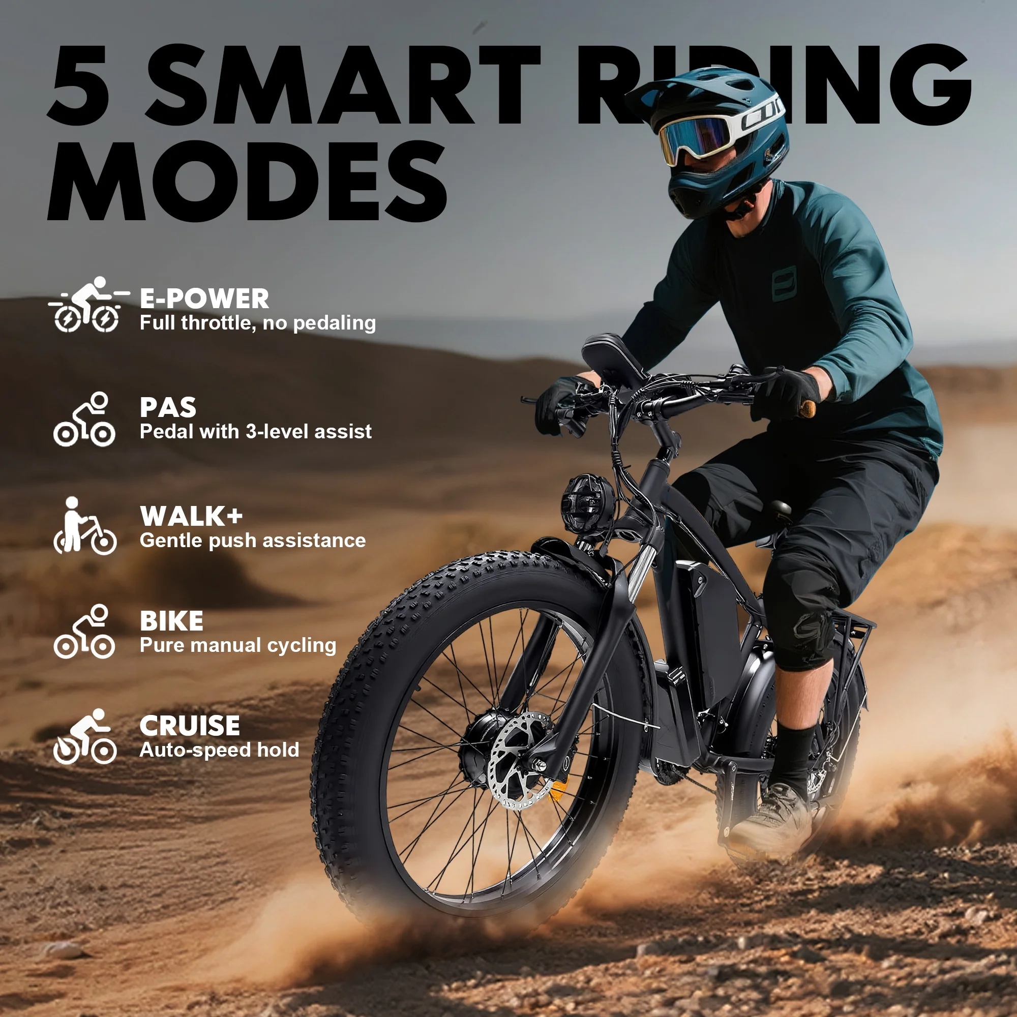 - 5 Smart Ride Modes – Adapt Your Ride to Any Need:Switch between E-POWER, PAS, WALK+, BIKE, and CRUISE modes depending on your trip. Whether you want full electric speed or pedal-assisted range, this bike adjusts to your lifestyle.