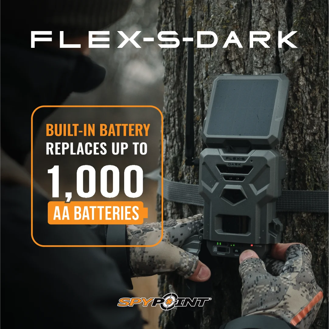 - BUILT-IN SOLAR PANEL: Enjoy extra-long camera life with the power of solar from the SPYPOINT FLEX-S-DARK. With the right combination of settings, the built-in solar panel ensures this cell trail camera stays powered up for months. Pair it with the SPYPOINT LIT-22 rechargeable lithium battery pack or 8AA batteries for even longer battery life during the hunting season.