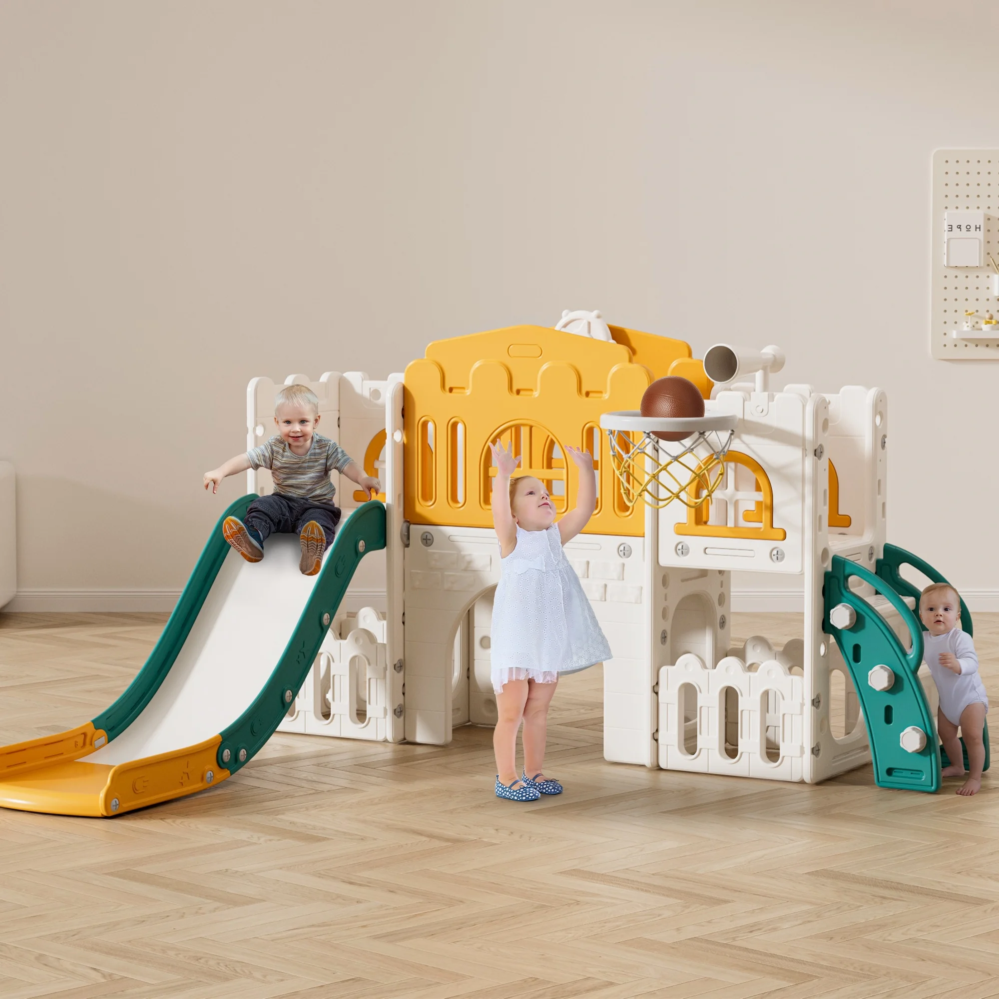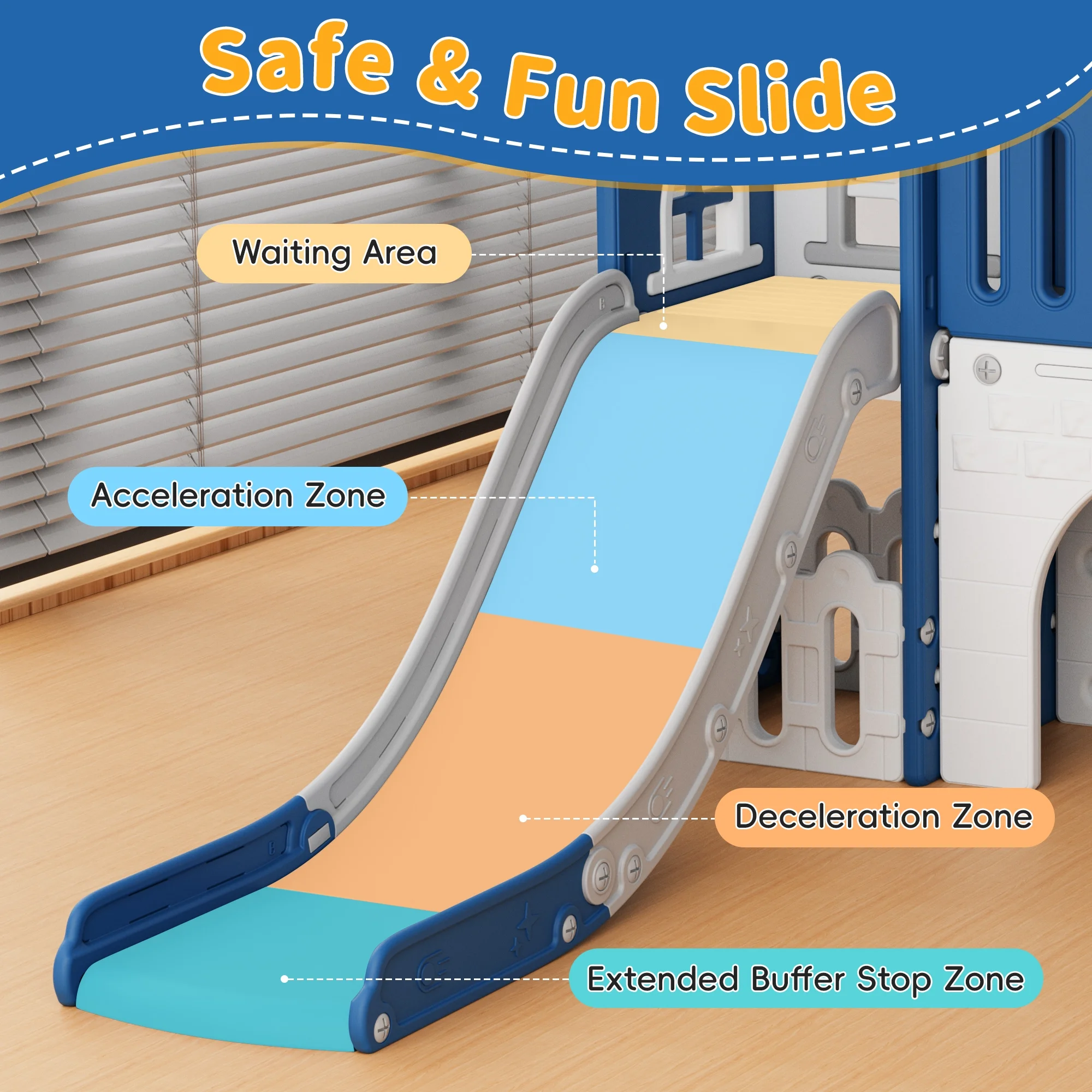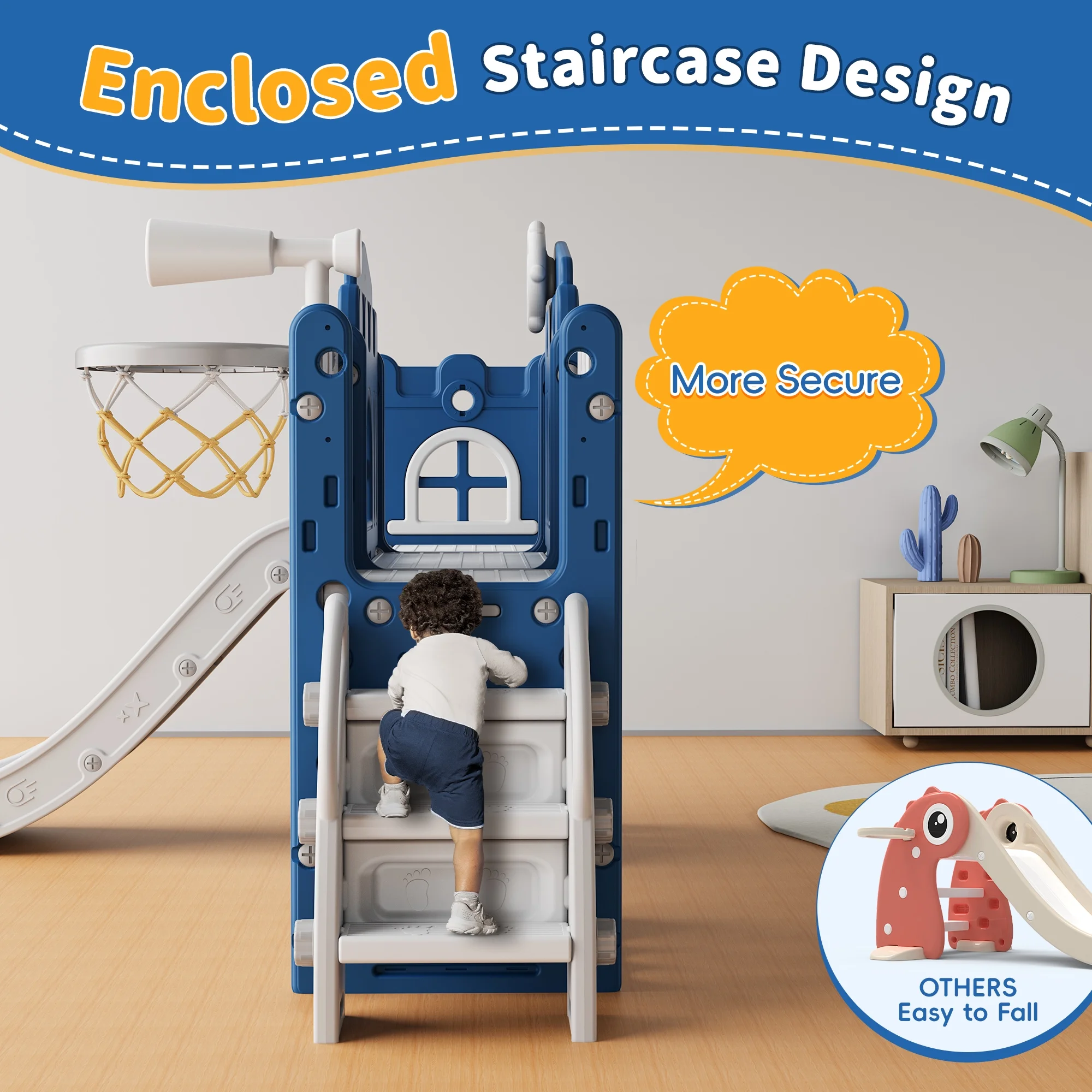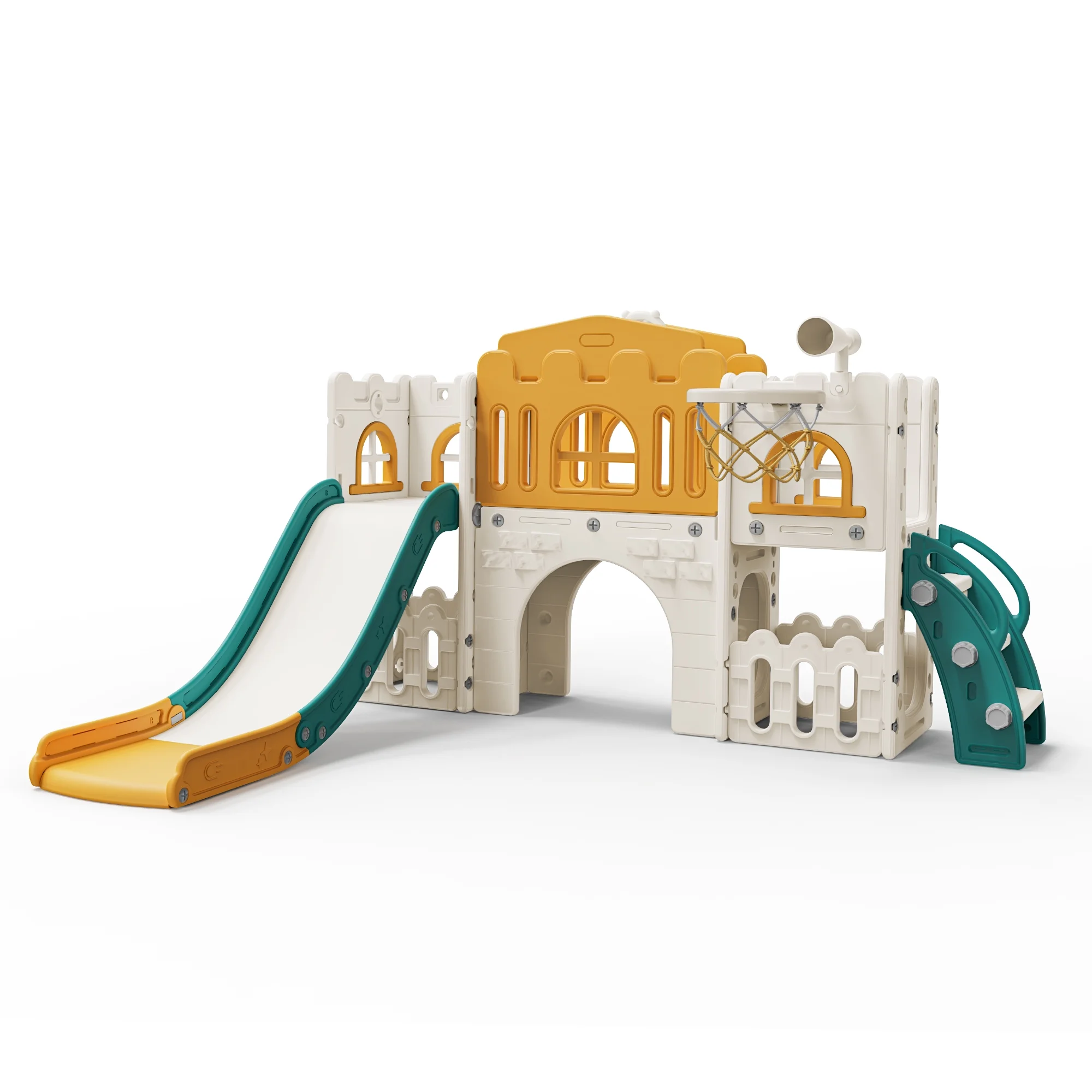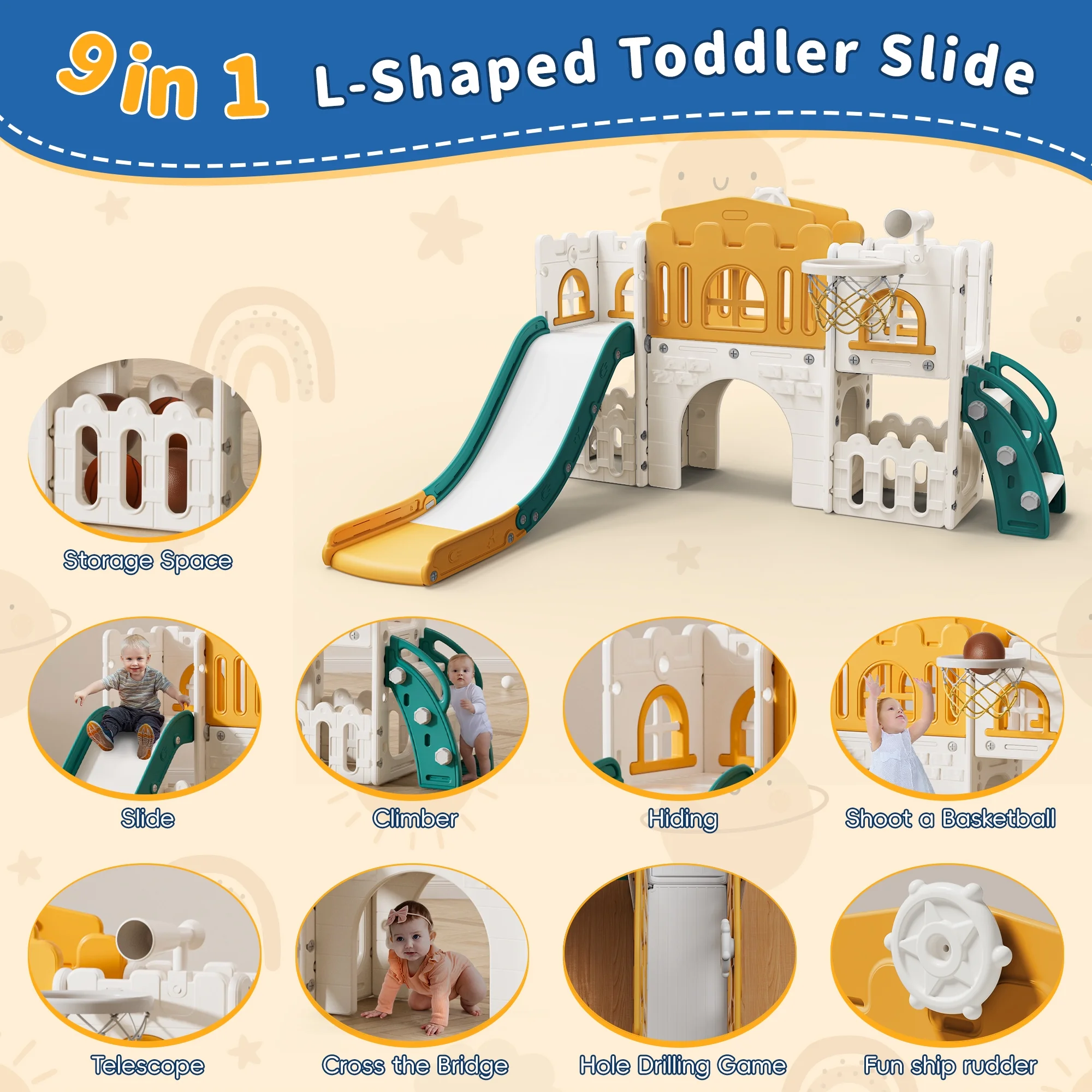 WFUN 9-in-1 Toddler Playground features a sstairs, slides, storage spaces, ring-toss game,basketball area, aisle, play telescope, climbing area and fun ship rudder, fostering coordination & motor skills. Built with safe, non-toxic HDPE, the toddler slide supports 265lbs, ensuring kid's security. Suitable for both indoor and outdoor use, our children's combination slide can be placed in gardens, yards, playgrounds, or indoor playrooms. Easy assembly allows for quick playtime, while promoting active, healthy development—perfect for 1-3-year-olds as a gift that encourages exploration and physical activity.