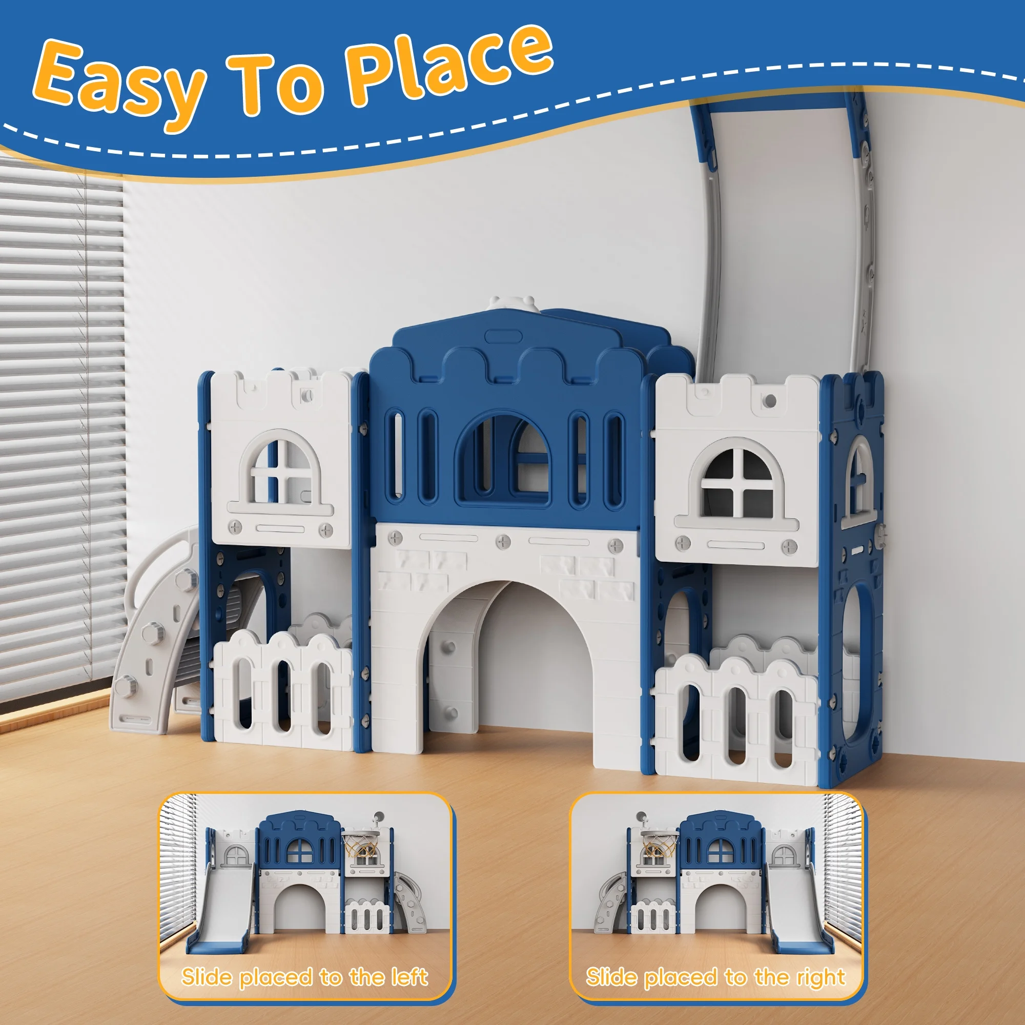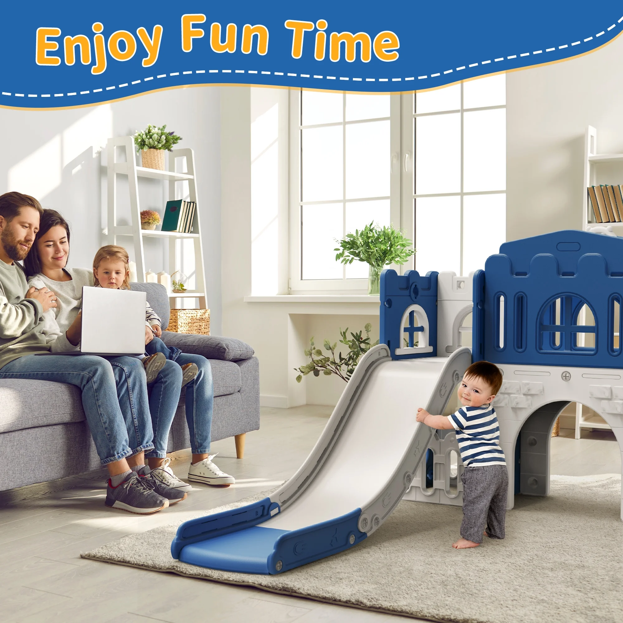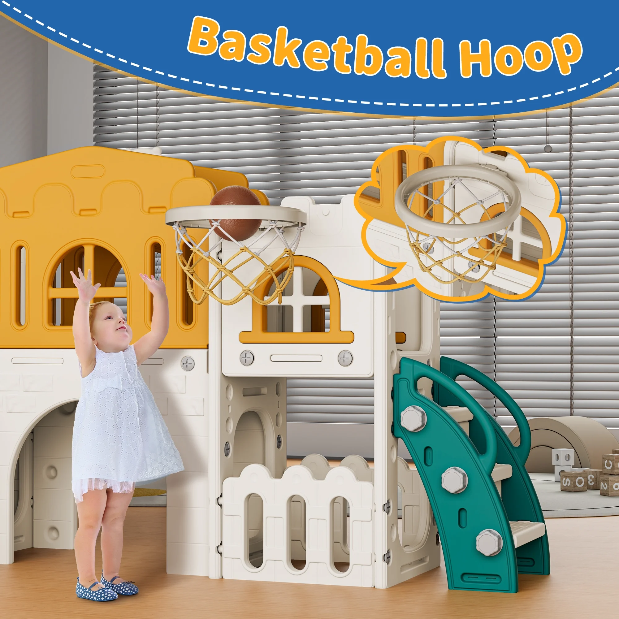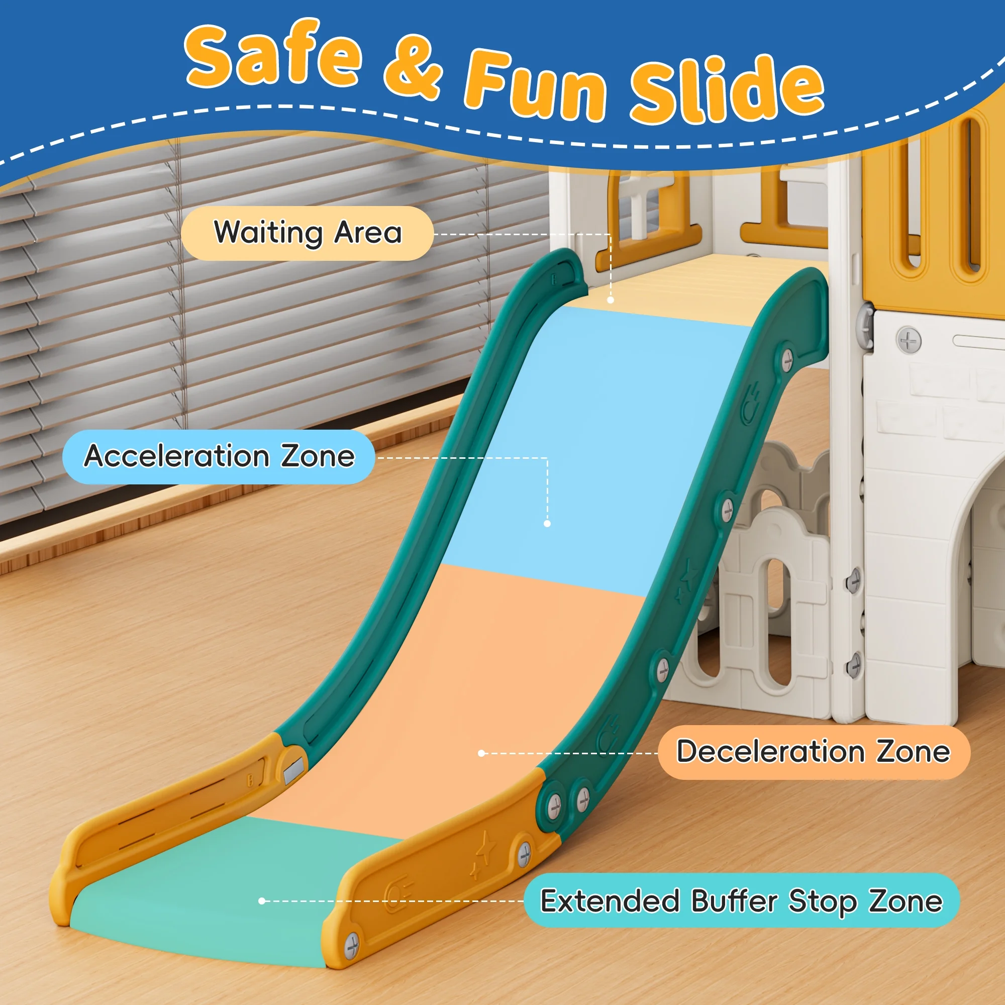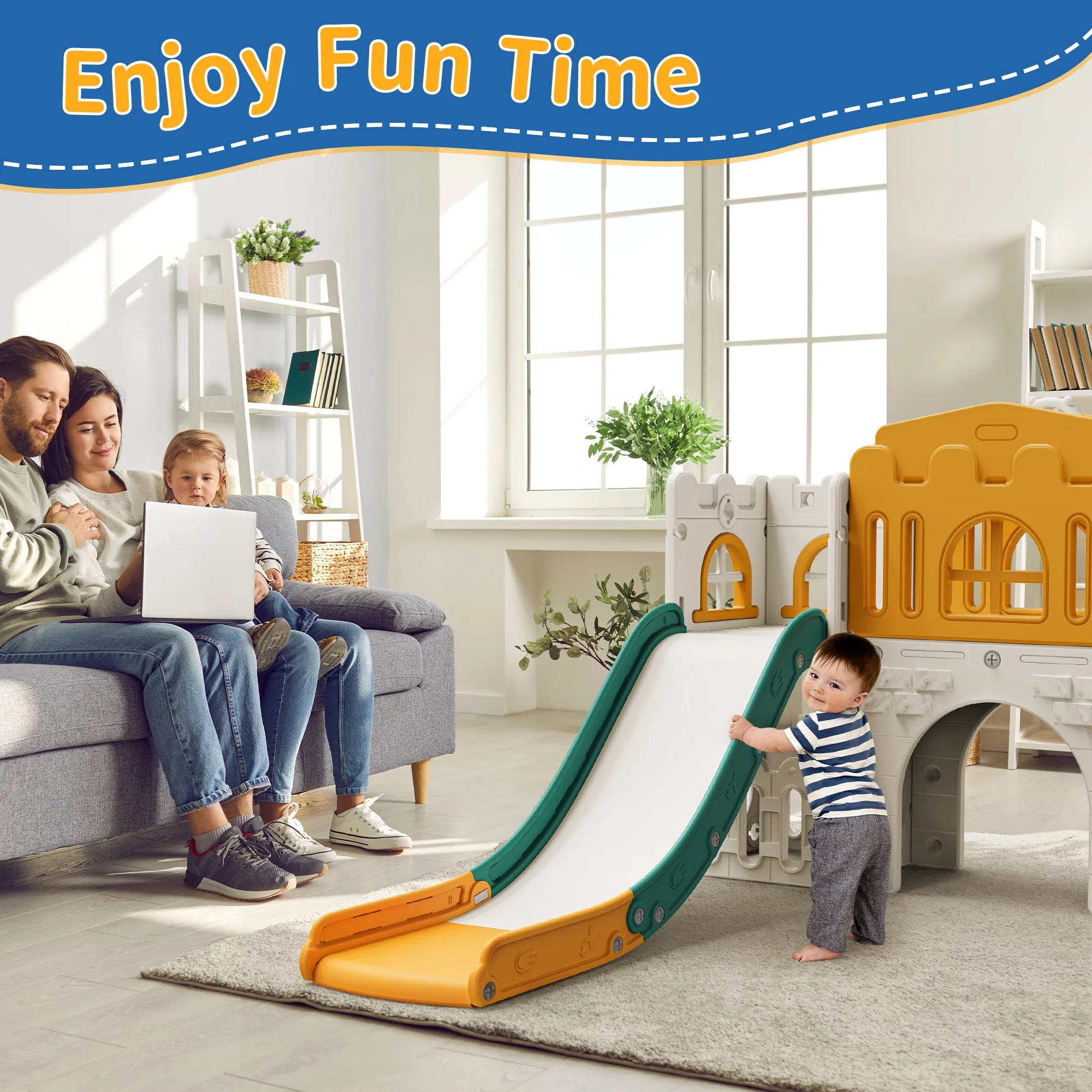 WFUN 9-in-1 Toddler Playground features a sstairs, slides, storage spaces, ring-toss game,basketball area, aisle, play telescope, climbing area and fun ship rudder, fostering coordination & motor skills. Built with safe, non-toxic HDPE, the toddler slide supports 265lbs, ensuring kid's security. Suitable for both indoor and outdoor use, our children's combination slide can be placed in gardens, yards, playgrounds, or indoor playrooms. Easy assembly allows for quick playtime, while promoting active, healthy development—perfect for 1-3-year-olds as a gift that encourages exploration and physical activity.