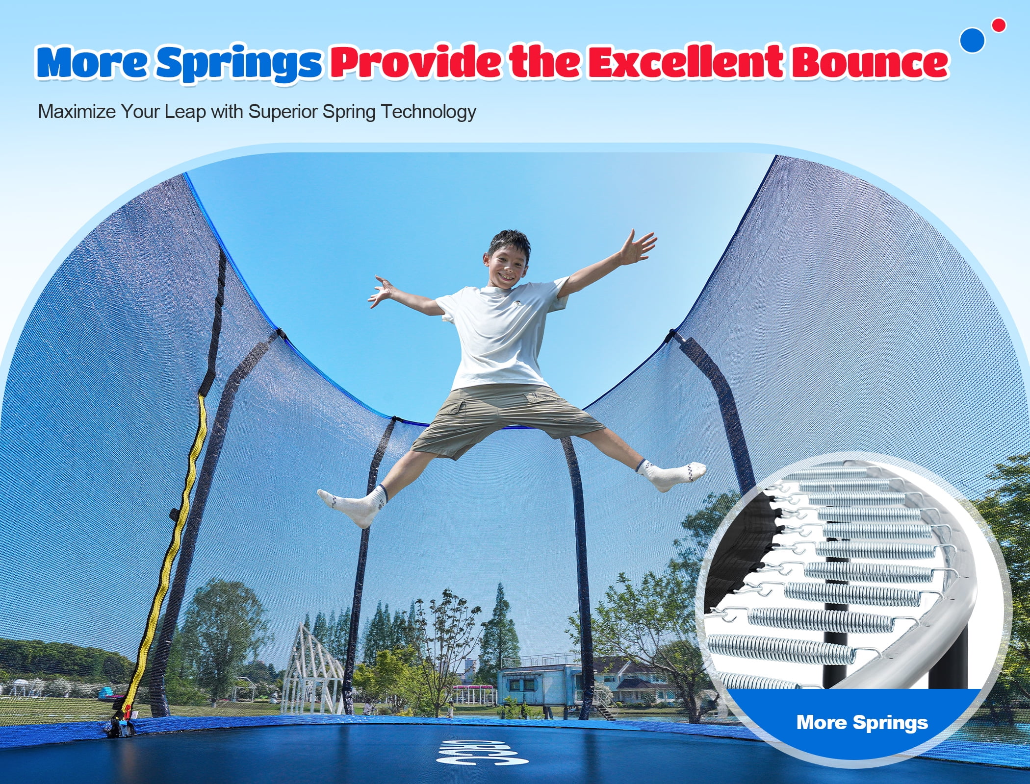 ✓ High-strength enclosure net with double-stitched seams prevents falls, while 66 tightly wound galvanized springs deliver consistent, controlled rebounds.