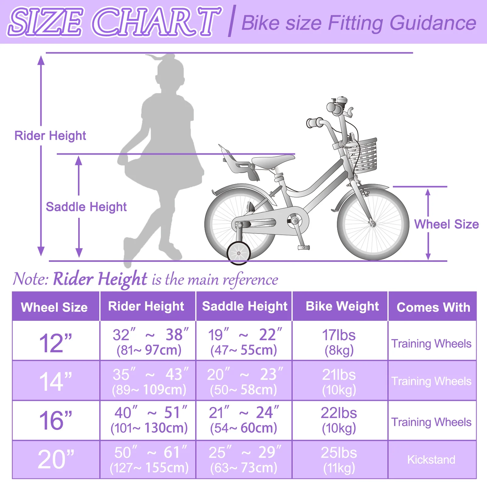 - 【More Size Options】- 12 inch girls bike is suitable for 2-4 years old (33-41 inch tall) ; 14 inch kids bike is suitable for 3-5 years old (35 - 47 inch); 16 inch bike is suitable for 4-7 years (41-53 inch). 20 inch bike is suitable for 6-12 years (41-53 inch).You can determine the ideal size for your little one by using our simple-to-use size chart