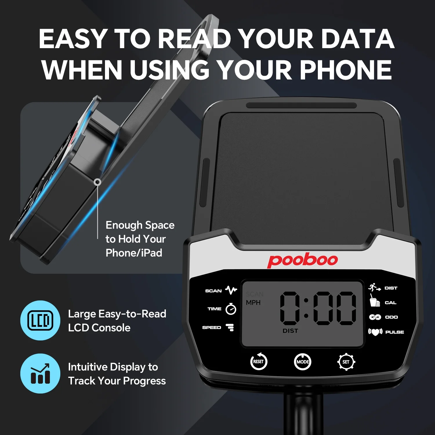 - Ergo-Engineered Display & Phone HolderTrack progress effortlessly on the oversized LCD monitor (Time, Speed, Distance, Calories, DOD) with bold, glare-resistant fonts. The built-in deep-groove phone holder securely fits all smartphones, keeping your screen visible and phone accessible mid-workout at same time!