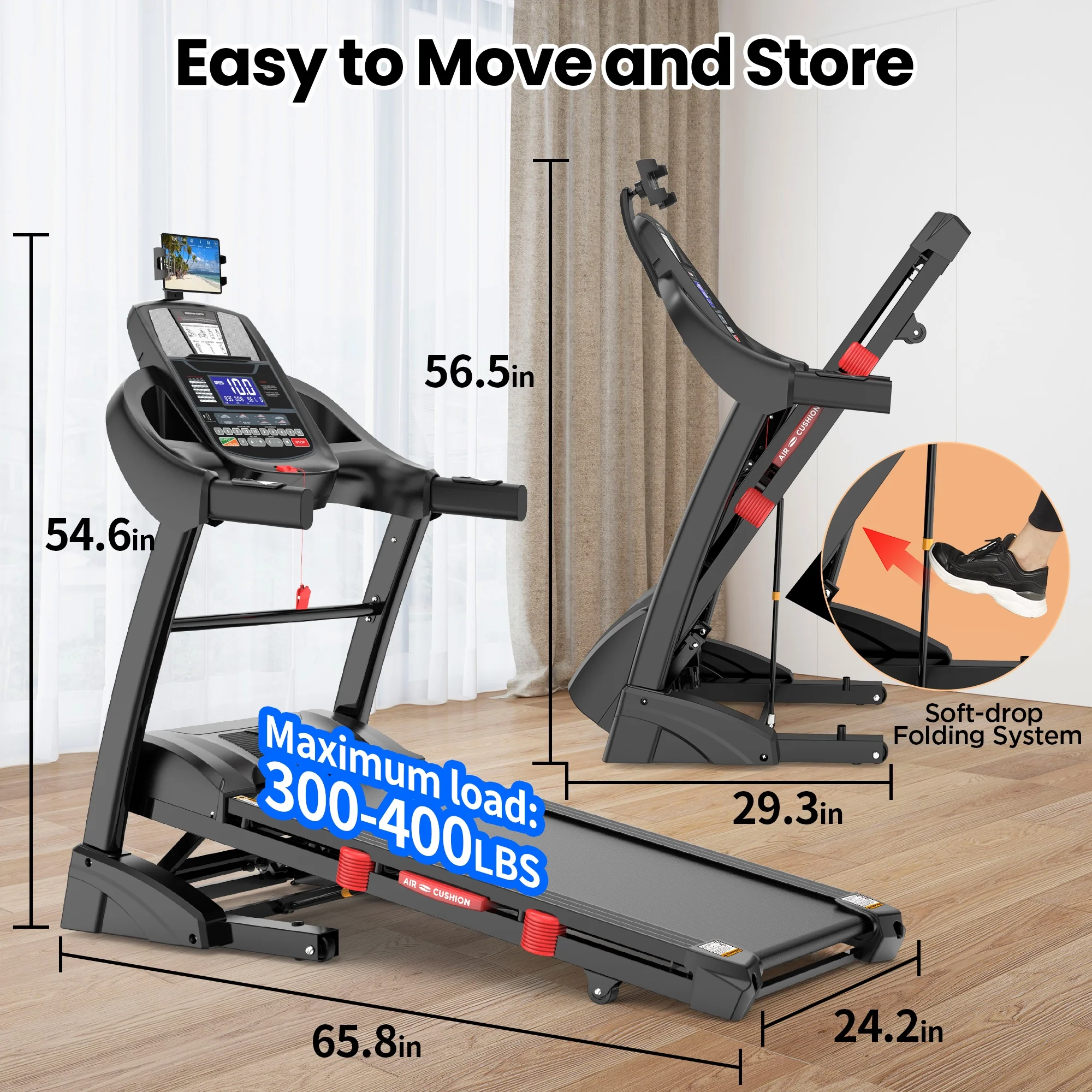 * The hydraulic rod folding and front wheel make it easy for this large treadmill to store and move, and save space.