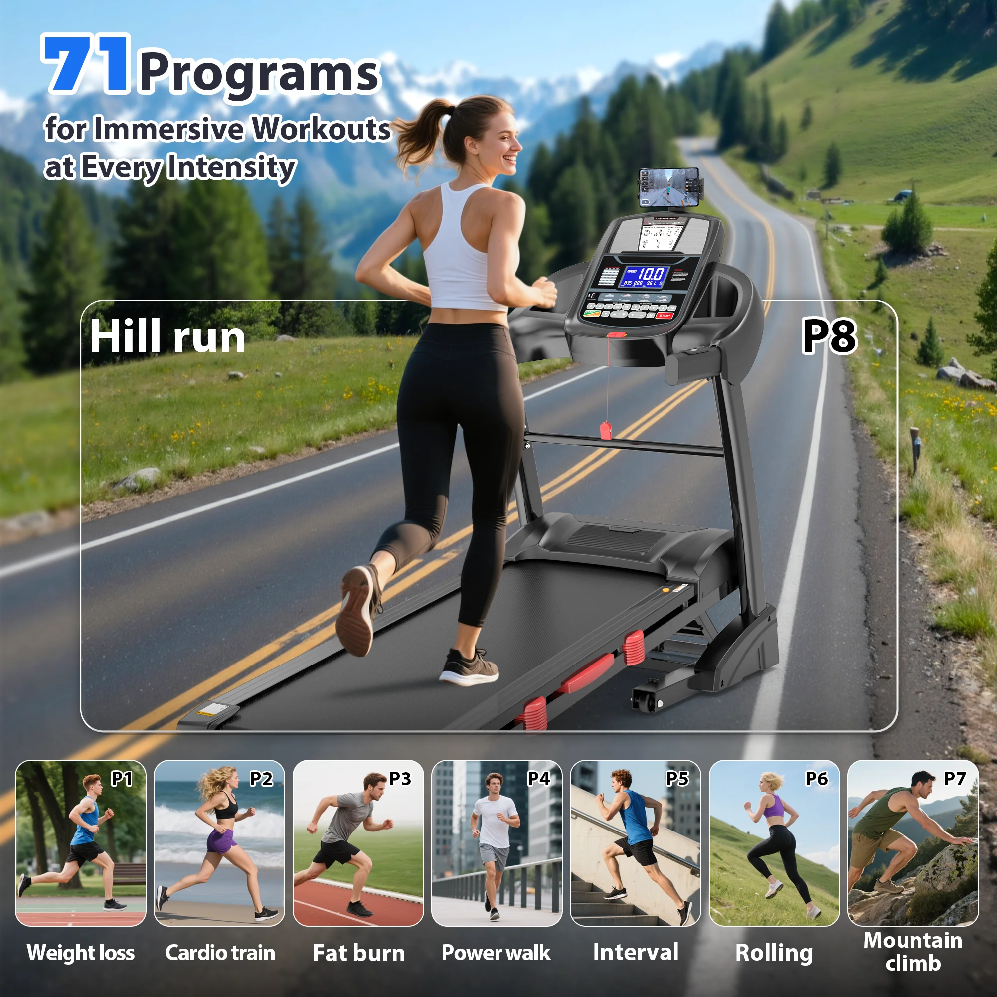 - Smart Design: The APP supports the control of the treadmill and records and statistics of exercise data. It has built-in primary/intermediate/advanced multi-scene virtual sports courses to simulate outdoor multi-scene sports, so that you can enjoy an immersive sports experience. One-click to count exercise data, so that you can plan your exercise reasonably and scientifically.