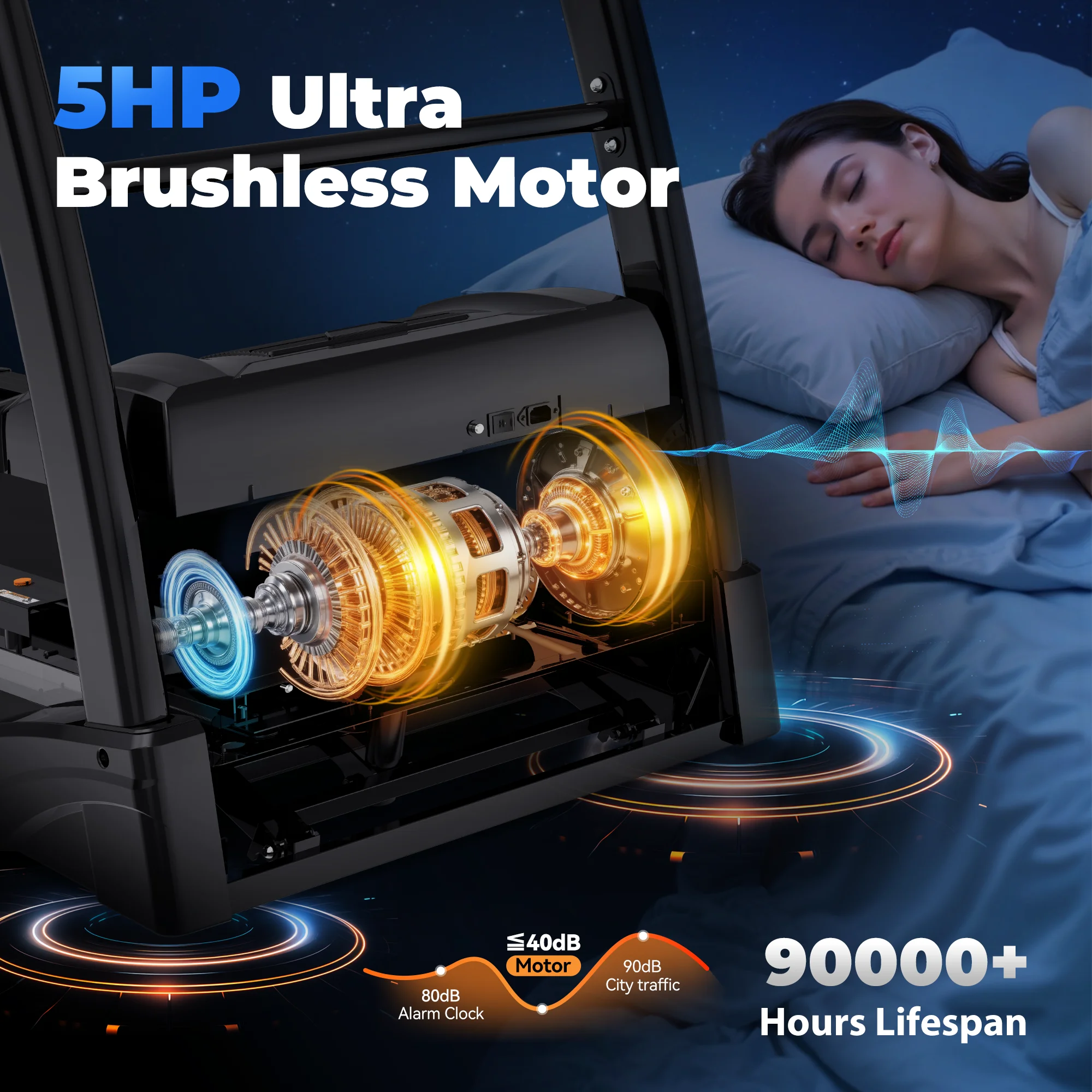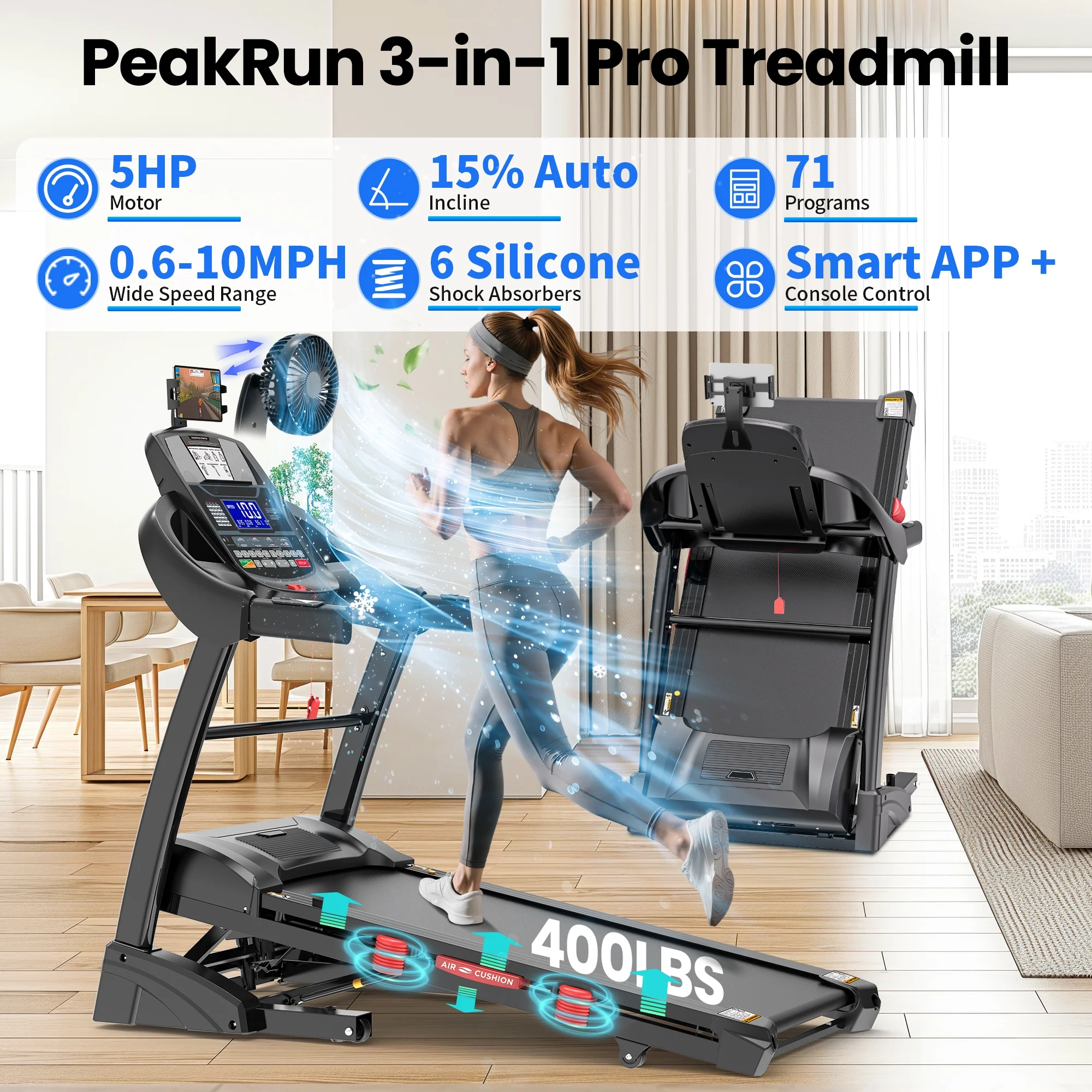 * The first household treadmill adopts a brushless motor, which is characterized by a speed of up to 5HP horsepower motor, which can easily meet the smooth and smooth operation of 300lb load. It has low noise and high life (100,000+ hours), and the maximum speed of the treadmill reaches 10MPH.
