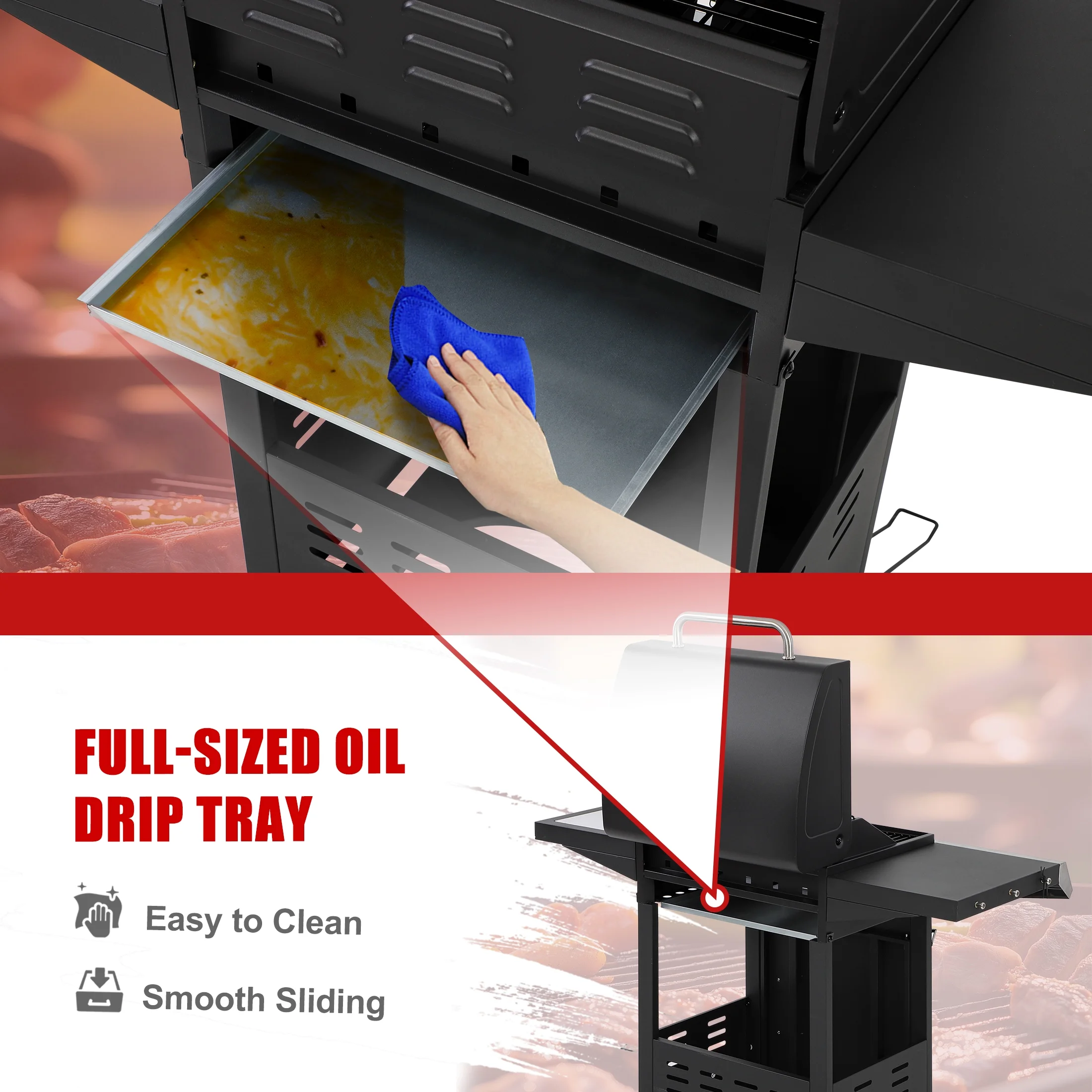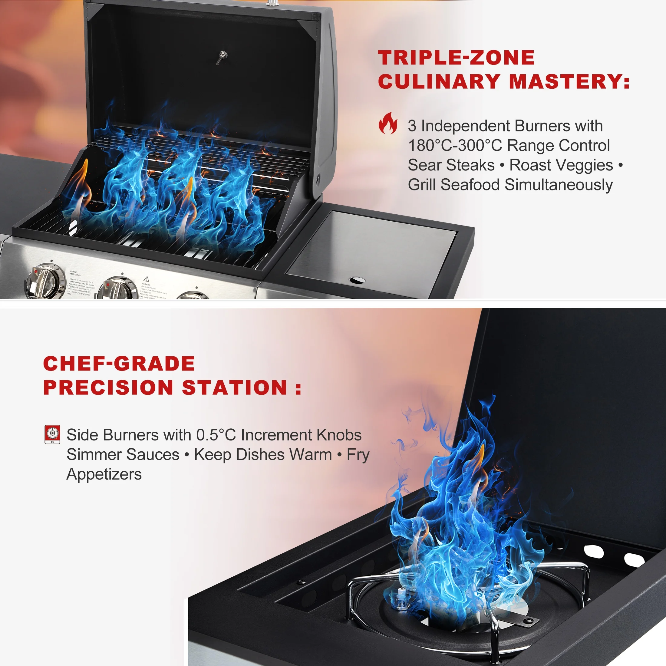 🔥【Thoughtful Design】- Built-in temperature gauge for easy heat control. Side tables provide extra cooking operation space. 4 universal wheels for convenient mobility.