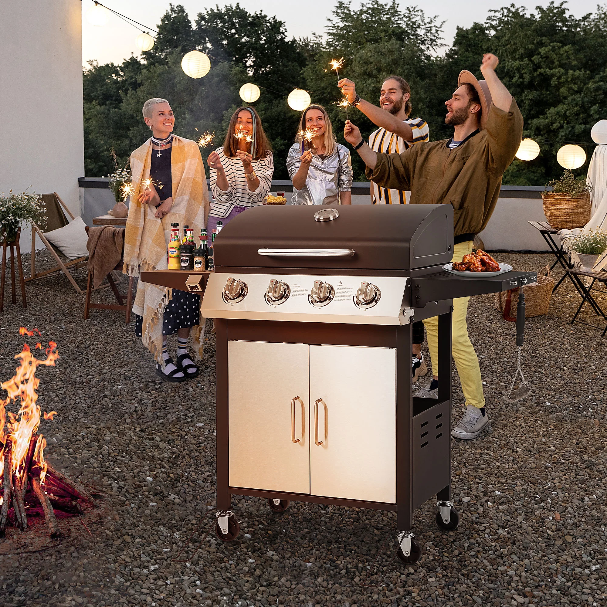 This 4-burner gas grill is made of exclusive stainless steel and porcelain enameled iron materials. The cooking space of this grill includes a main grilling area as well as a warming area, totaling a total of 437 sq.in, which is more than enough cooking space for small gatherings or large parties. Its even-heat cooking system, which includes stainless steel burners, enameled flame arrestors, and an enhanced grill pan, is fixed on wheels for easy mobility and anchoring, and each burner can be ignited independently, and these components work together to distribute heat consistently across the entire cooking surface, reducing sparks and splatters while grilling. It also has 4 Universal wheels for easy movement and fixing.