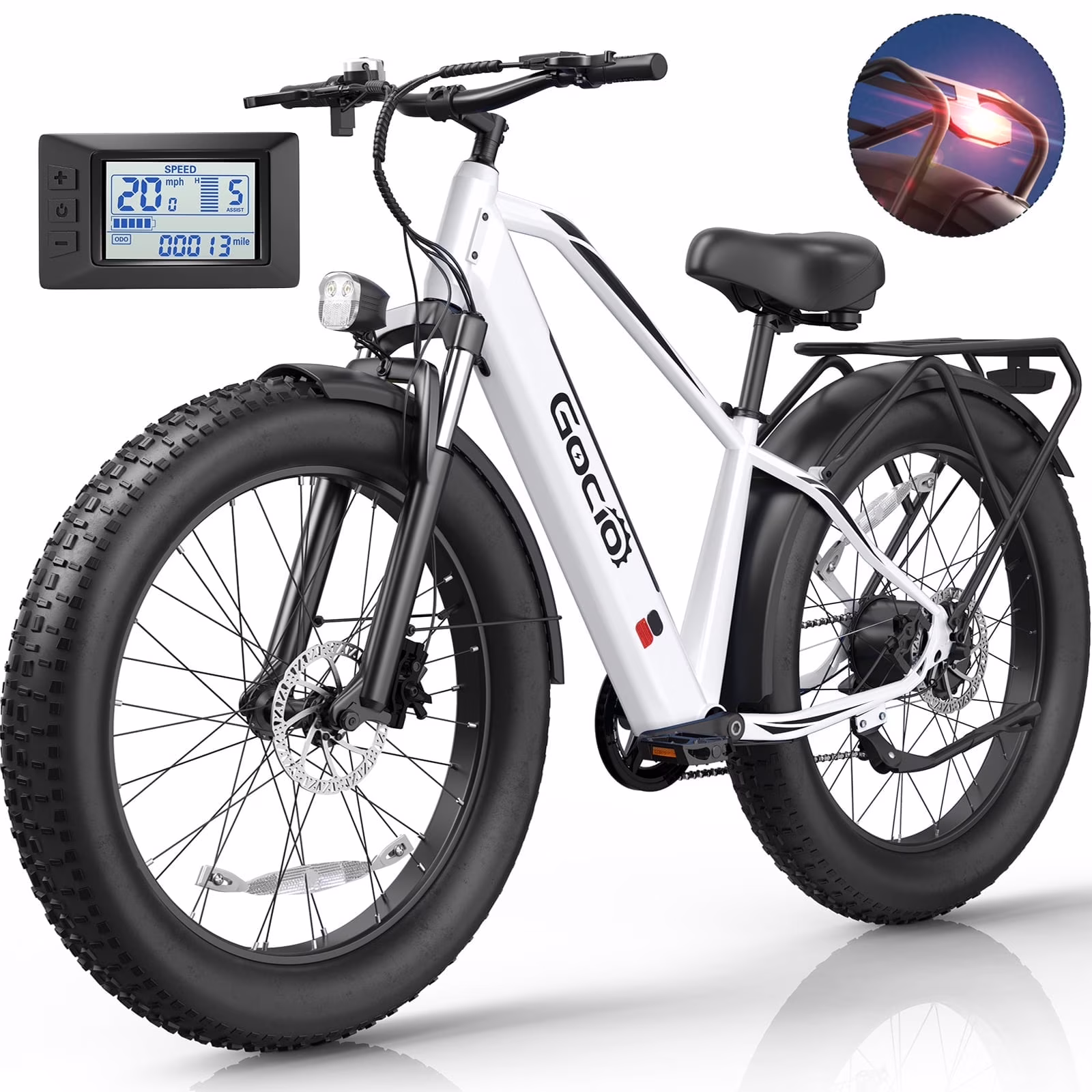 🚵♂️[INTELLIGENT BUTTON: LCD & HEADLIGHT & TAILLIGHT & HORN] The LCD of this fat tire electric bike 26 inch can clearly display the battery power, 5-speed gears, mileage, and speed on the screen, which is convenient for you to read the latest data during riding. There are separate headlights and horn buttons on the right handlebars. The headlight section has lights and the front reflector is brighter and wider lighting. The taillight part has brake taillight and rear reflector which can play a warning role. Headlight and taillight make you safer at night or in low visibility conditions. The electric horn is easy to operate and does not rely on manpower, and can continue to issue warning sounds, which is more convenient for your life.
