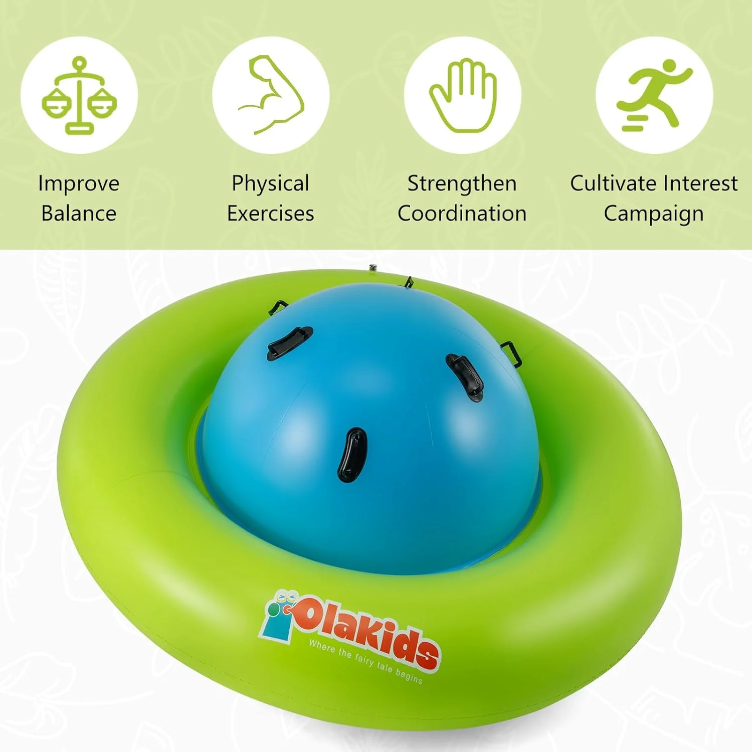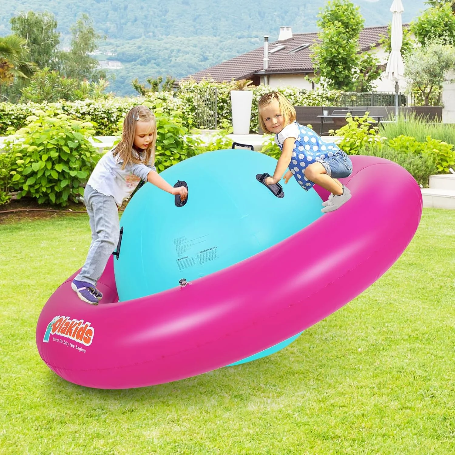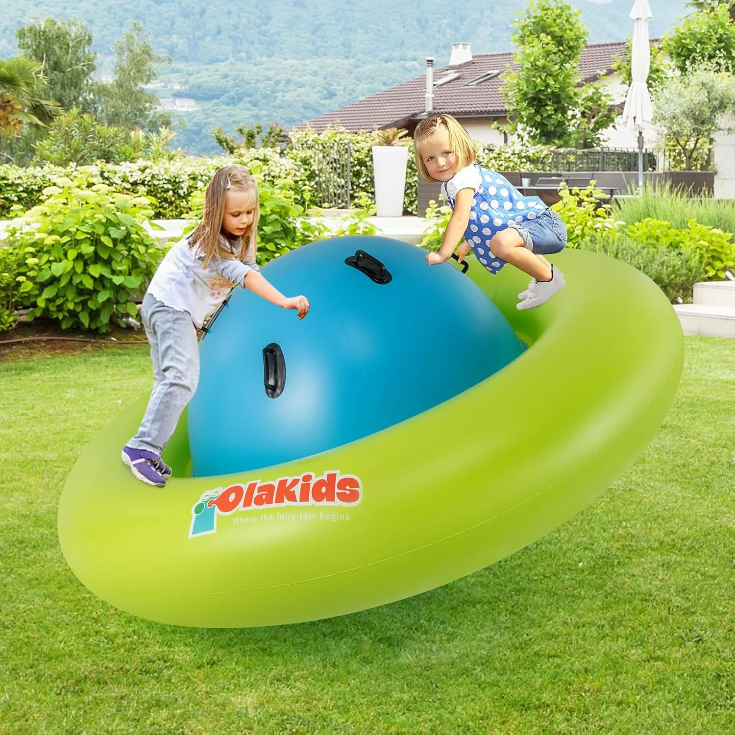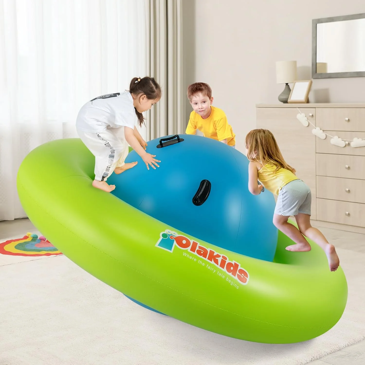 OLAKIDS inflatable dome rocker bouncer is made of high-quality PVC, which is puncture-resistant and waterproof to make sure that children can have fun with this inflatable seesaw for kids for a long time. This rocking ball can support up to 250lbs, and it is big enough for up to 3 kids age 5+ to play at the same time. The giant bubble seesaw for kids can be easily set up and take down by using 2 air valves. Please note that the air pump is not included in the package. This inflatable rocker teeter totter can be used in both indoor and outdoor space, such as playroom, yard, garden and playground.