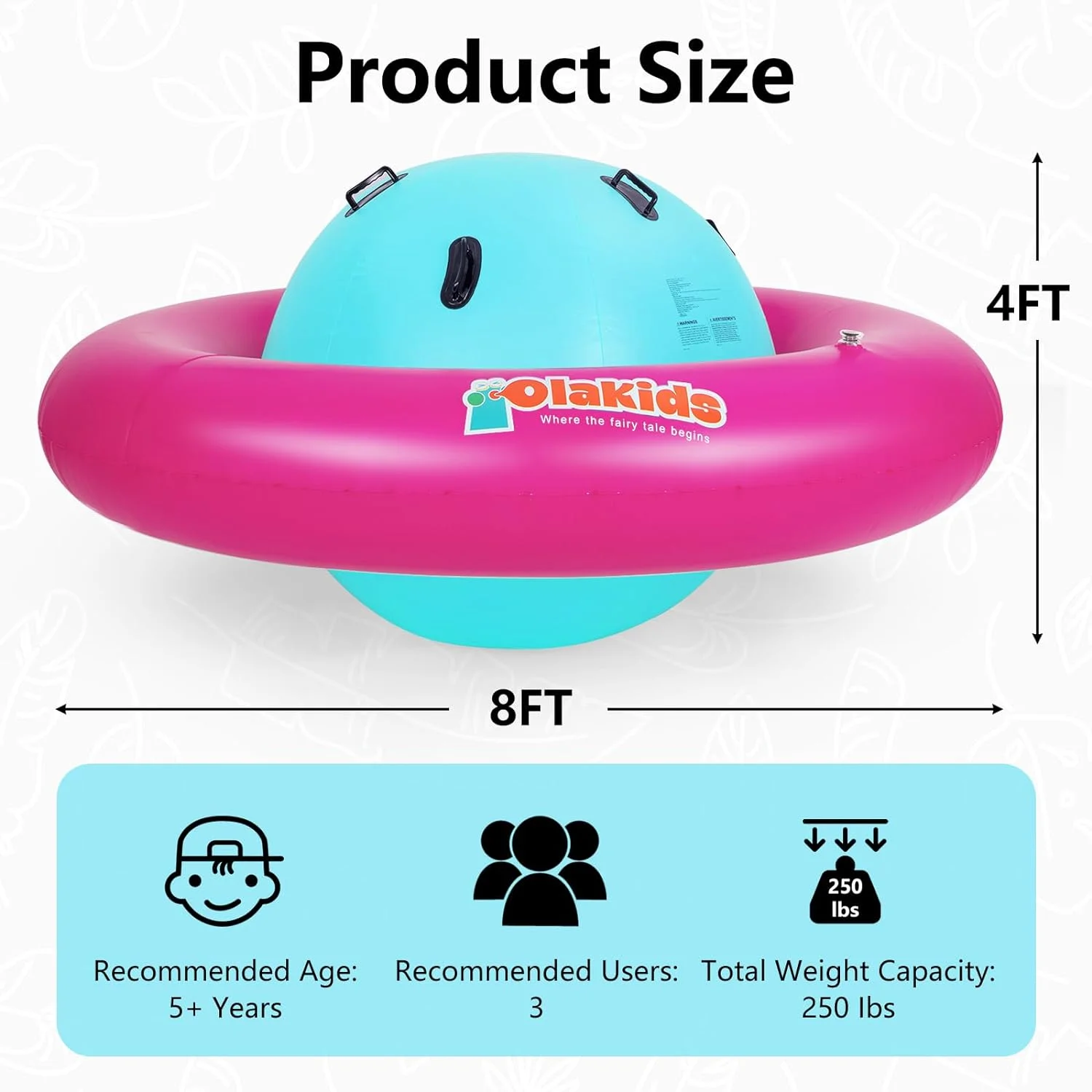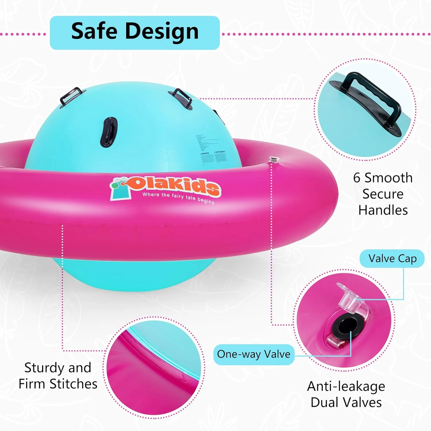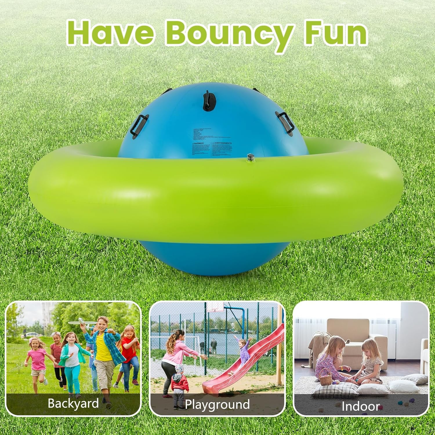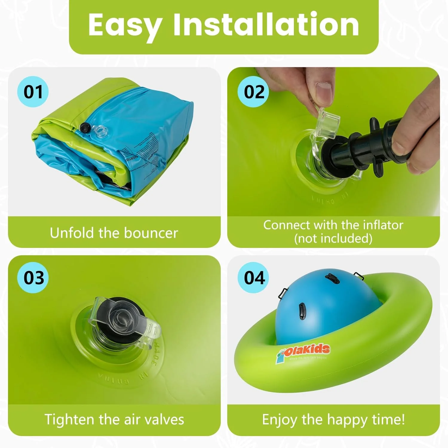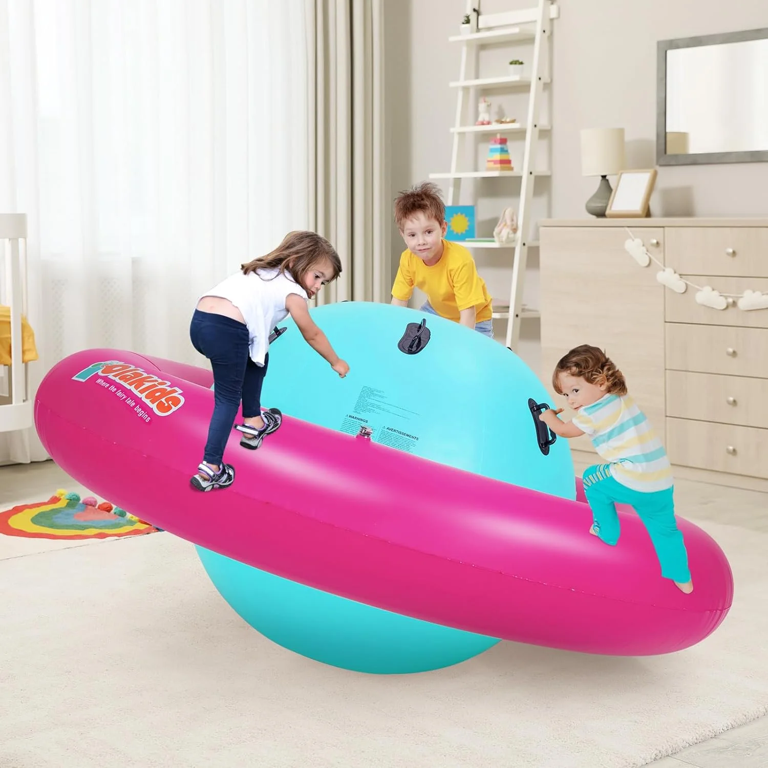 OLAKIDS inflatable dome rocker bouncer is made of high-quality PVC, which is puncture-resistant and waterproof to make sure that children can have fun with this inflatable seesaw for kids for a long time. This rocking ball can support up to 250lbs, and it is big enough for up to 3 kids age 5+ to play at the same time. The giant bubble seesaw for kids can be easily set up and take down by using 2 air valves. Please note that the air pump is not included in the package. This inflatable rocker teeter totter can be used in both indoor and outdoor space, such as playroom, yard, garden and playground.