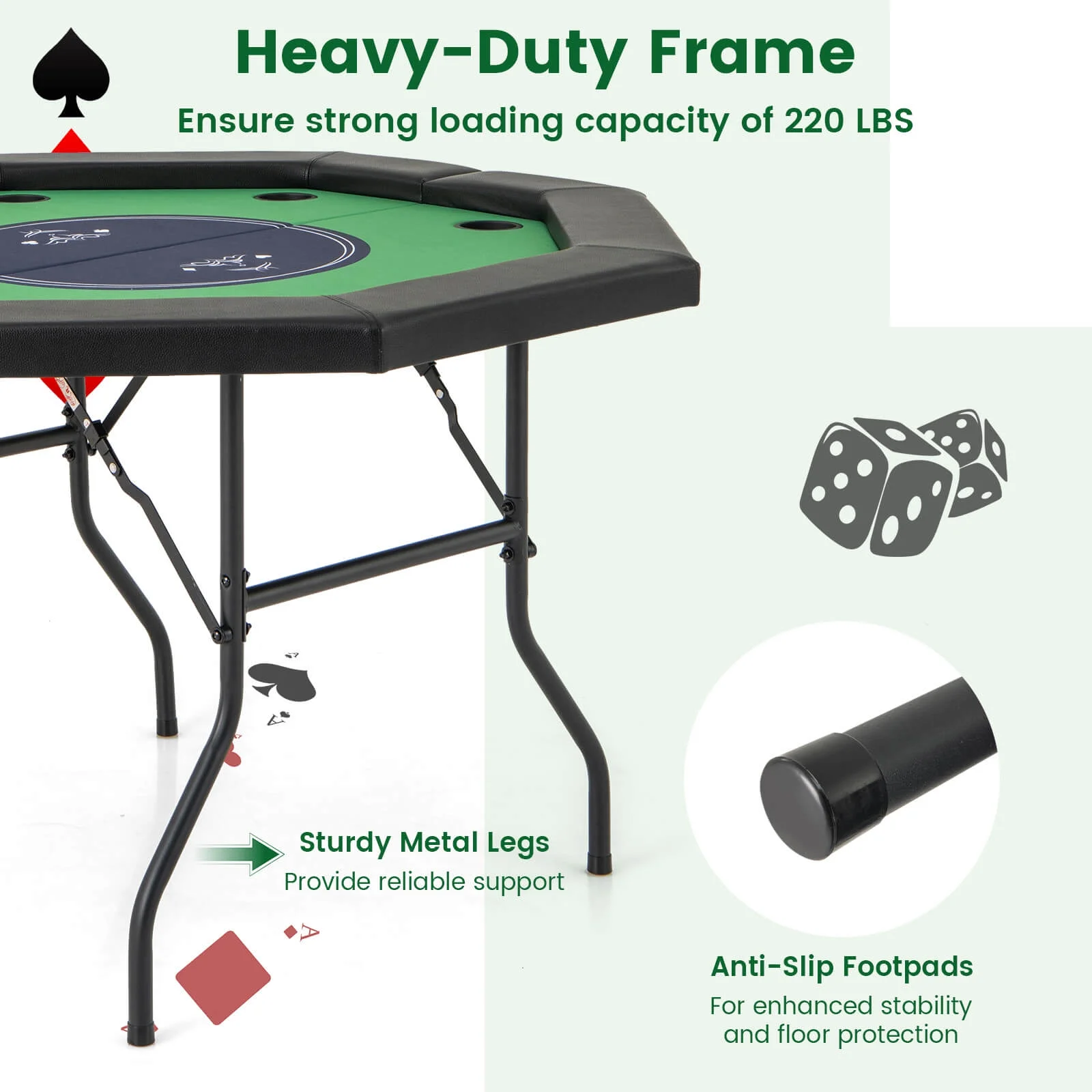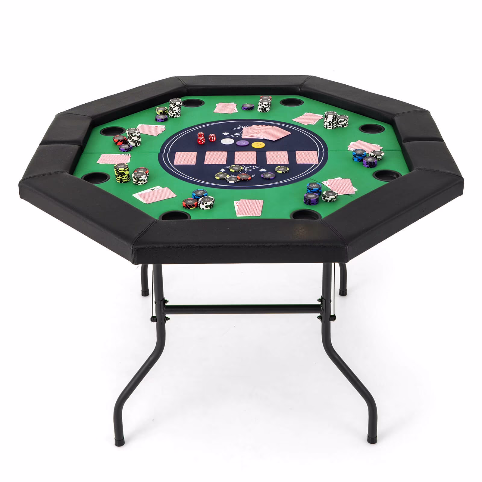 This 48"large poker table with sturdy metal legs provides ample room for up to 8 players, offering a perfect setting for hosting exciting Texas Hold’em showdowns, Blackjack challenges, and various other card games that guarantee endless fun and competition. When not in use, you can easily fold the table into a flat size, storing it in the closet, behind the door, under the bed, or in your vehicle. Thus, you can bring the gaming excitement wherever you go. To enhance comfort and gaming experience, the poker table is equipped with a soft padded armrest for comfortable support, and 8 cup holders for conveniently and safely keep drinks. Besides, the premium casino-grade felt surface completes the professional look, providing a smooth playing area and reducing noise from card shuffling.