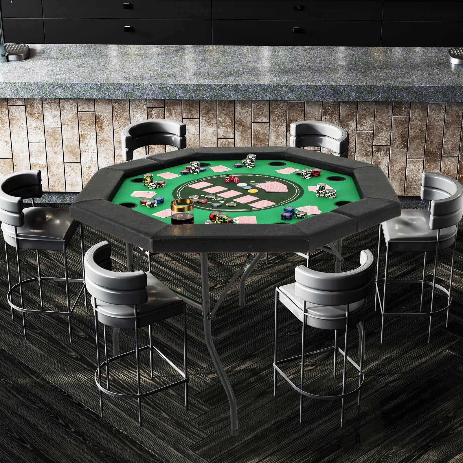 - 48" Spacious Poker Table: This octagon casino table measures 48" x 48" x 30" (L x W x H), which could comfortably accommodate 6-8 players. It is the perfect companion for a range of card games, such as Texas Hold'em, Blackjack, Bridge, Five Card Stud, etc.