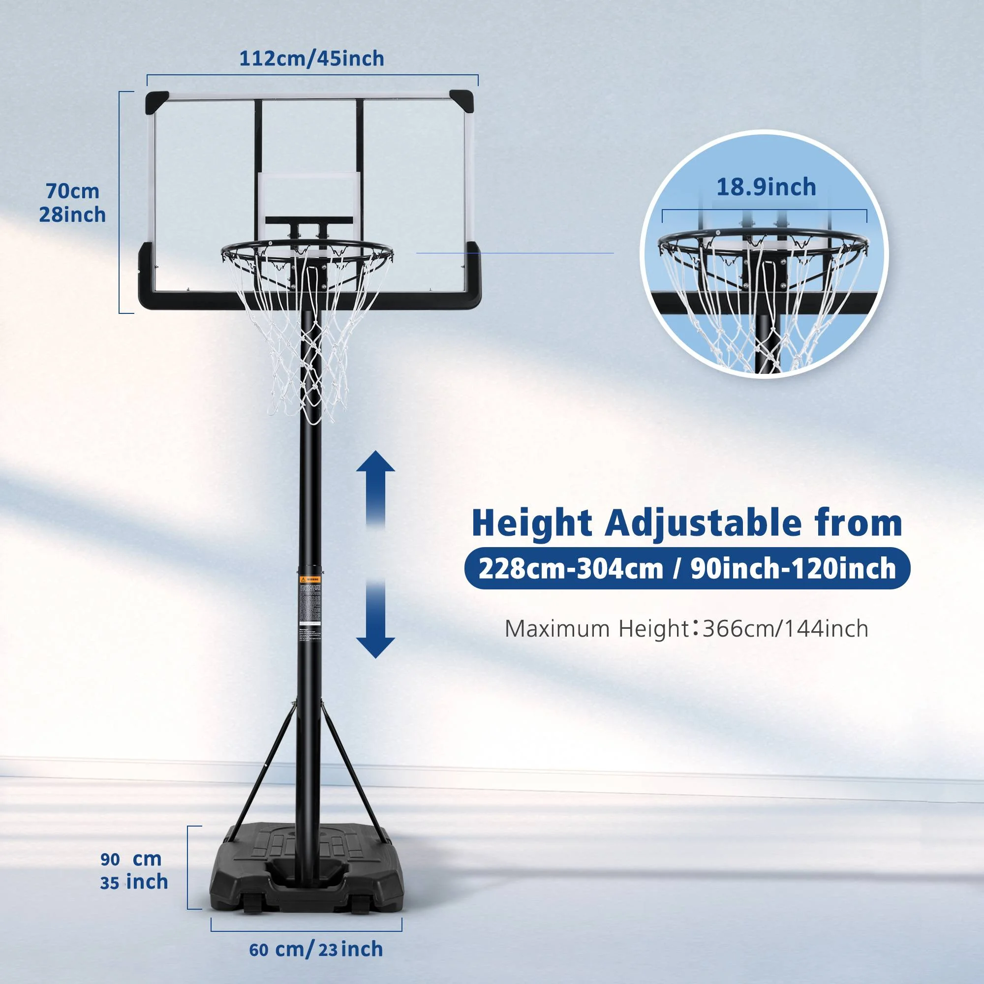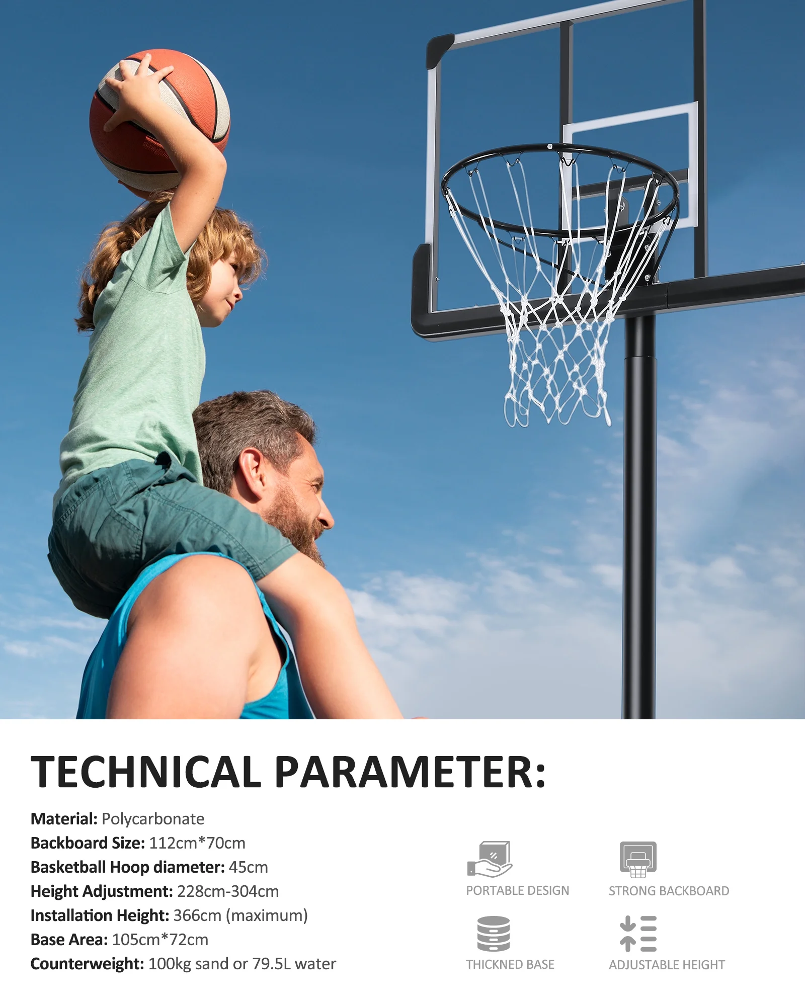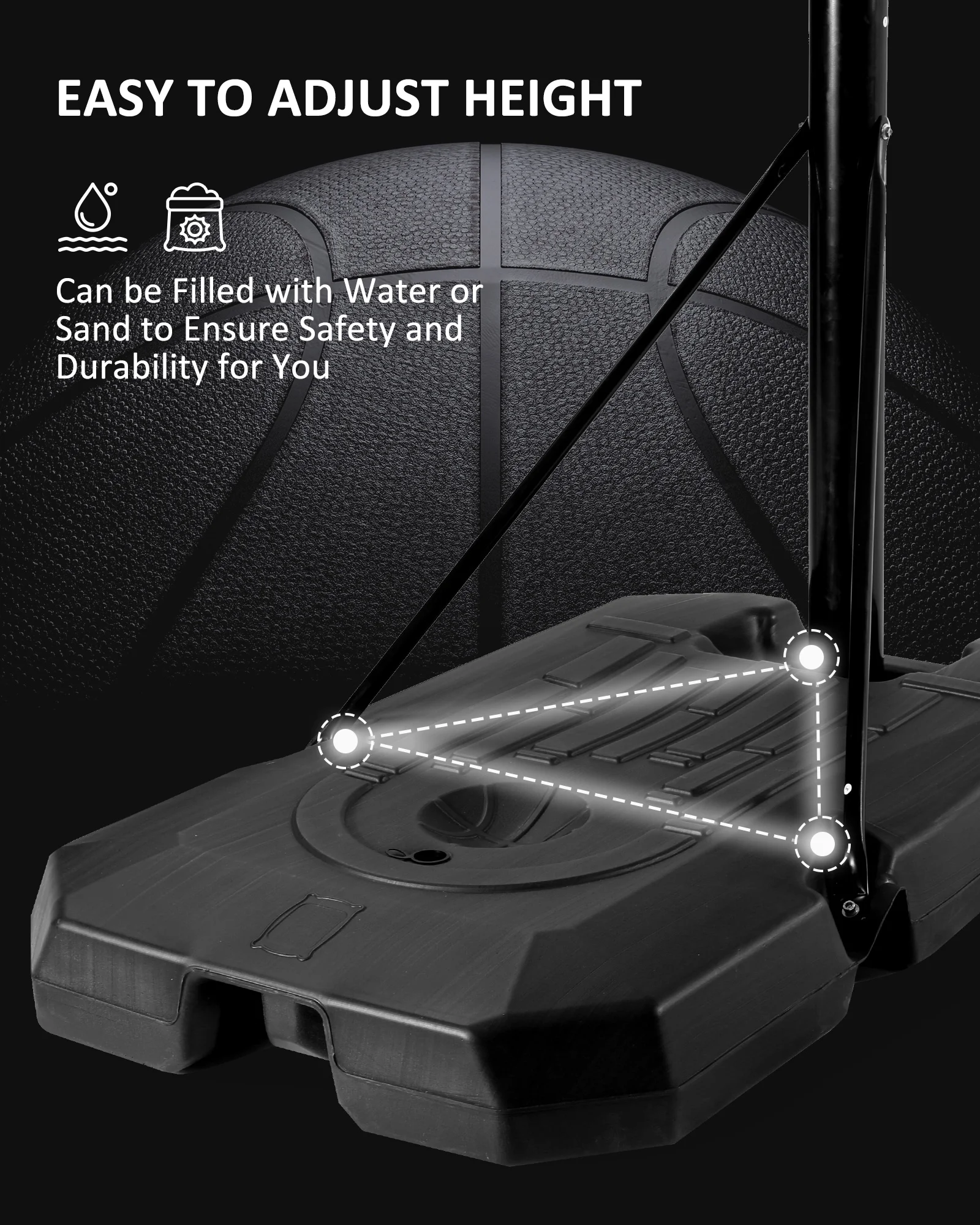 - 🏀Featuring triangular support poles and a large basketball base, this basketball hoop offers unrivalled stability. The basketball goal’s base can be filled with 80kg of water or 100kg of sand to further enhance its wind resistance and load bearing capacity. Whether you are outdoors or indoors, you can be sure that the basketball hoop will be stable, allowing you to enjoy the fun of basketball to the fullest.