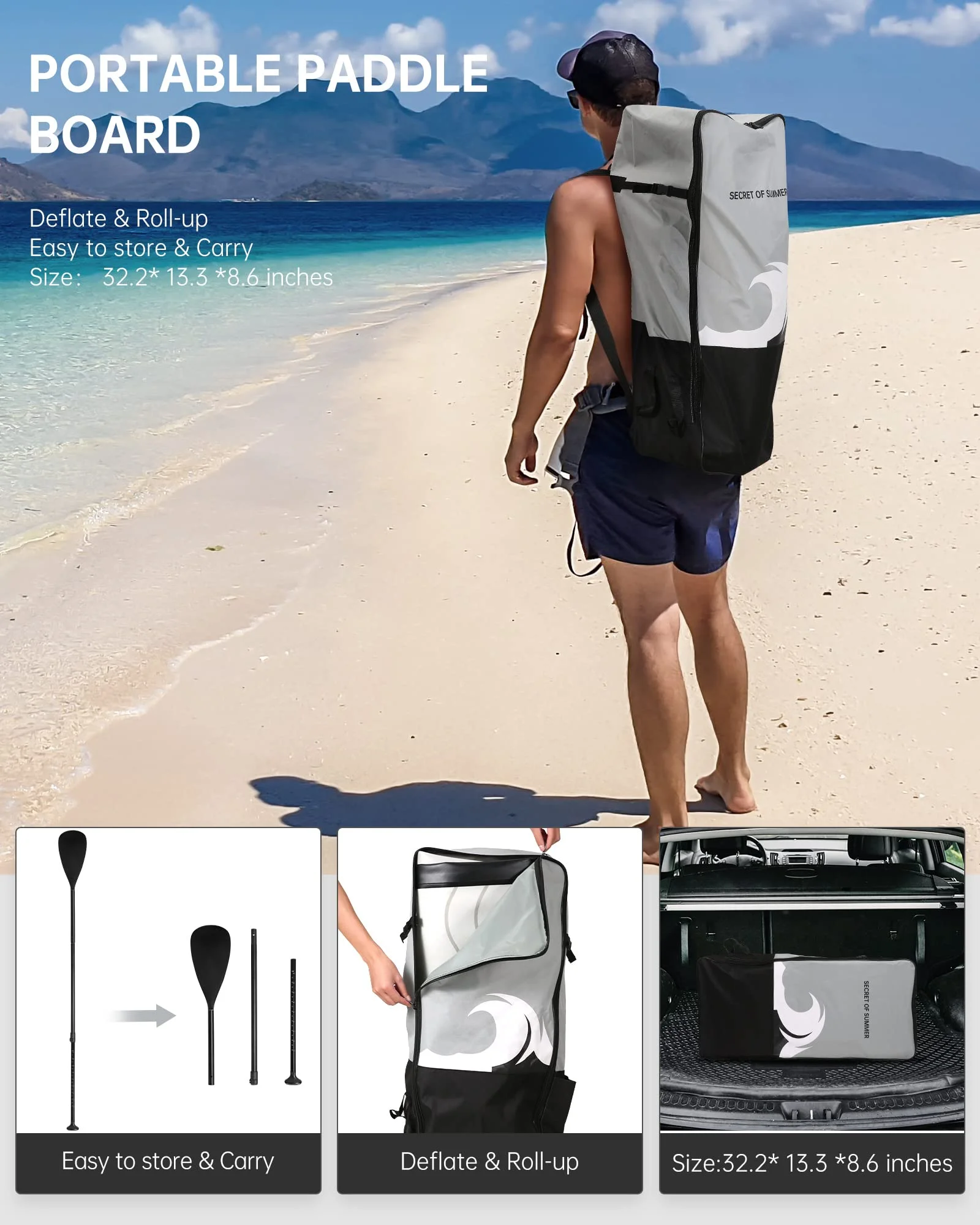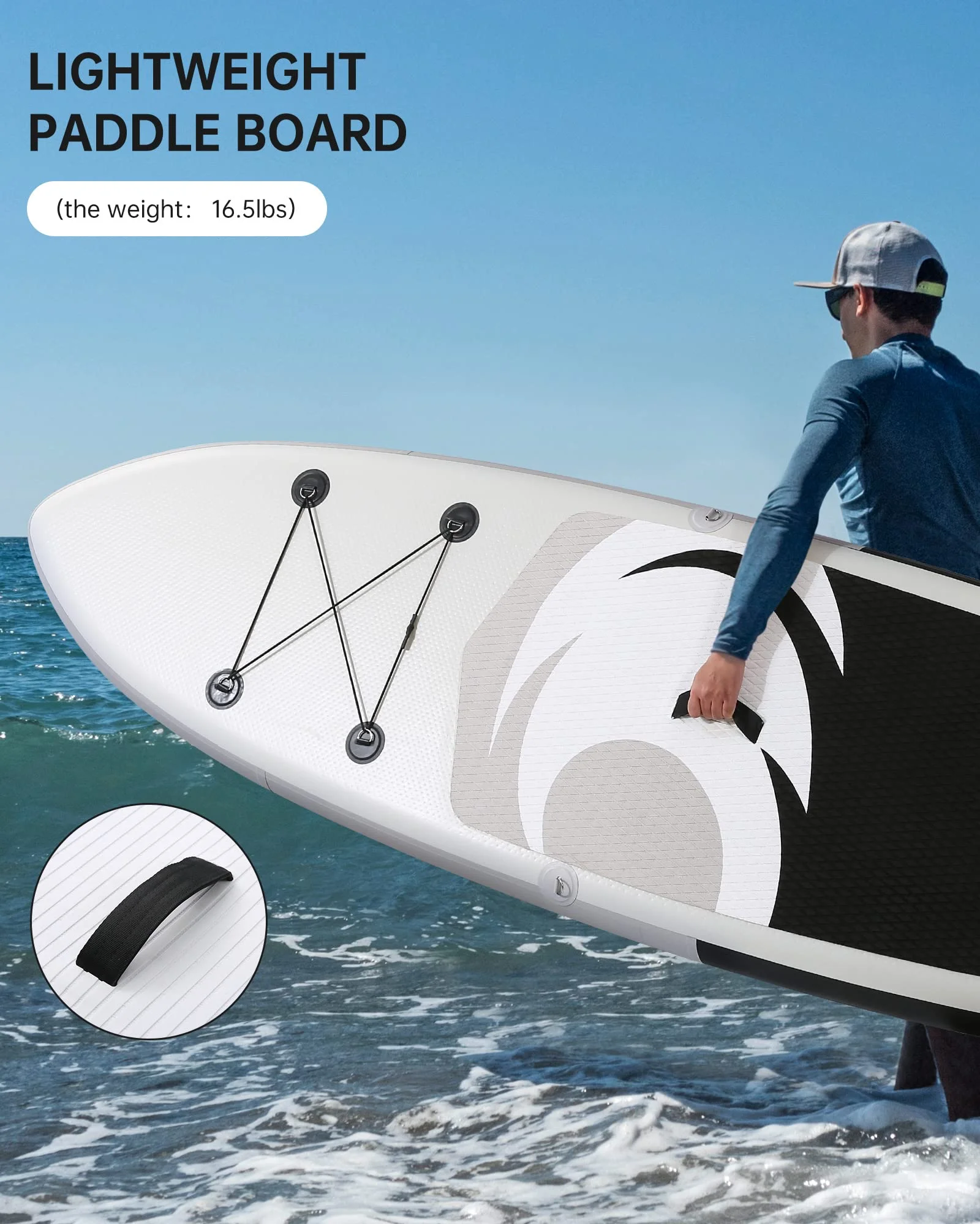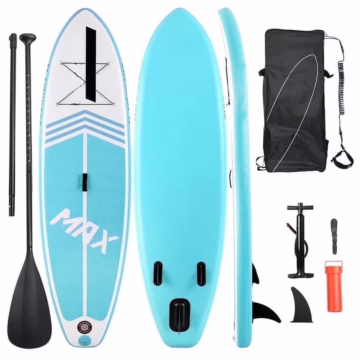 - The paddle board is portable even when the board is fully inflated as the paddle board is equipped a carry handle. The inflatable paddle board comes with a large size backpack, you can roll the deflated paddle board into the backpack and move or store the inflatable paddle board conveniently. Additionally, the pump, adjustable Aluminum paddle, travel backpack, coil leash, repair kit are included.