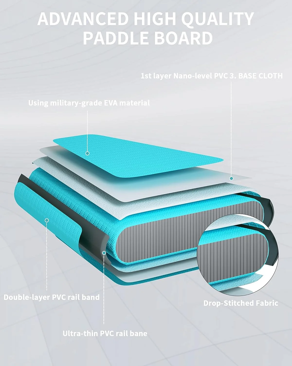 - Sizes of the inflatable paddle board is 10'6”(L)*32”(W)*6”(T). The paddle board is consists of thickened PVC and high-strength double-layered drop-stitch materials, having a large weight capacity of 370 lbs (1-2 persons).32”extra width of inflatable paddle board provide extra stability. And the double PVC layers ensure extra durability and sturdiness of the paddle board.