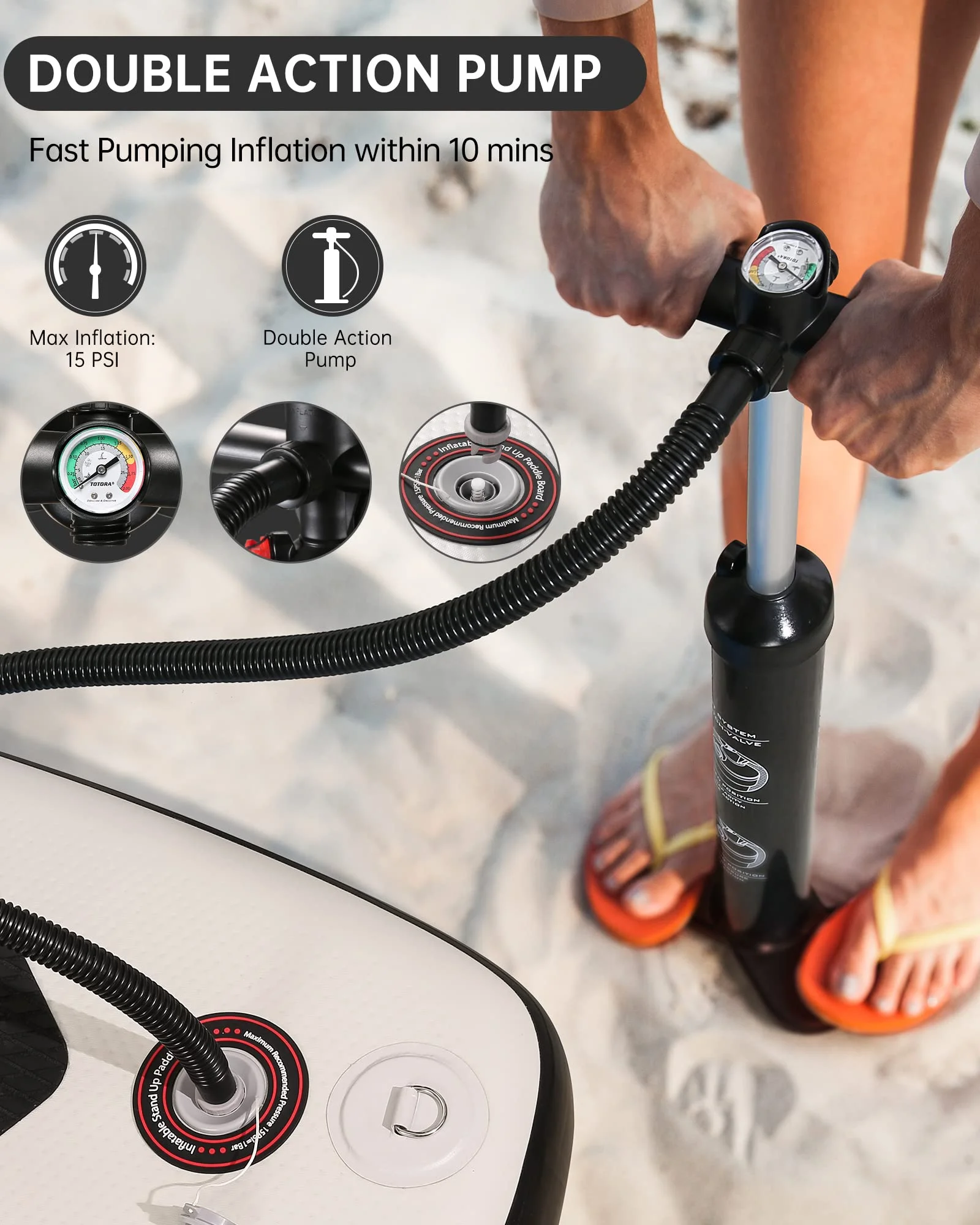 - Dual chambers pump, 100% faster and 50% easier to easily inflate the paddle board up to 15 PSI. The average pumping time of inflatable paddle board is only needs 5 -10 minutes. The efficiency is twice that of ordinary pumps of inflatable paddle board.