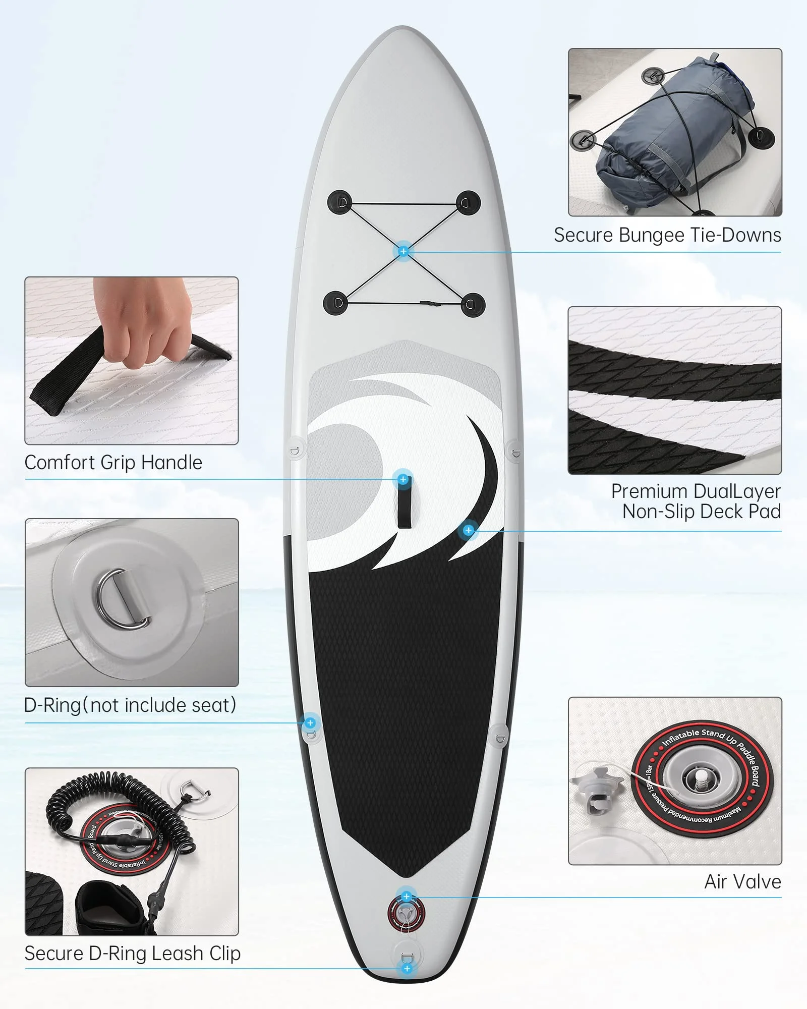 Inflatable stand up paddle board is great for all skill levels with a dimension of 10'6" (L) * 32" (W) * 6" (T). The extra-long & think design makes the inflatable paddle board is stable for all sorts of watery fun: SUP board fitness, long-distance rowing, inflatable stand up Yoga, inflatable SUP stand up paddle board puppy, inflatable SUP board fishing and more. It is easy to keep balance on this paddle board.