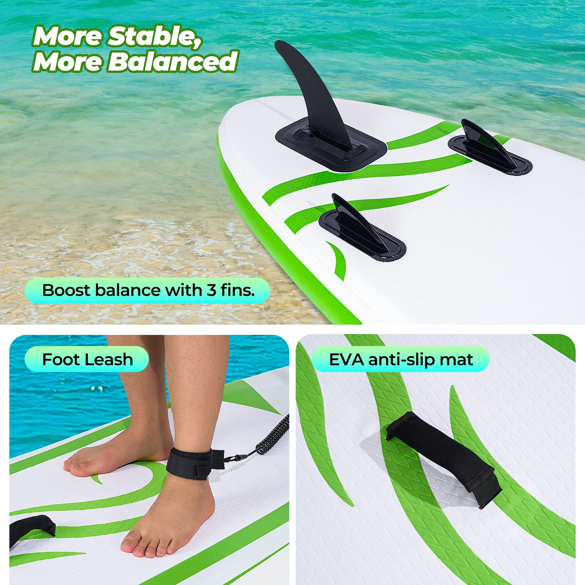 - Feel confident carving through currents with our 2+1 paddle board fin configuration, designed to lock in balance during sharp turns while maintaining effortless maneuverability. The stand up paddle board deck grips your feet like natural terrain, even when wet, ensuring steady footing for dynamic movements. Perfect for mastering new skills or tackling unpredictable waters.