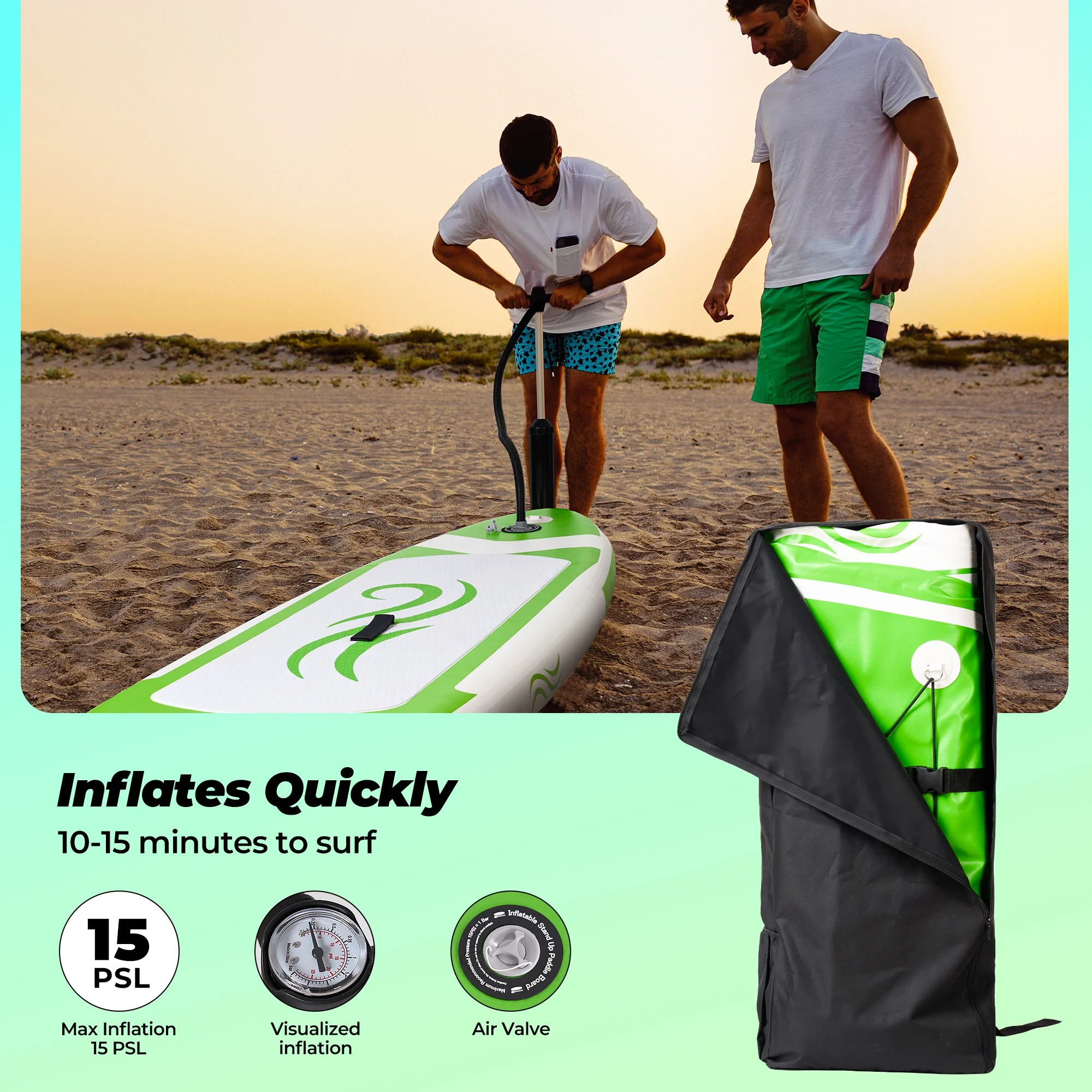 - Get adventure-ready in under 15 minutes with our paddle pump, engineered to save time. The paddle board pump pressure gauge ensures effortless visibility,so you’ll never risk under- or over-inflating. Spend less time pumping board and more time gliding across the water with confidence.